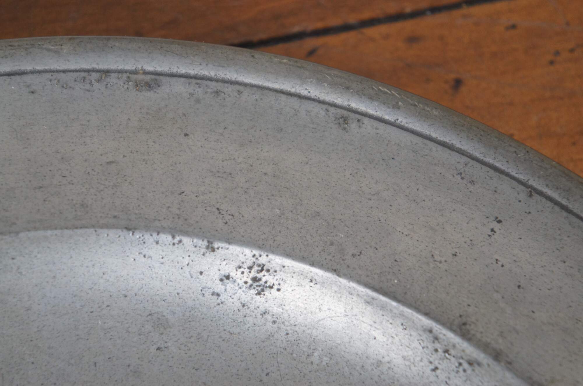 Late 18th early 19th century English Continental pewter charger / serving plate by Townsend & Compton (Thomas & Townsend Compton) of London. Round shape with recessed center and plain rim.