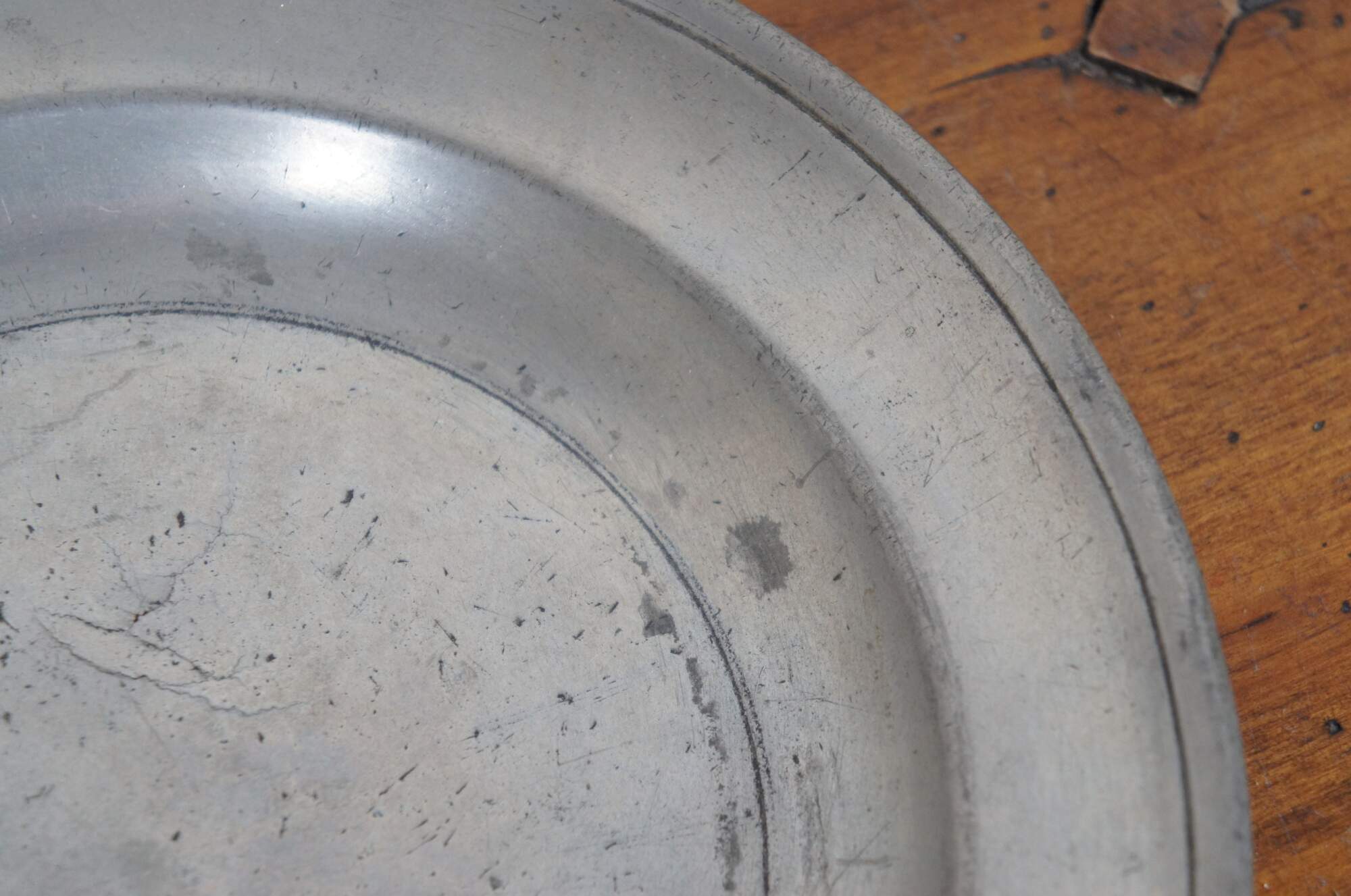 Pair of circa late 18th century pewter dinner plates. One with the touchmarks of Samuel Smith (circa 1727-1761). The deeper plate apppears to have had a mark near the crack, but it has since worn away.