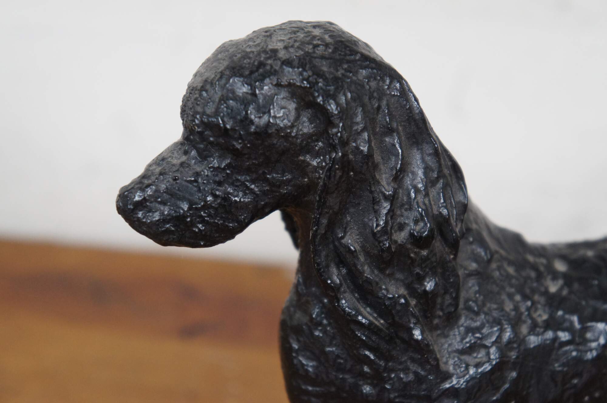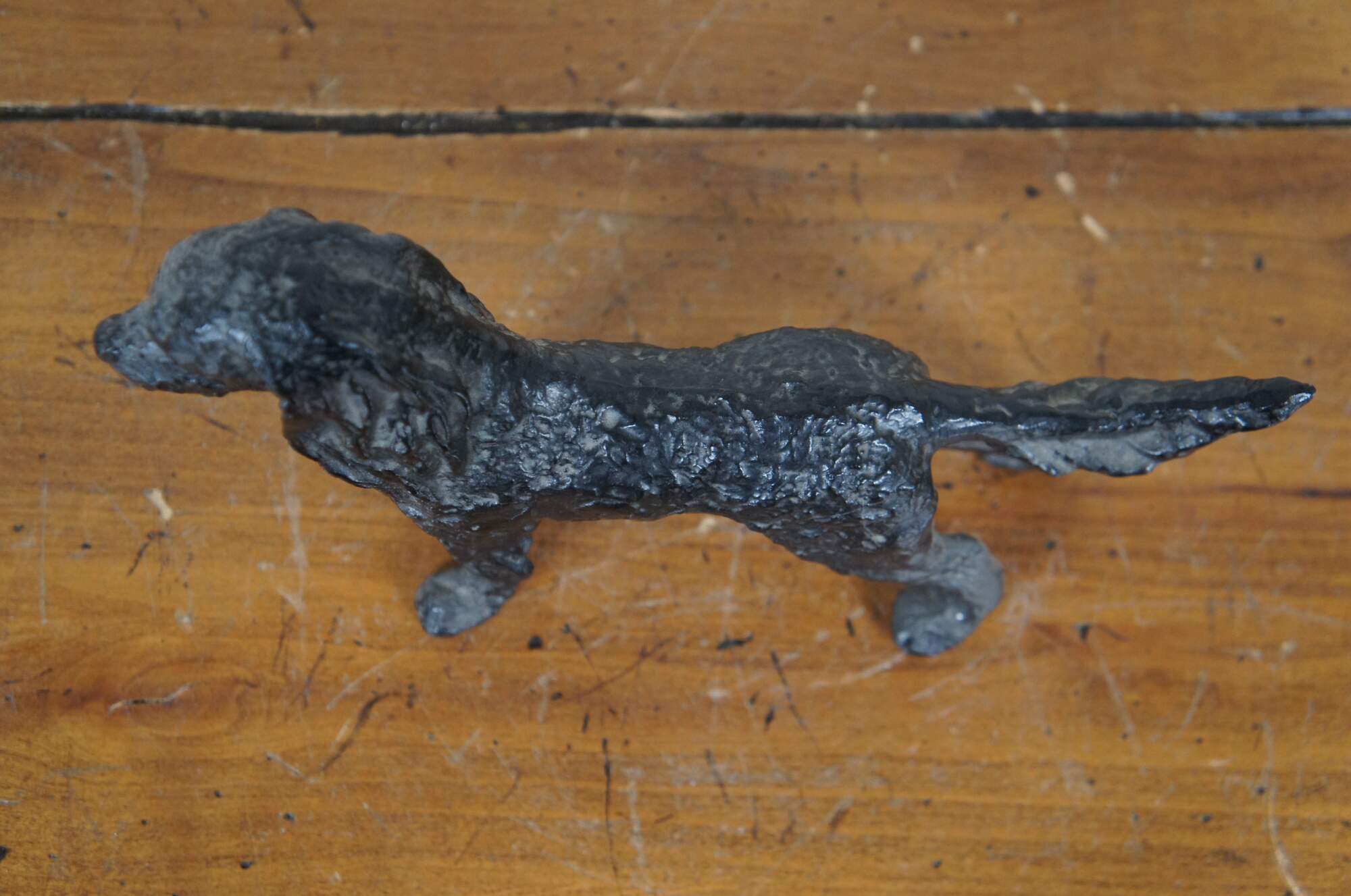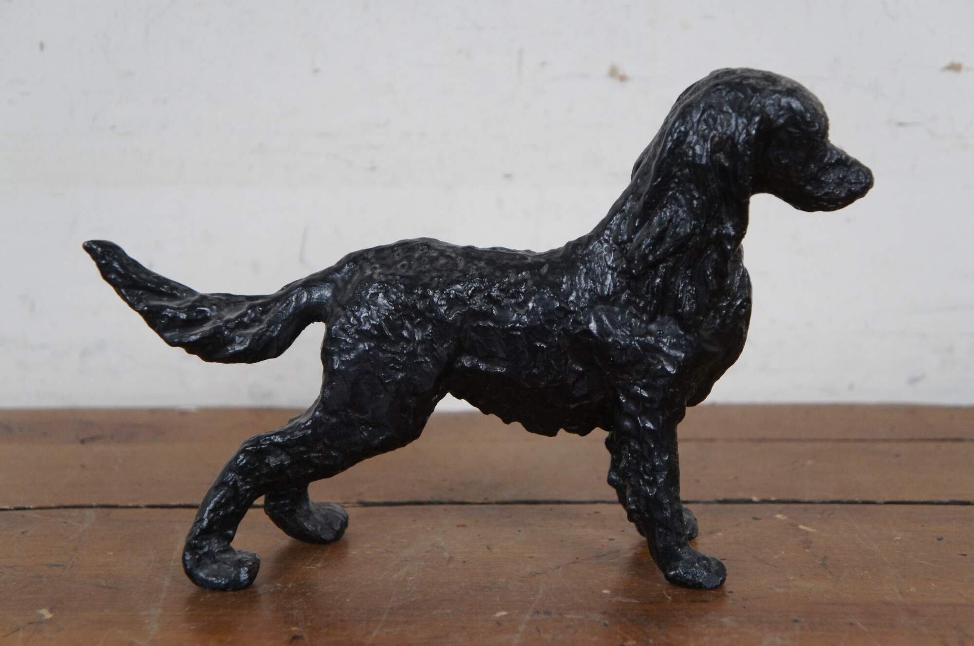 Vintage cast hollow metal dog figurine / sculpture in the shape of a variety of spaniel / setter / retriever. Colored to resemble iron or darkened bronze.