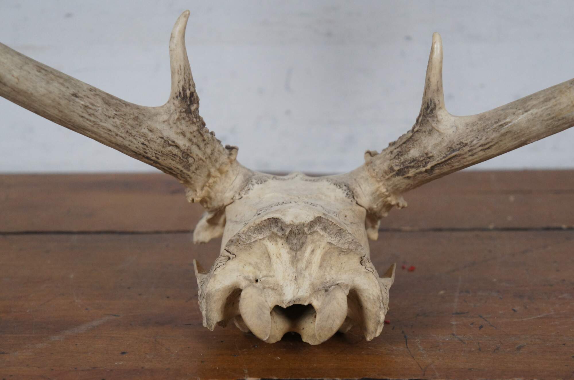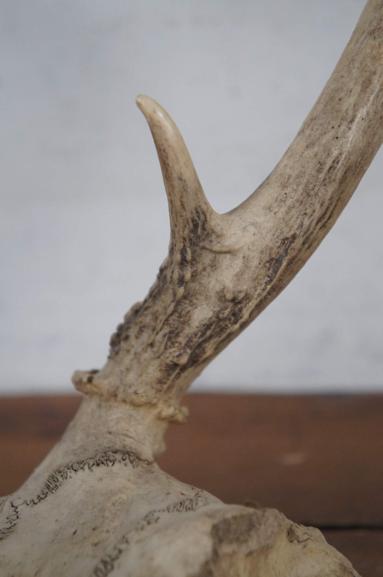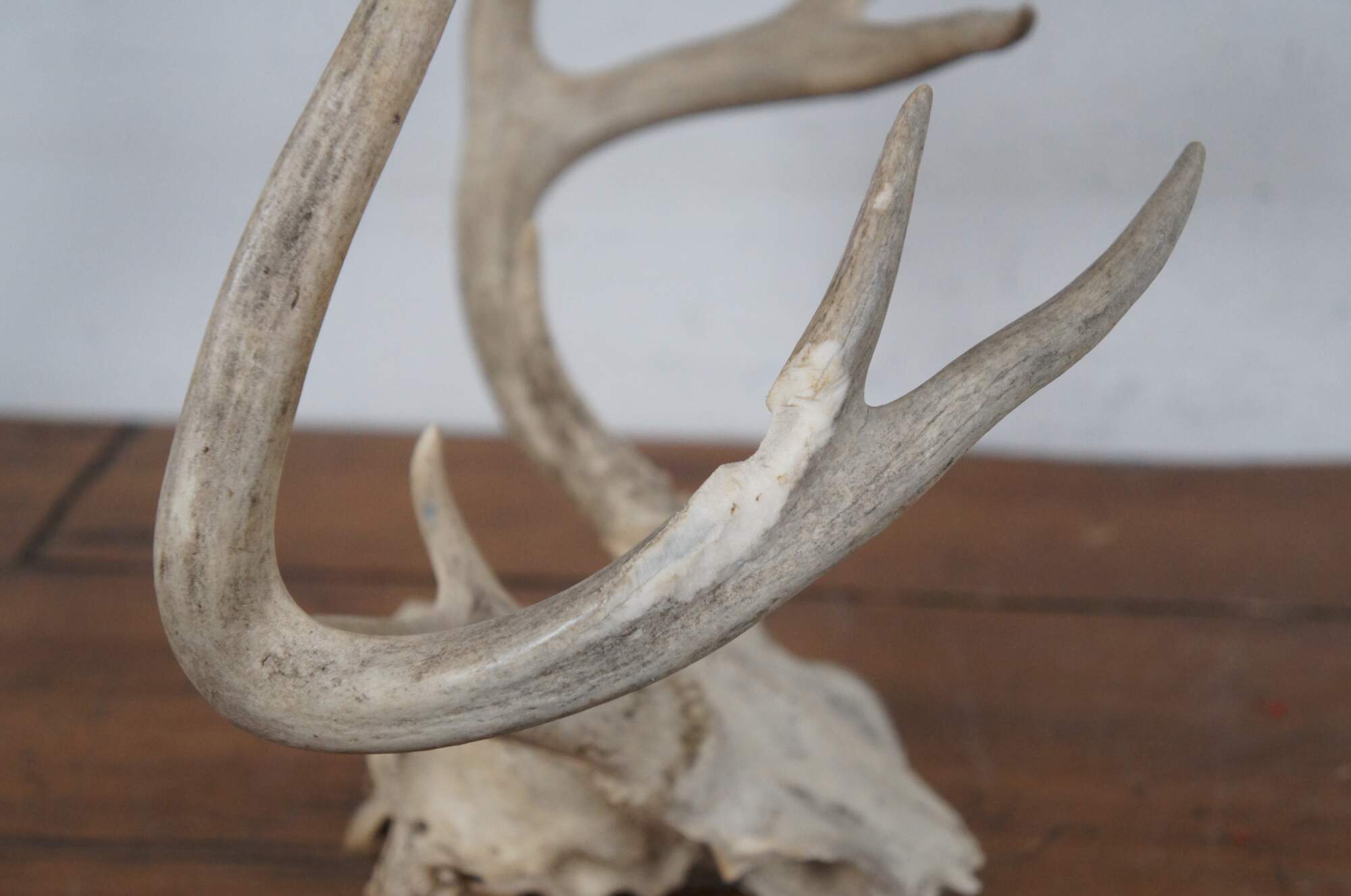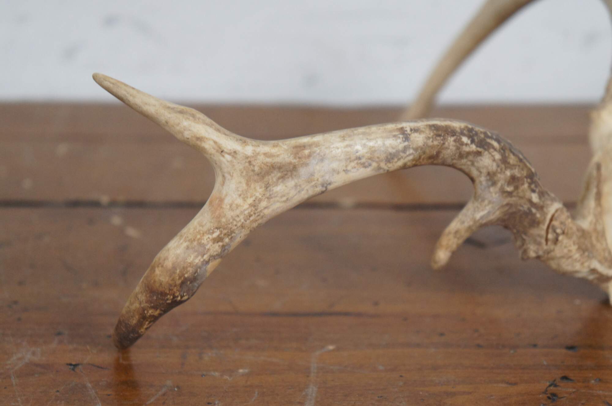 Pair of 20th century whitetail deer antlers and skull caps - larger features 8 points and a larger portion of skull. smaller features four points and a small section of skull.