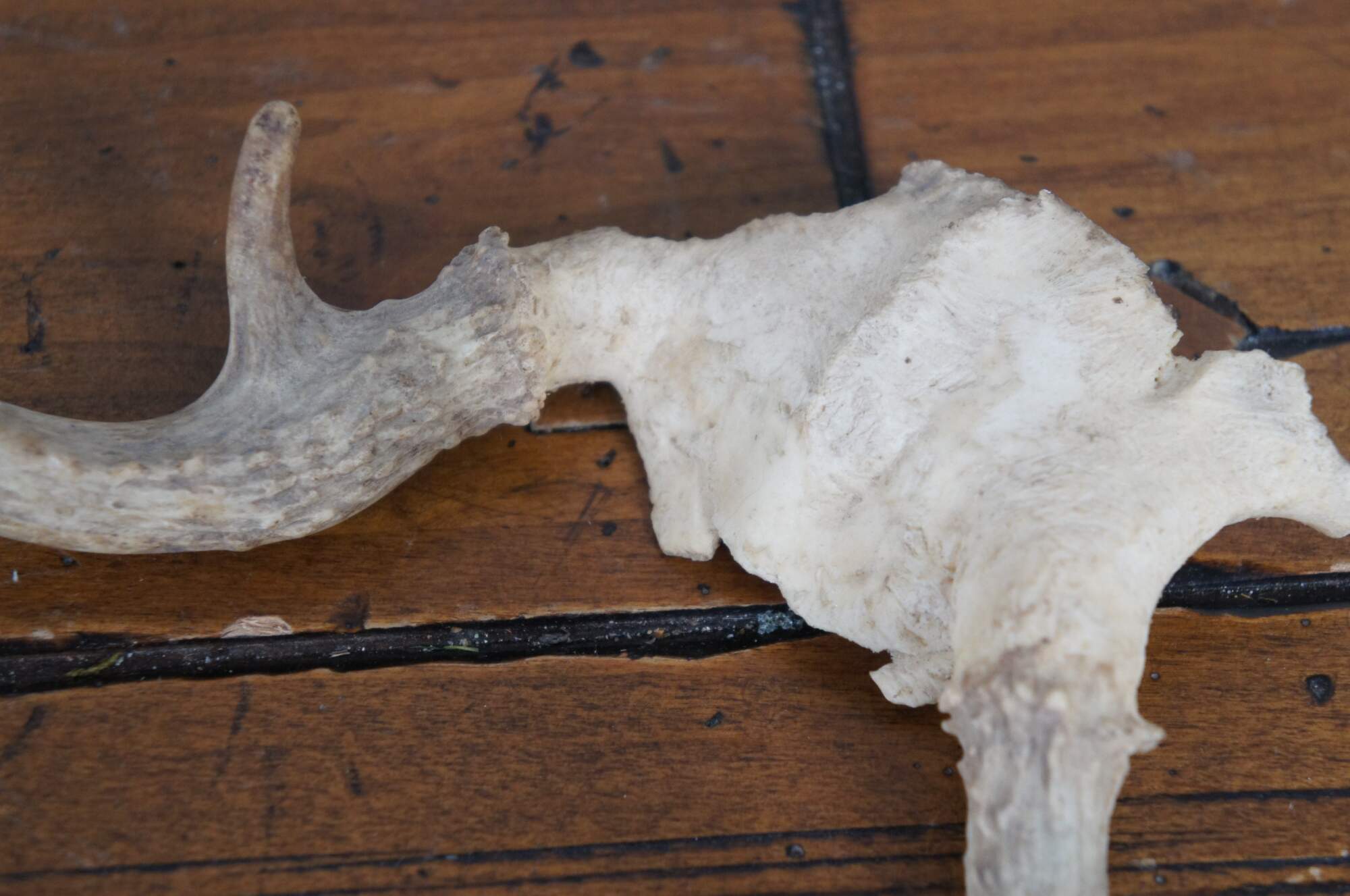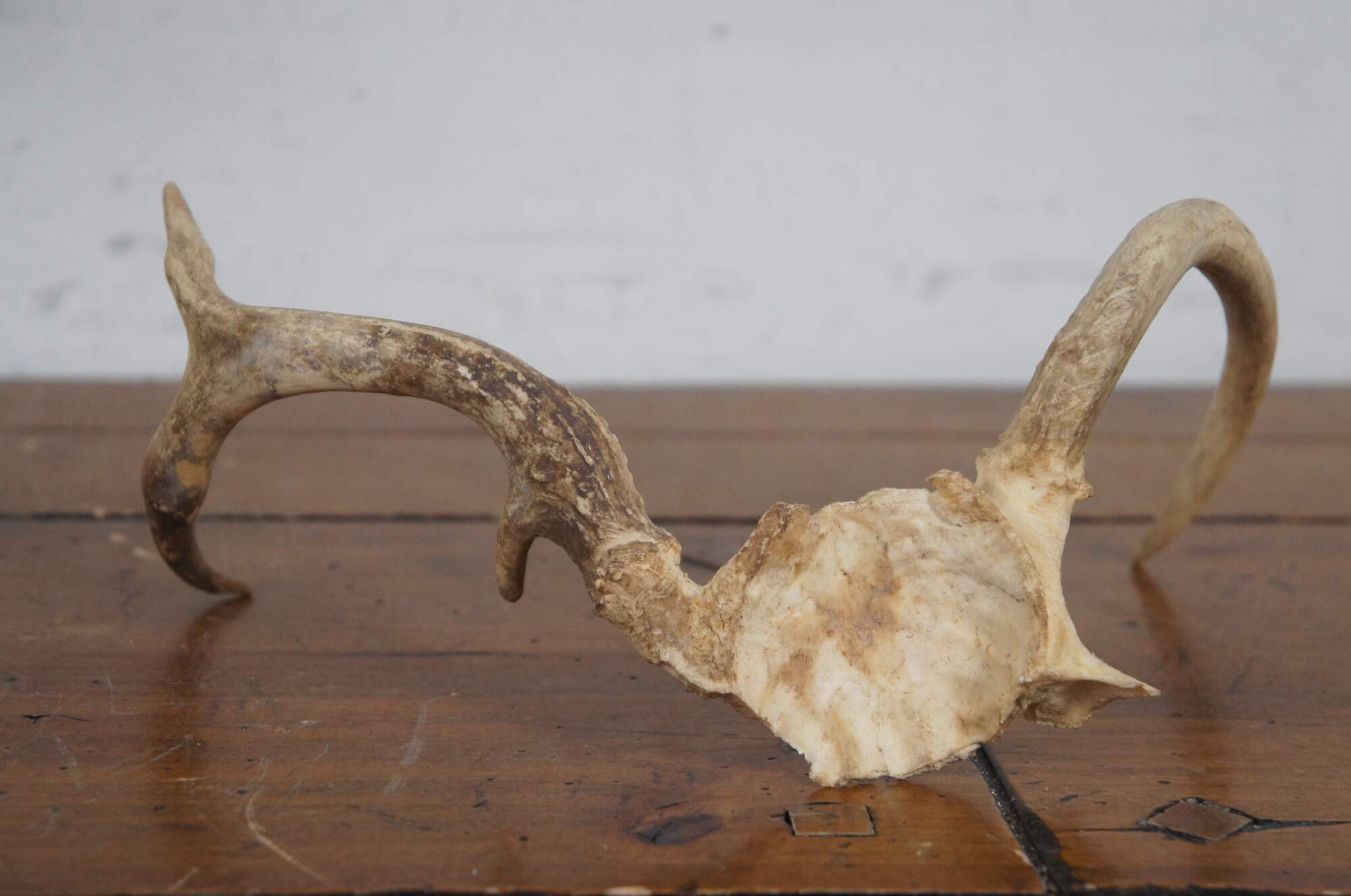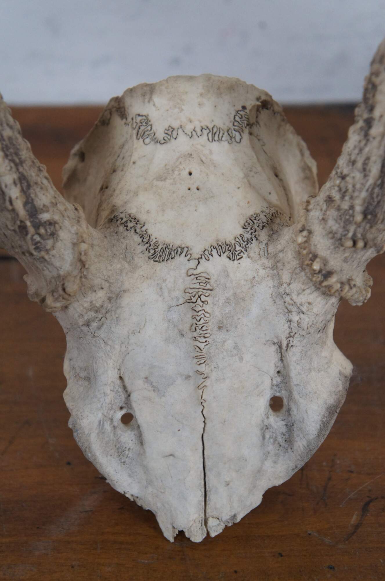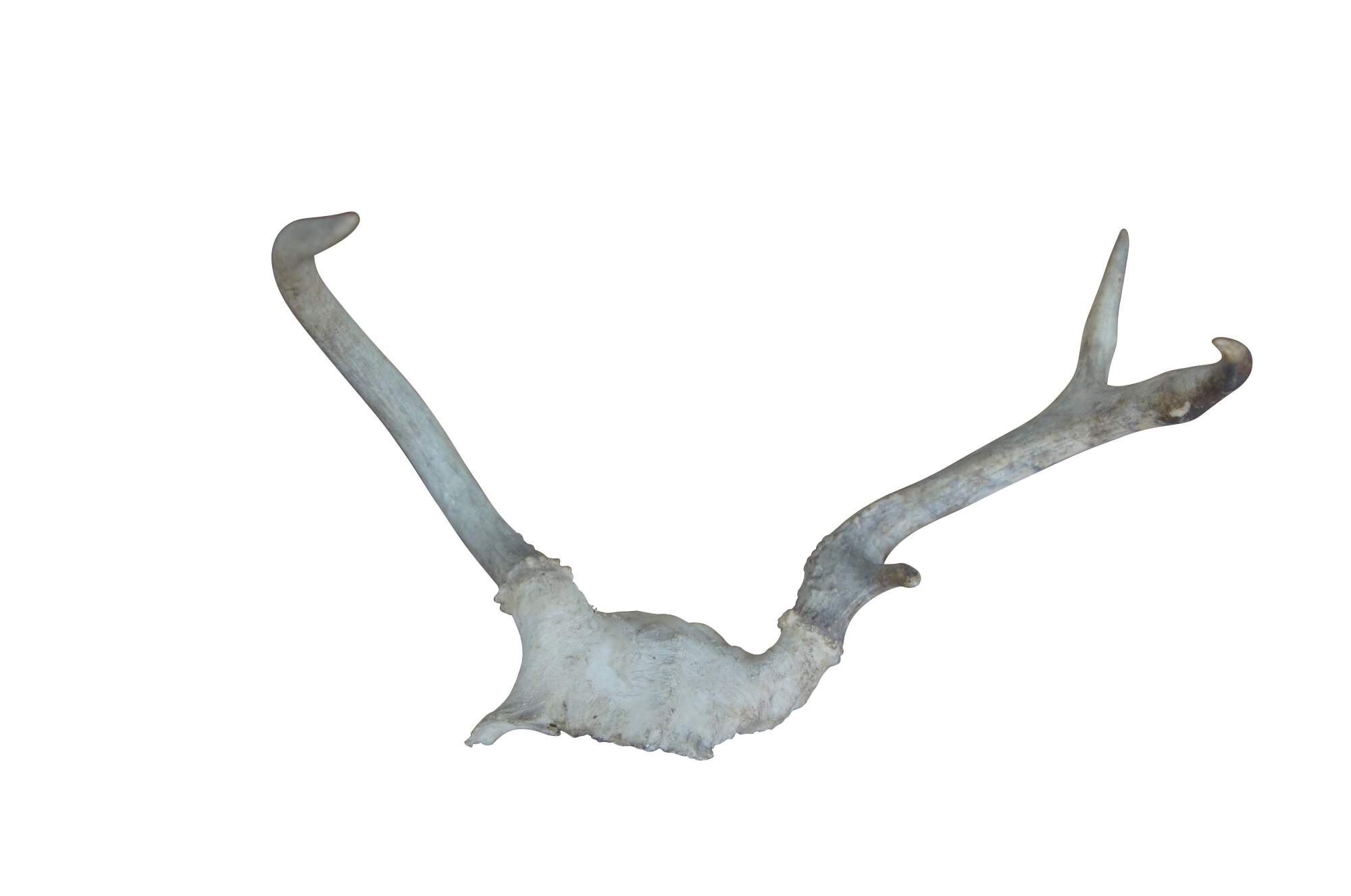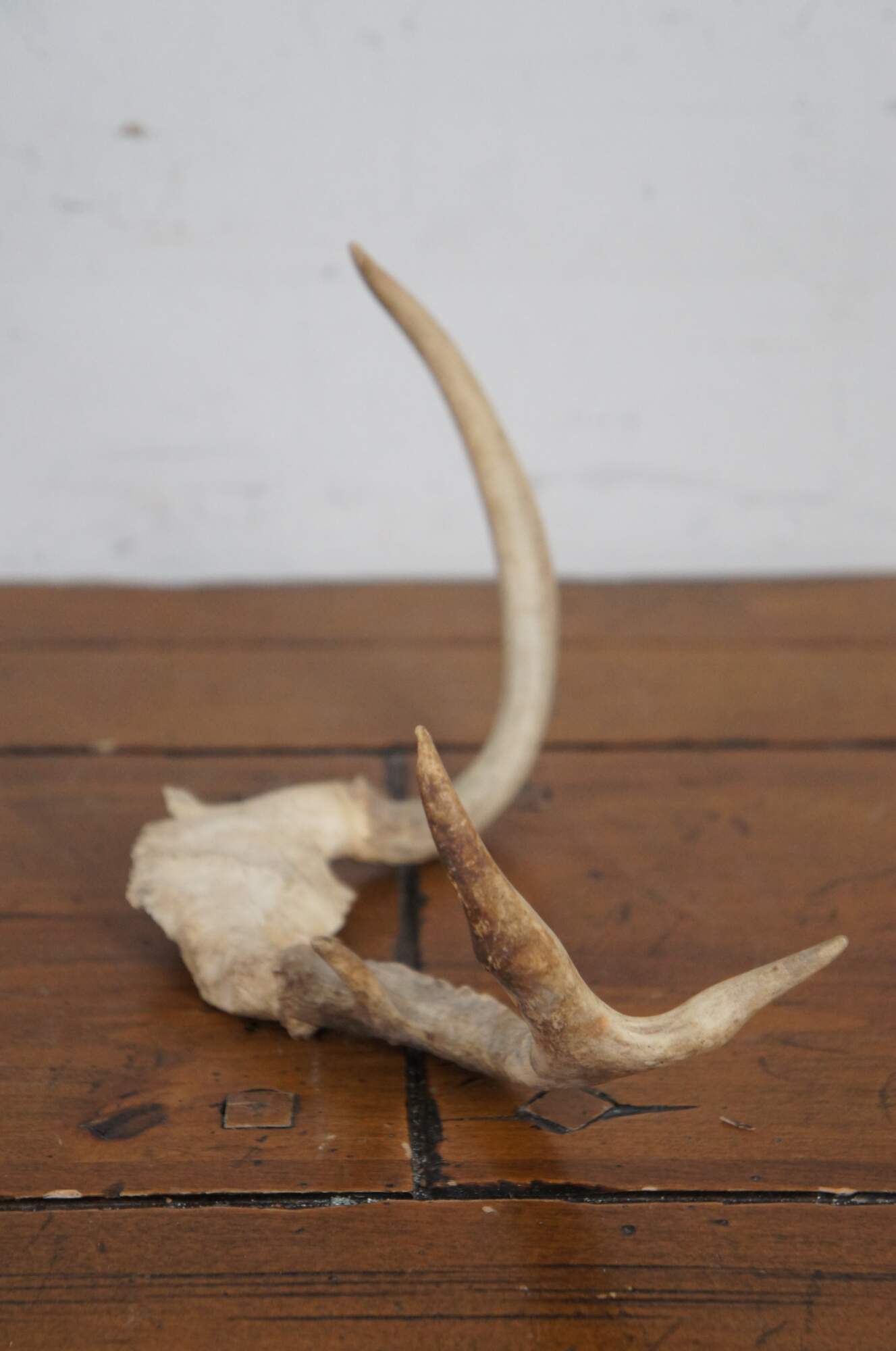 Pair of 20th century whitetail deer antlers and skull caps - larger features 8 points and a larger portion of skull. smaller features four points and a small section of skull.