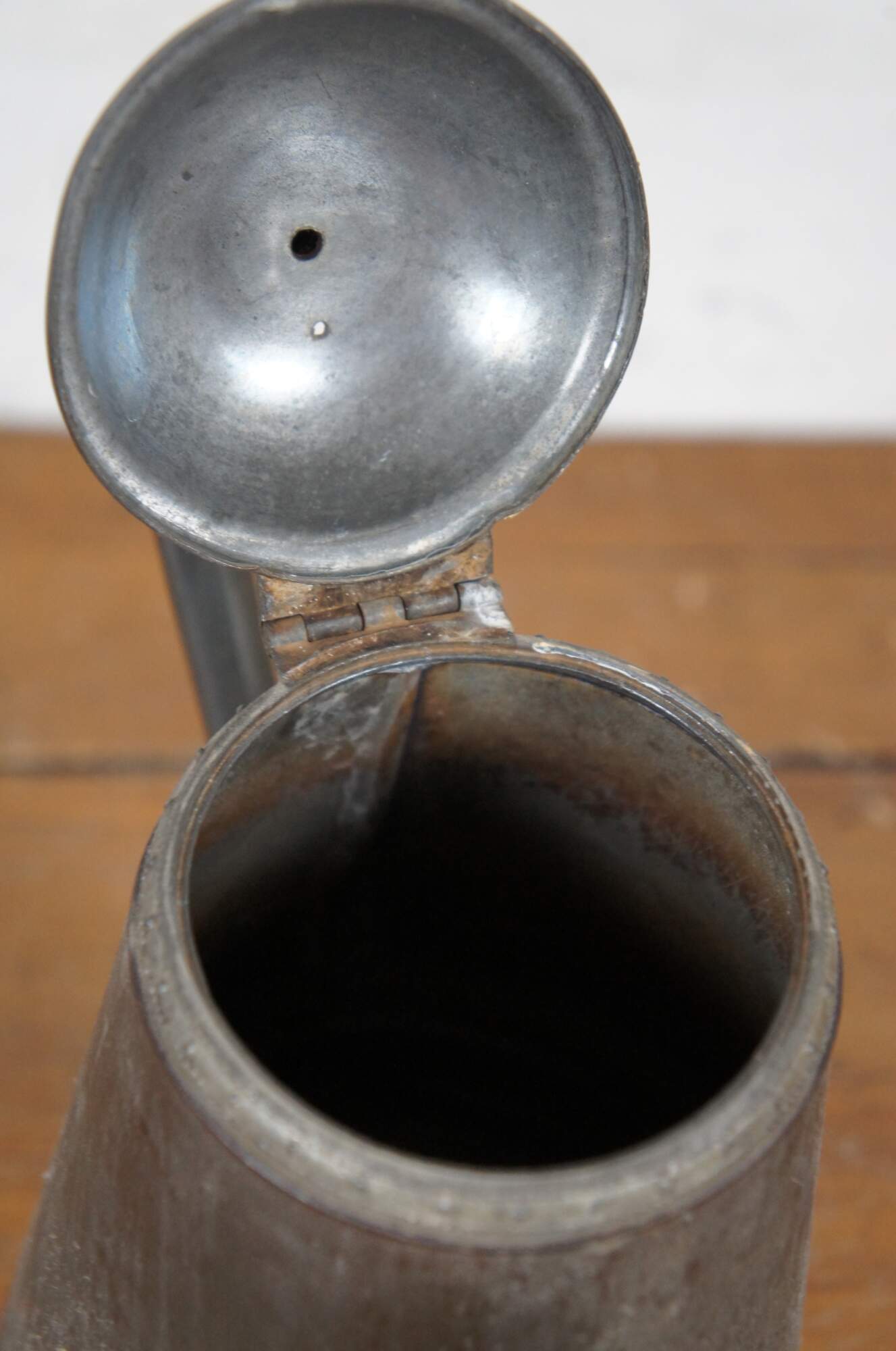 Antique pewter tea / coffee pot / kettle with a tapering cylindrical body, grooved goose neck / bird spout, beaded rim, domed hinged flip top lid with acorn / pineapple finial, and leaves applied to the top of the ear shaped handle.