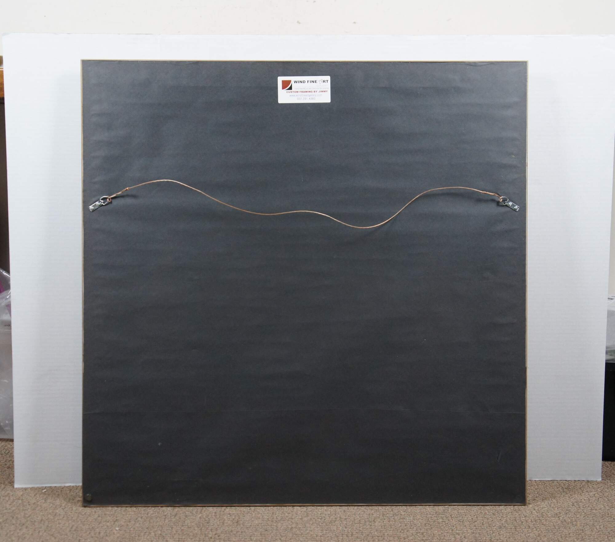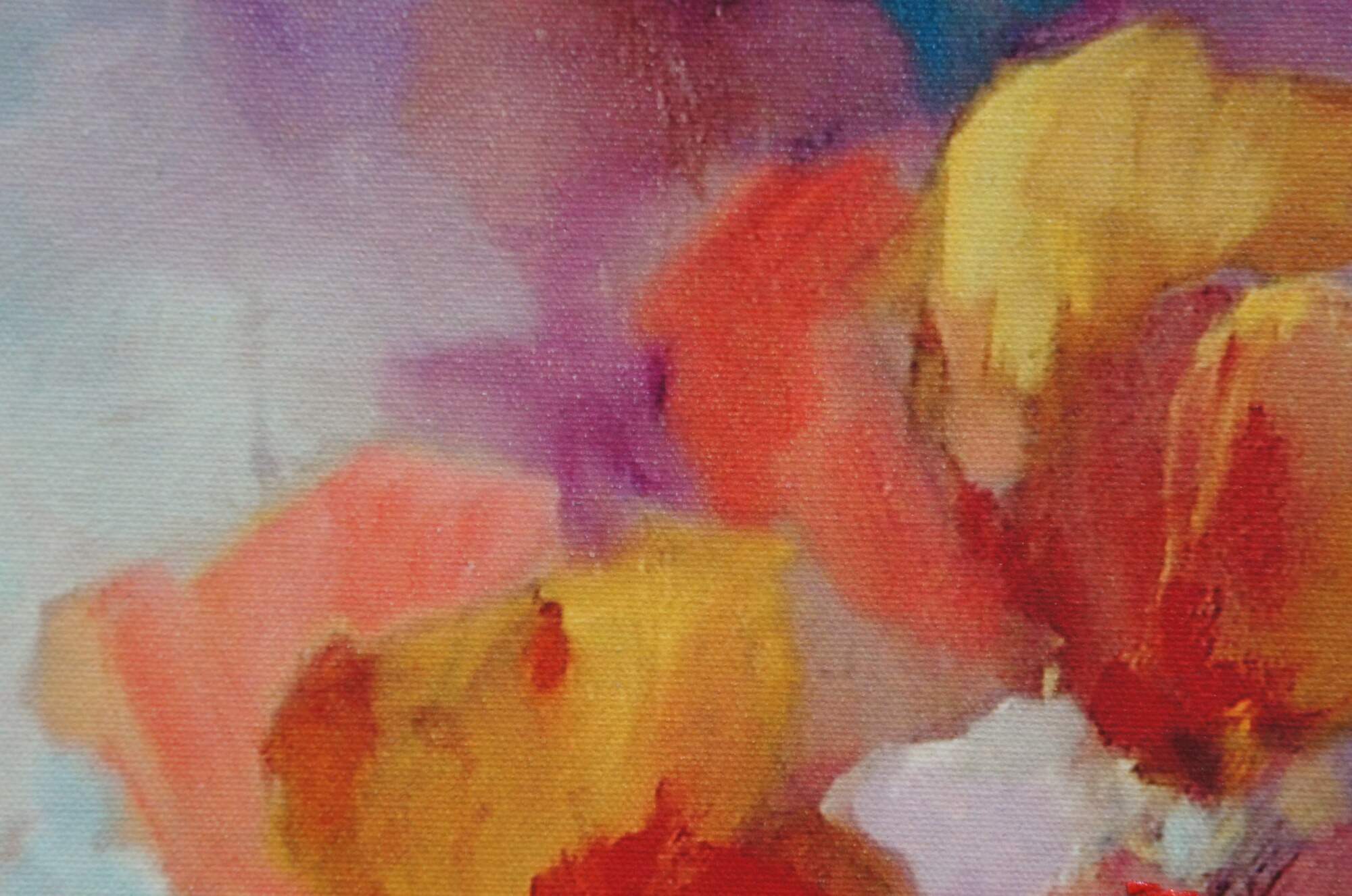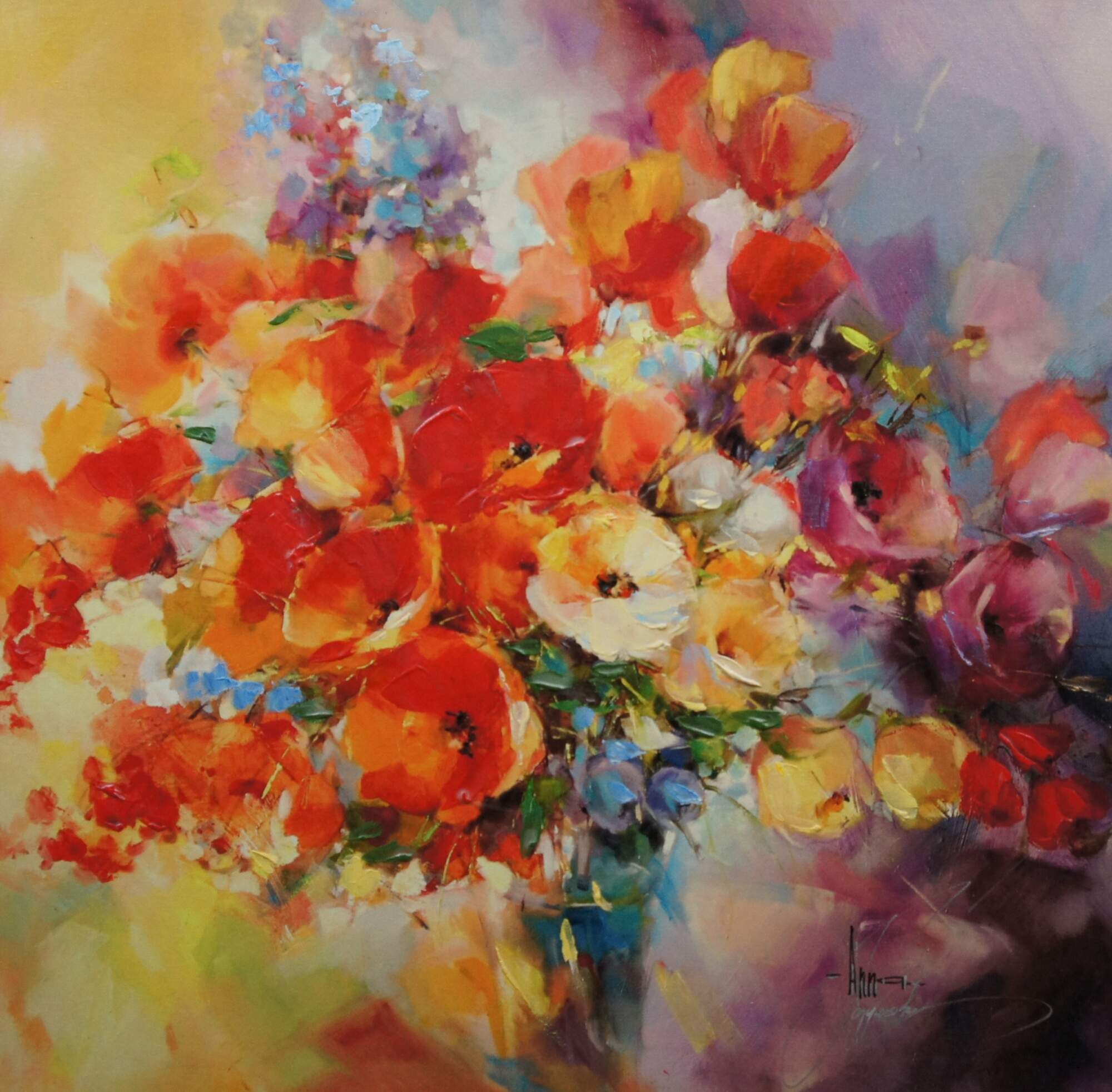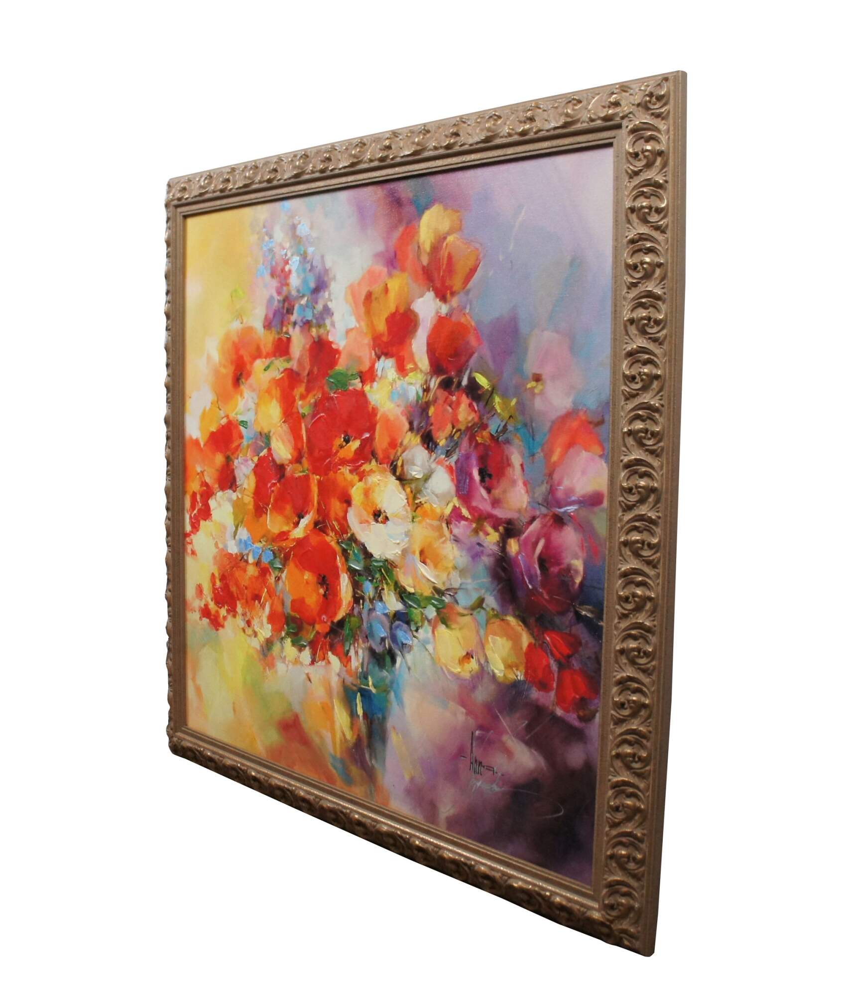 Limited edition hand embellished giclee print on canvas of "Bright Moment 2" by Anna Razumovskaya - depicts a bouquet of poppies and other flowers in a vanishing vase on a mottled yellow and purple background. Signed in lower right corner. Foliate carved gilt wood frame.