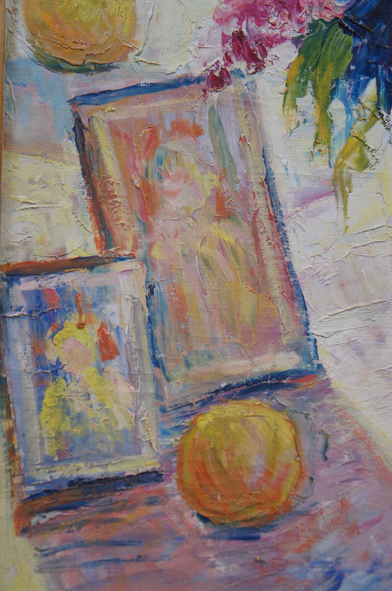 Large vintage 20th century still life oil painting on canvas depicting a vase of pink and purple lilacs, sitting on a cloth covered table next to several oranges / peaches and two frame photos, in the slanting sunlight of a nearby bay window with a waterway and green trees beyond. Gilt and black lacquer frame with carved foliate corners.