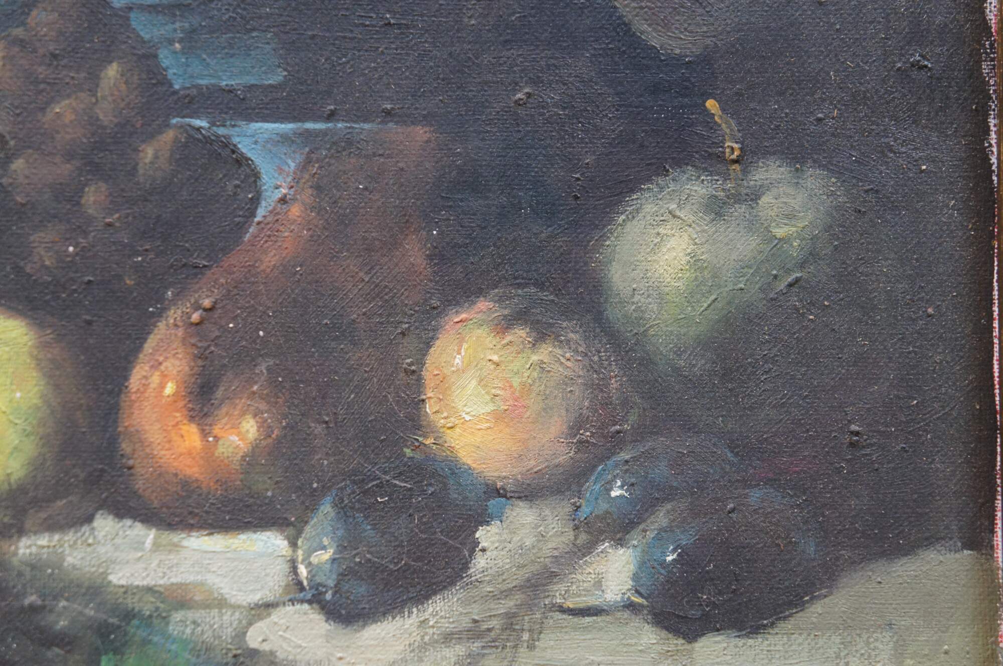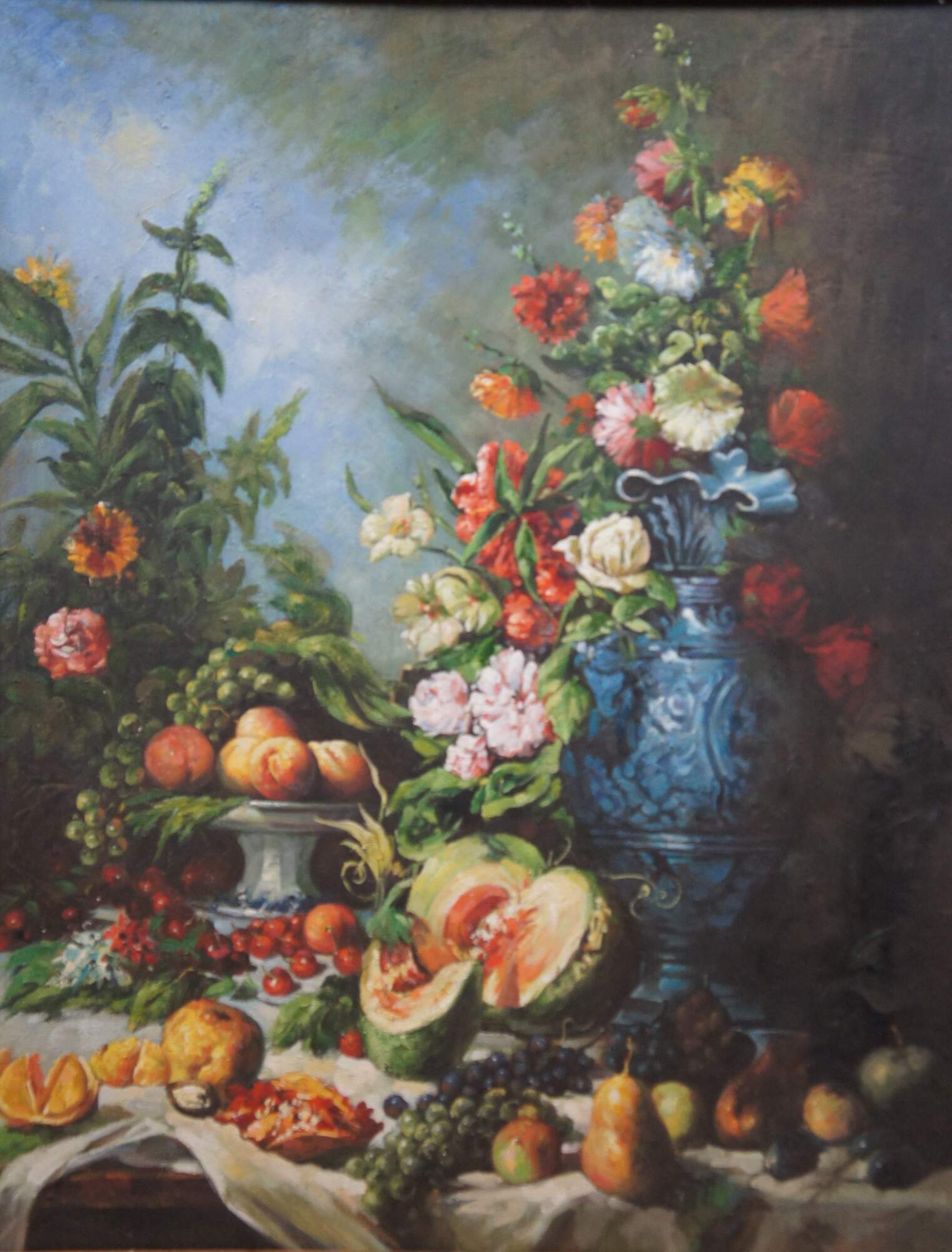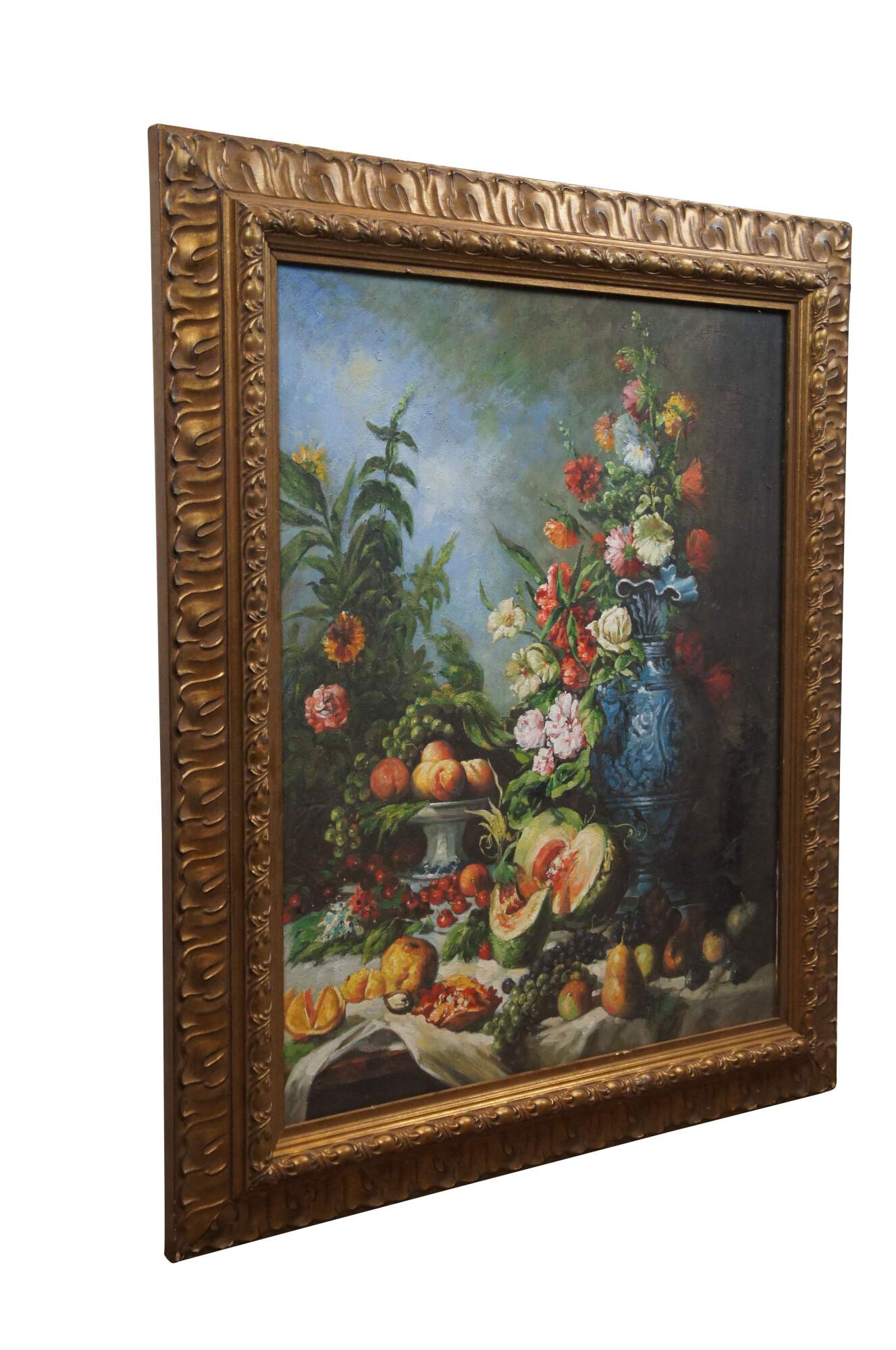 Vintage 20th century oil painting on canvas after a still life attributed to Eugene Vidal, depicting a bouquet of flowers in a large blue vase, surrounded on a cloth covered table with an array of fruits. Carved gold frame, made in Italy.