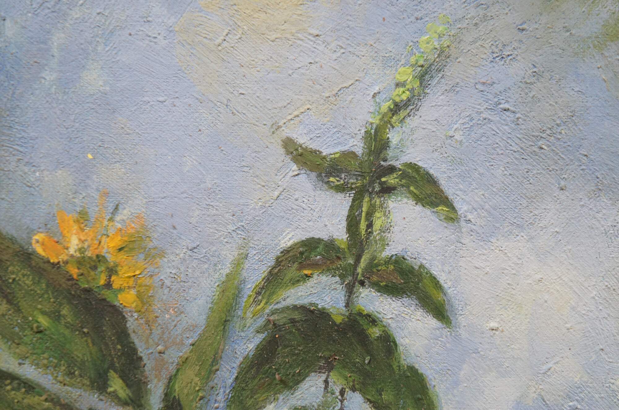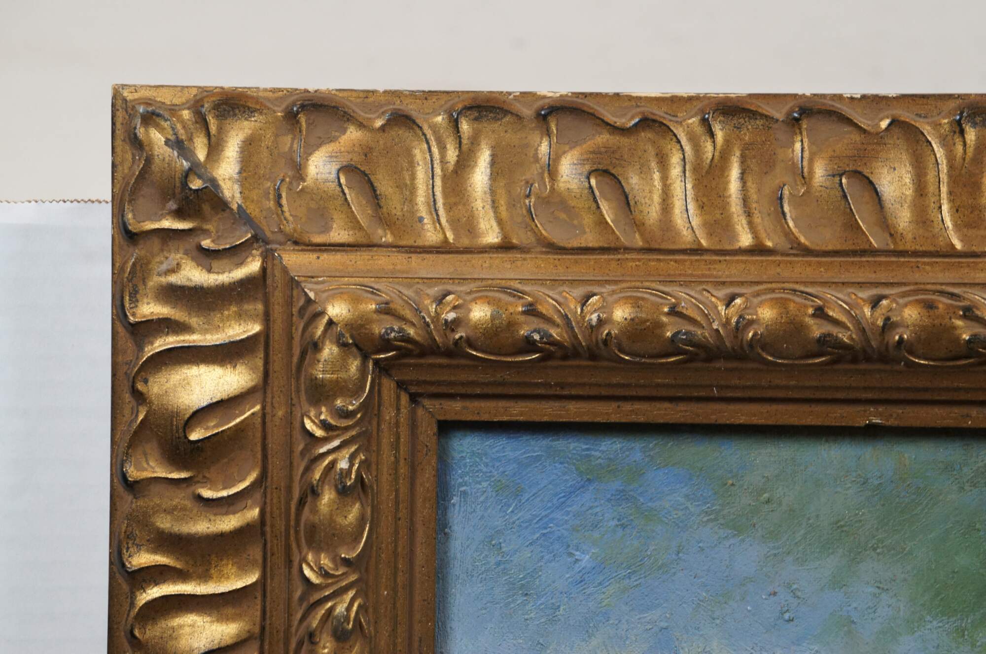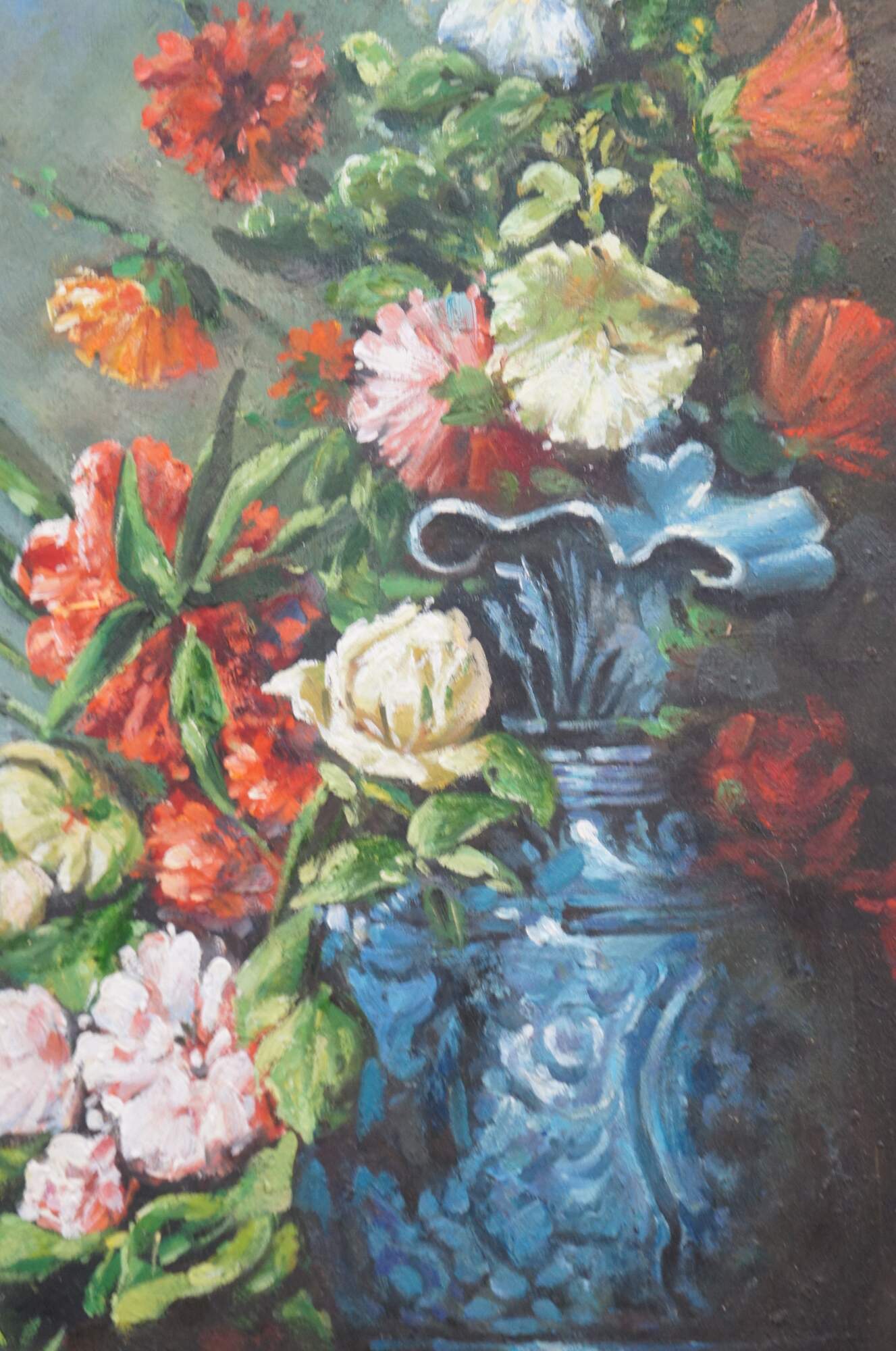 Vintage 20th century oil painting on canvas after a still life attributed to Eugene Vidal, depicting a bouquet of flowers in a large blue vase, surrounded on a cloth covered table with an array of fruits. Carved gold frame, made in Italy.