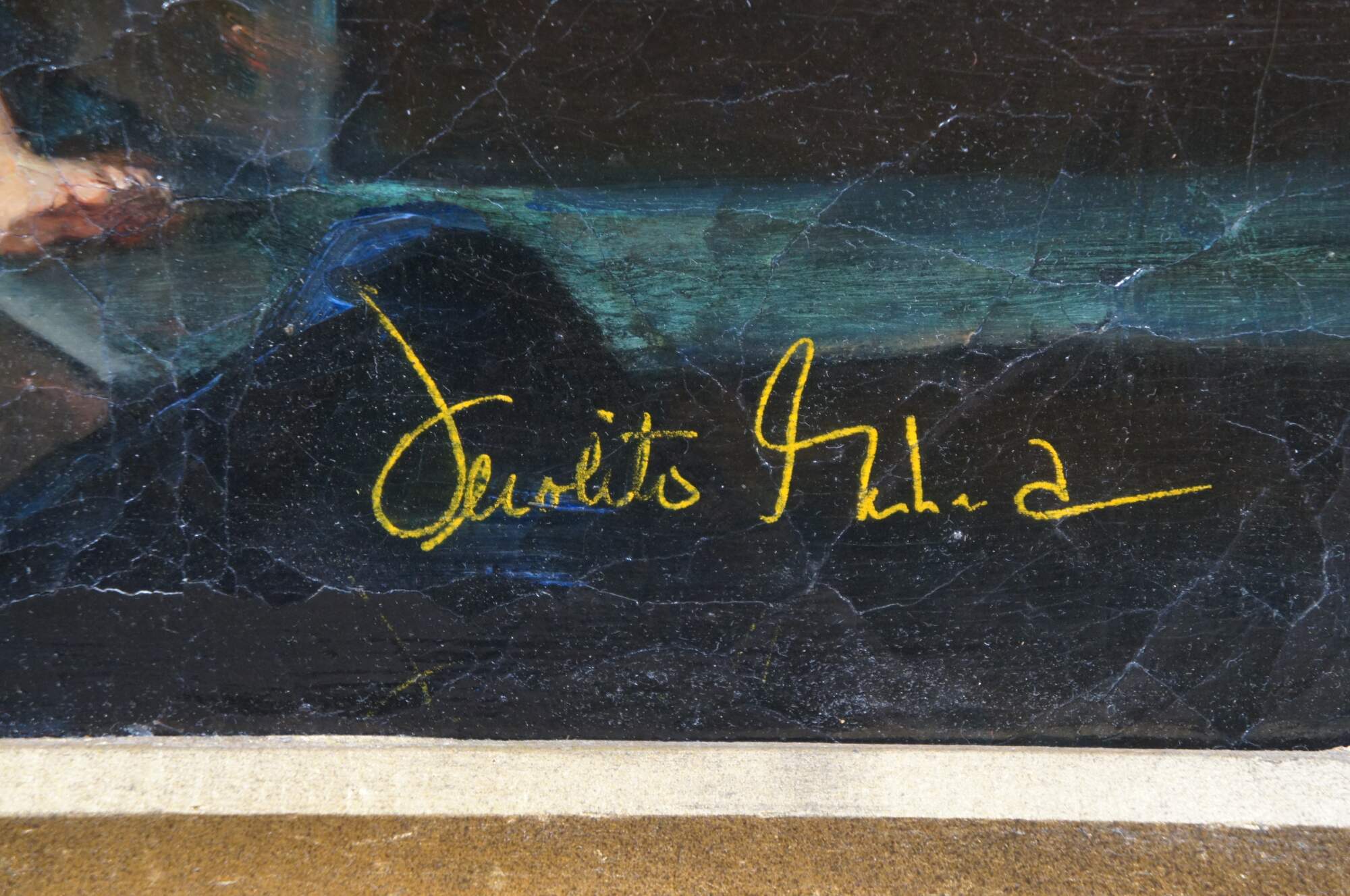 Late 20th century oil painting on linen after "St. Bonaventure Receiving the Banner of St. Sepulchre from the Madonna" originally painted in 1710 by Francesco Solimena. Depicts the Vigrin Mary seated in heavenly glory on a pedestal, surrounded by saintly figures and cherubs / small angels, passing a blue banner to one of them. Ornate baroque floral and foliate molded frame with gold finish.