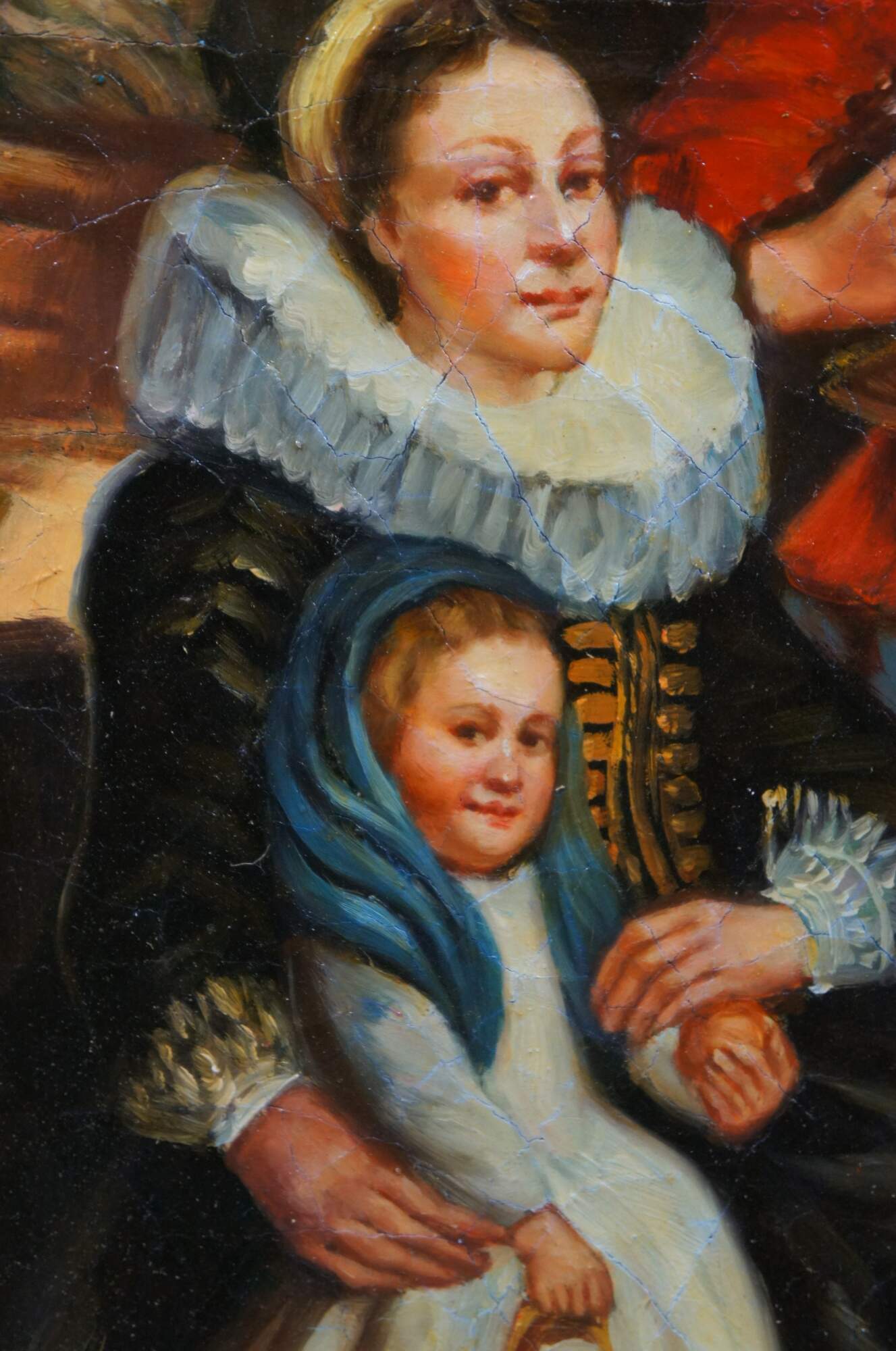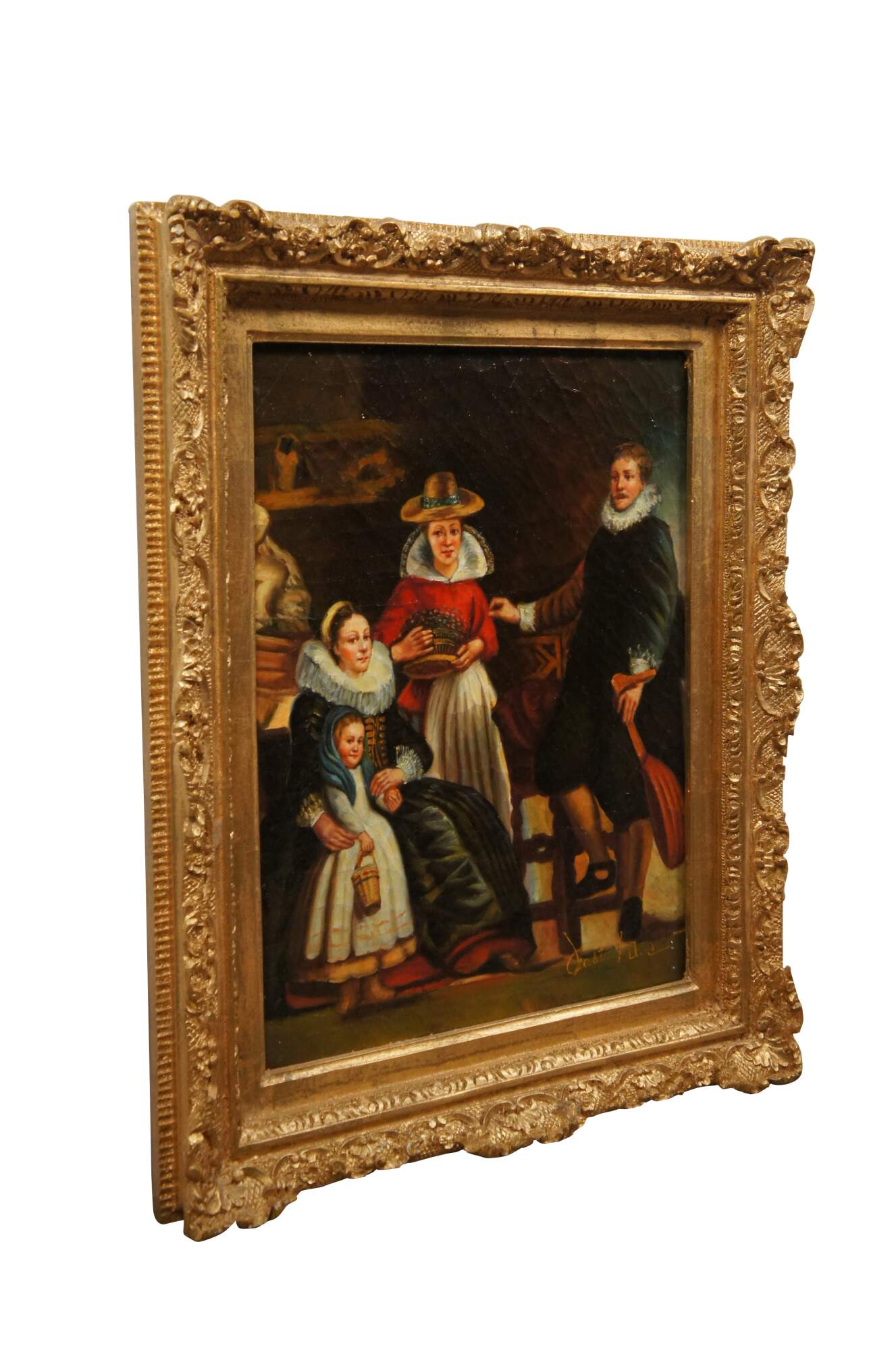 Late 20th century oil painting on linen after "The Artist's Family" by Jacob Jordaens, originally painted circa 1621-1622 (currently house at the Museo del Prado). Depicts Jordaens standing with his wife, daughter, and a servant. Beveled frame with resin molded foliate / scalloped designs and a gold finish.