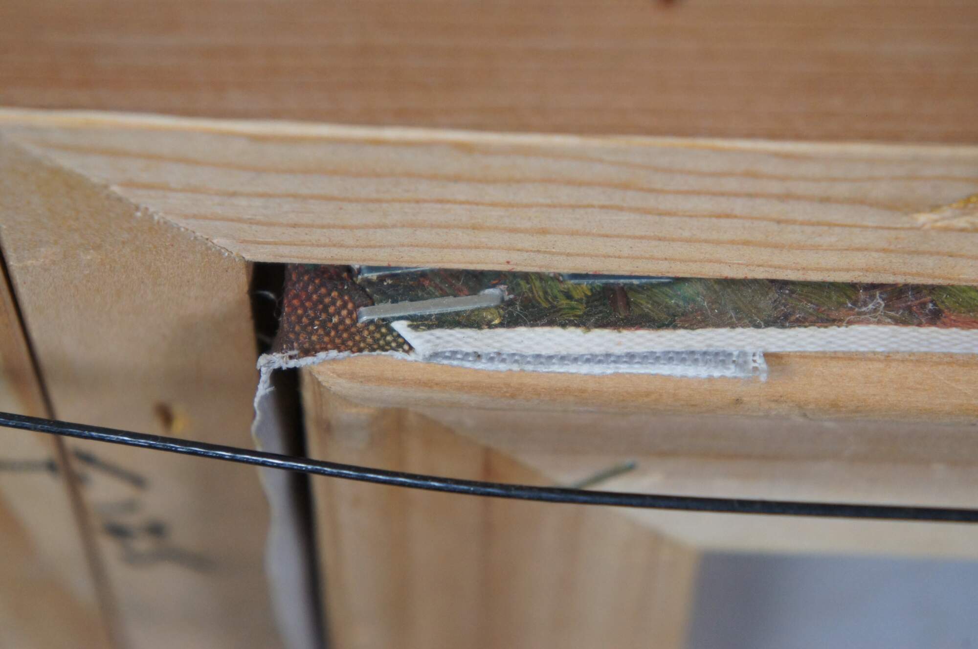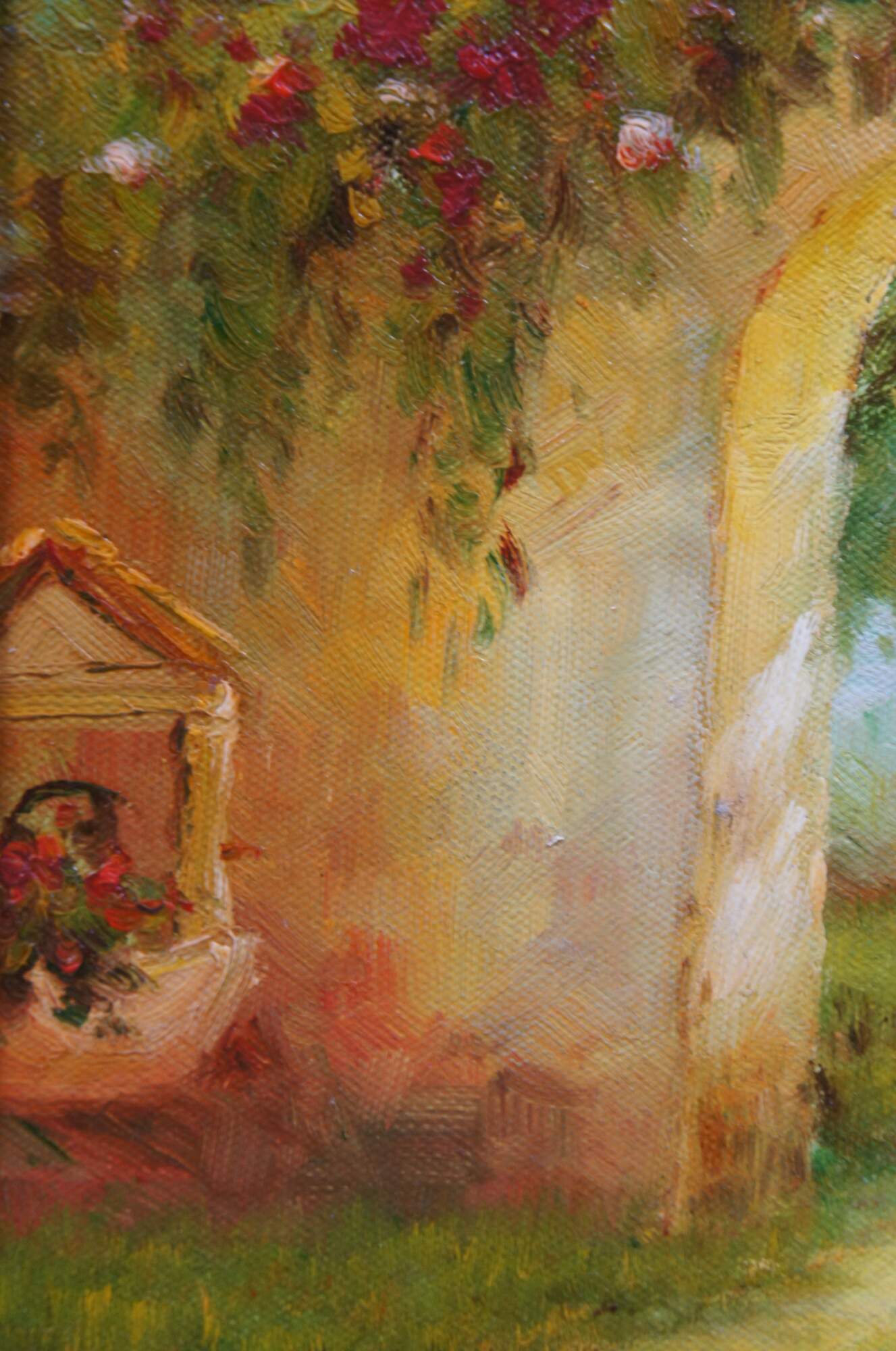 Late 20th century landscape oil painting on canvas depicting a stone archway in a flowering European / French / Italian garden. Signed in lower right corner. Produced by Timeless Treasures. Certificate of Authenticity Number AFD130138. Molded scallop and floral frame with antiqued gold finish.