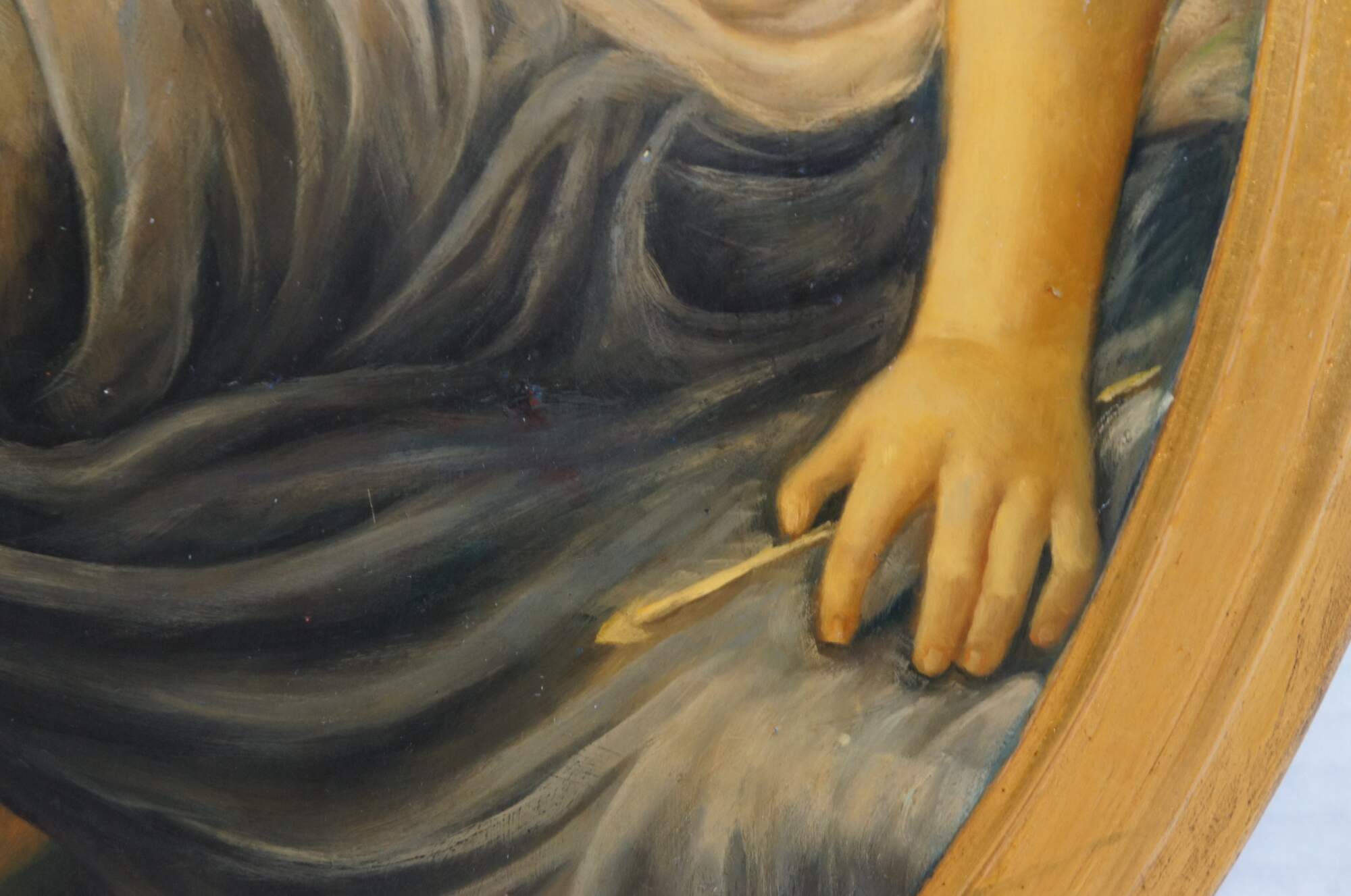 Mid to late 20th century oval portrait oil painting on wood titled Love Disarmed; depicting a young Cupid with his mother Aphrodite / Venus (Eros and Venus) in a simple leaf framed landscape. Signed Charles along lower edge. Painted on a wood panel with convex surface and ridged, gold painted border.