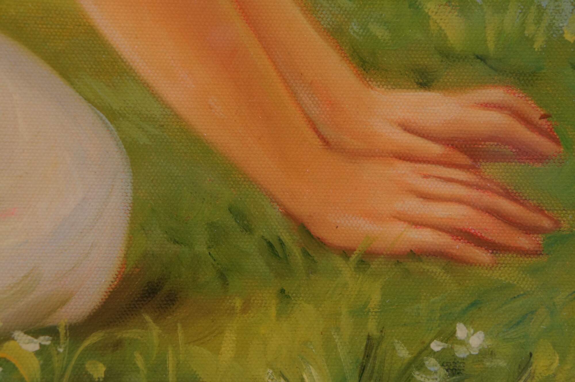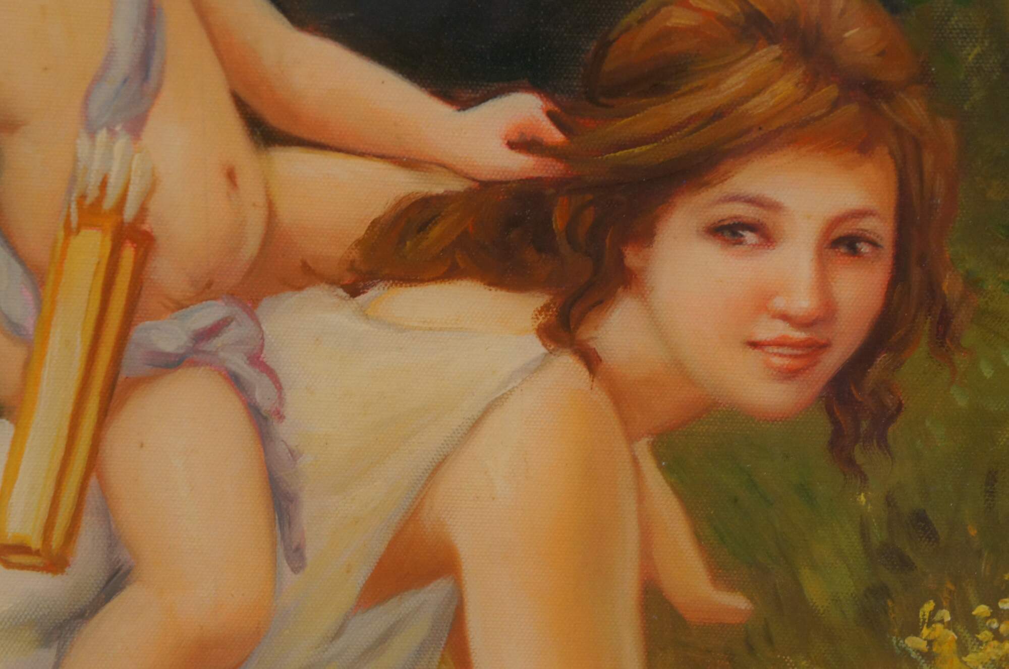 Late 20th century oil on canvas reproduction painting after "Venus and Cupid" by Guillaume Seignac. Depicts a young Cupid (Eros) playing "horsey" with his mother Venus (Aphrodite) in a forest landscape. Heavy resin frame molded with a foliate motif; plexiglass front.