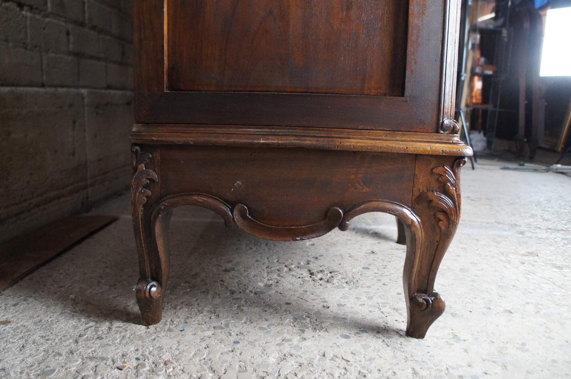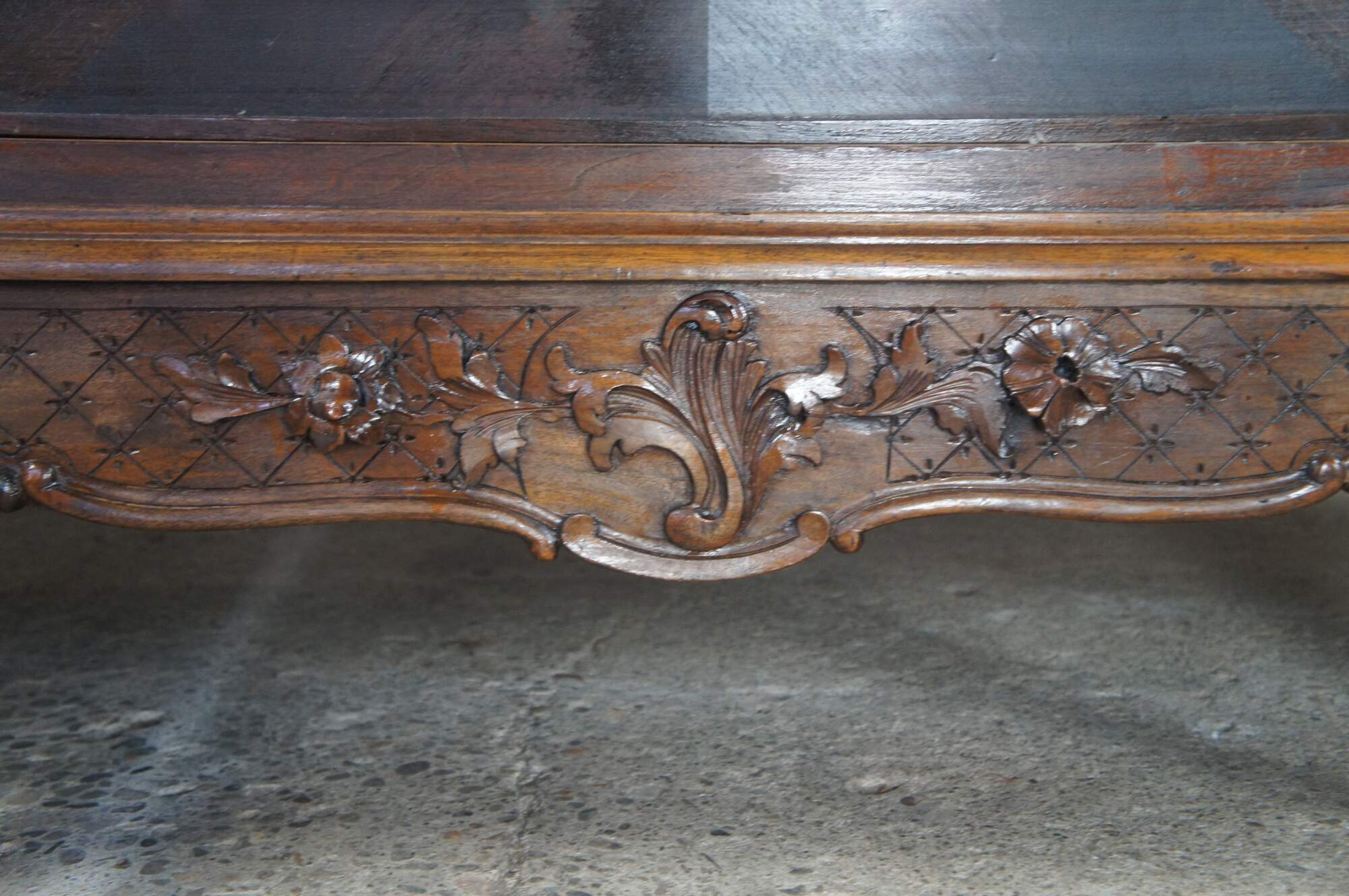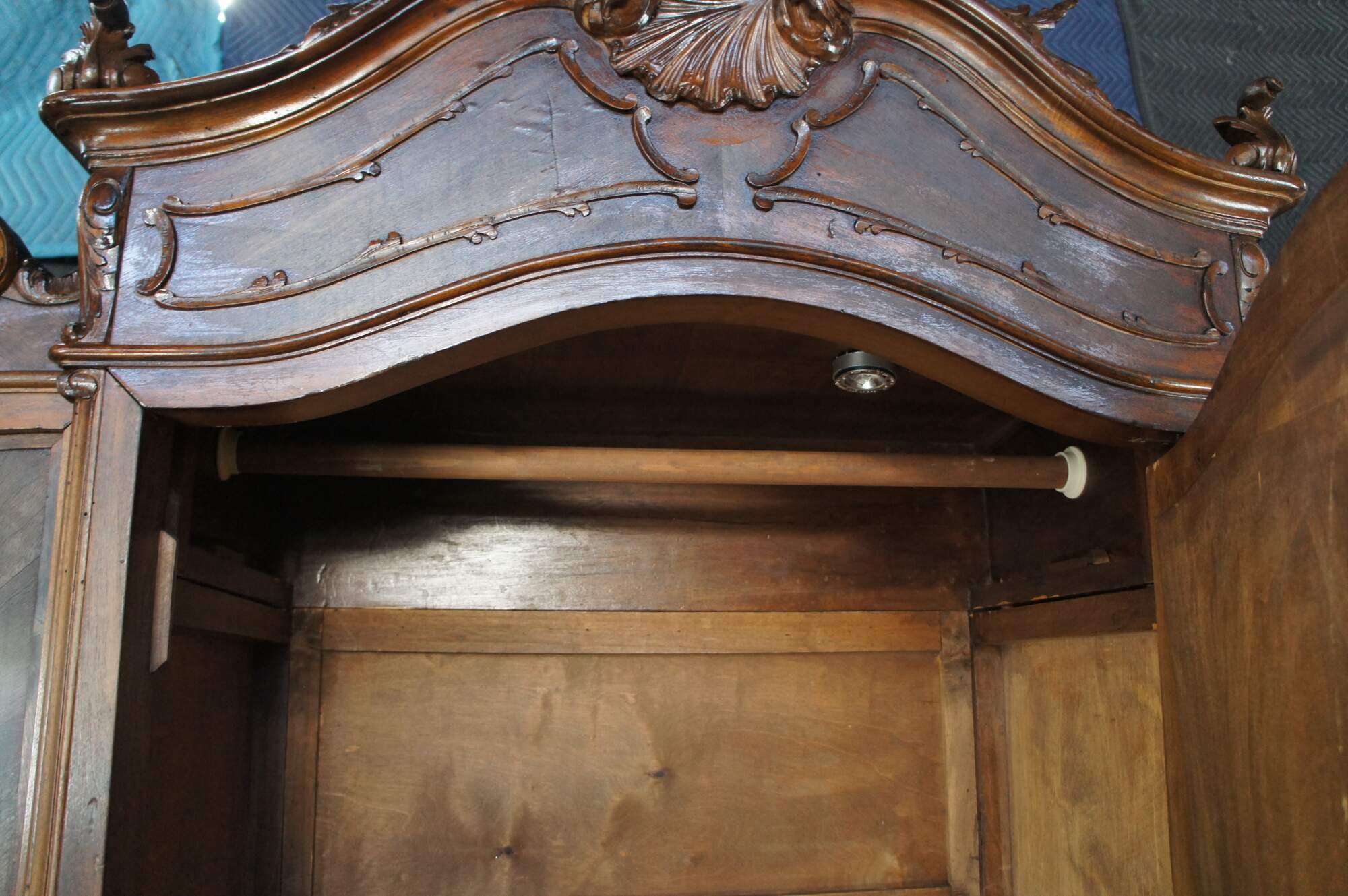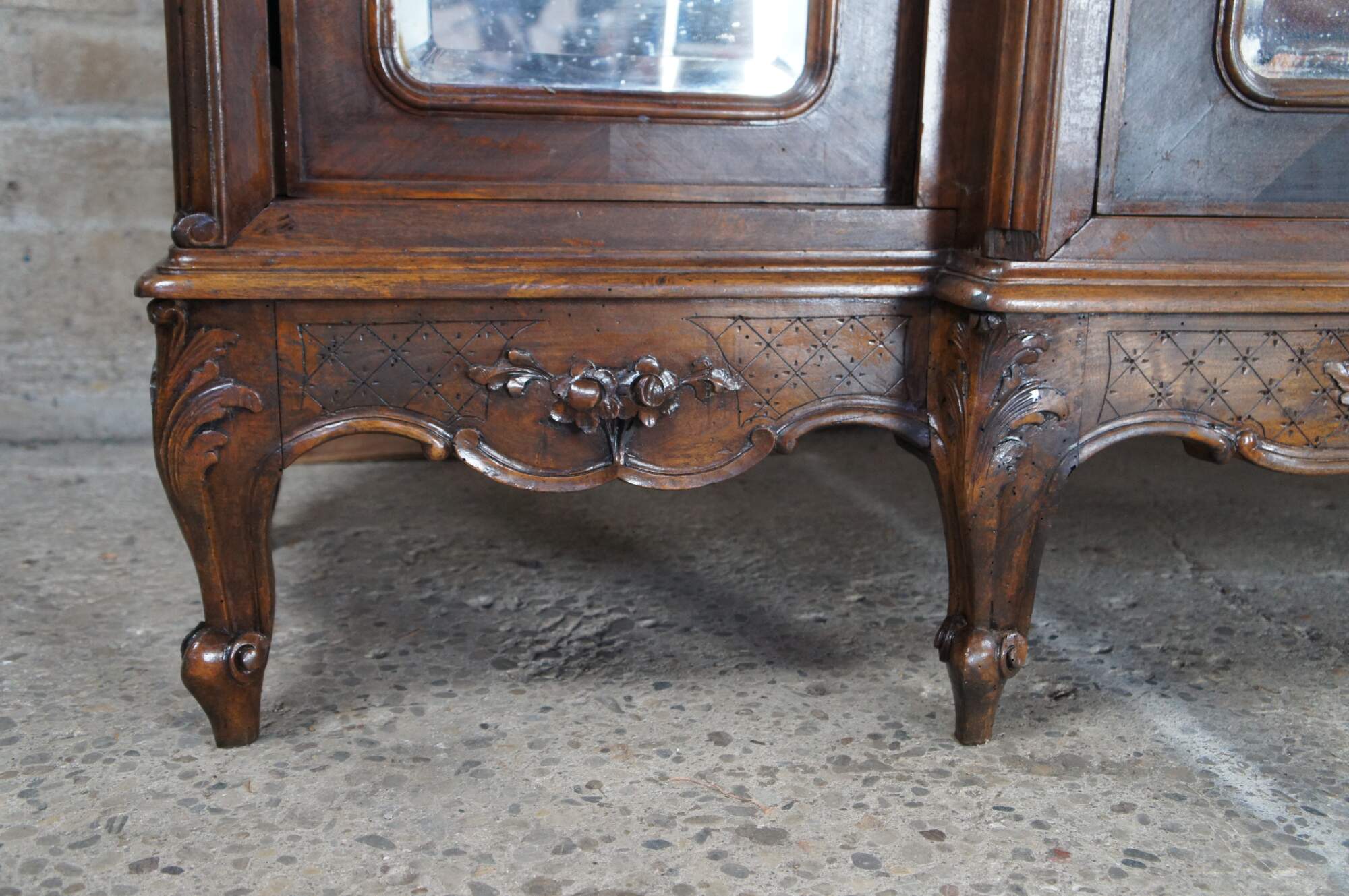A beautiful antique 19th Century French Knockdown Armoire / Wardrobe. Features a walnut frame with three large beveled glass mirrored doors The cabinet opens to a large central area for hanging garments at the center which is flanked by smaller outer cabinets with shelves. The central crown has a beautifully carved cartouche with shell and acanthus motifs. Lower aprons showcase a lattice carved design, with rose carved accents over cabriole legs.