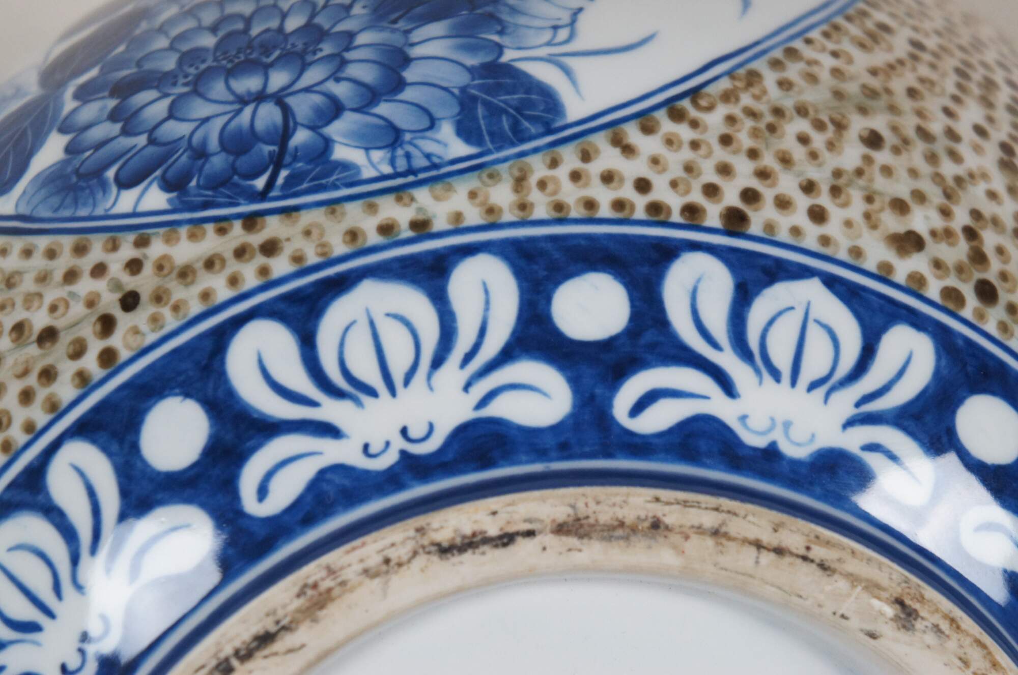 Late 20th century porcelain vase / urn by Maitland Smith. Features round panels of chinoiserie floral designs, framed in a background of speckled brown and a pattern of spirals around the rim. Hand Made in Thailand. 2185-259.