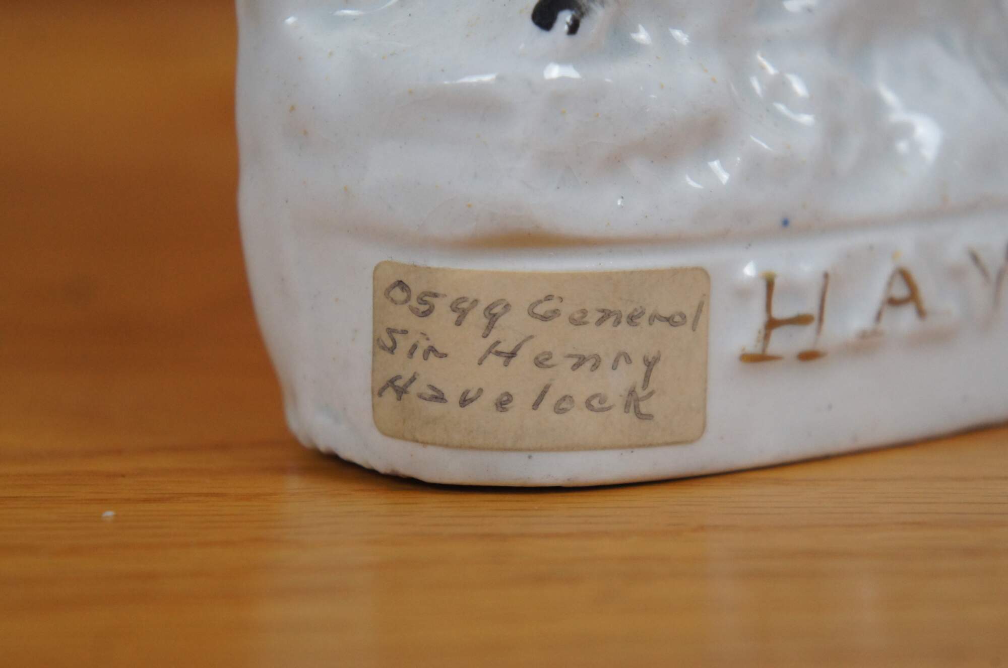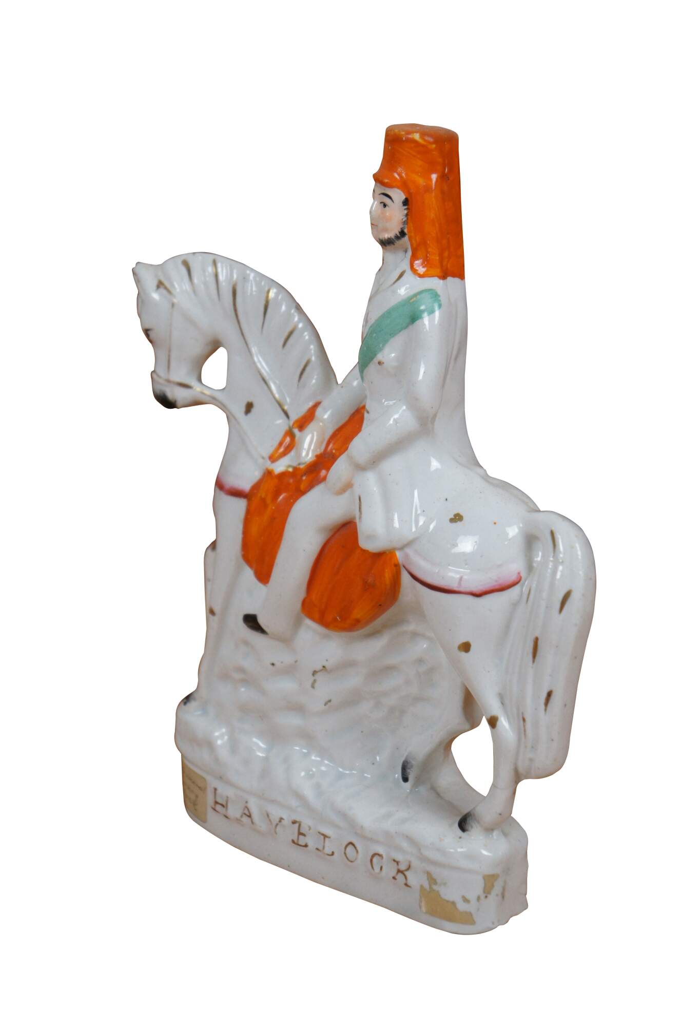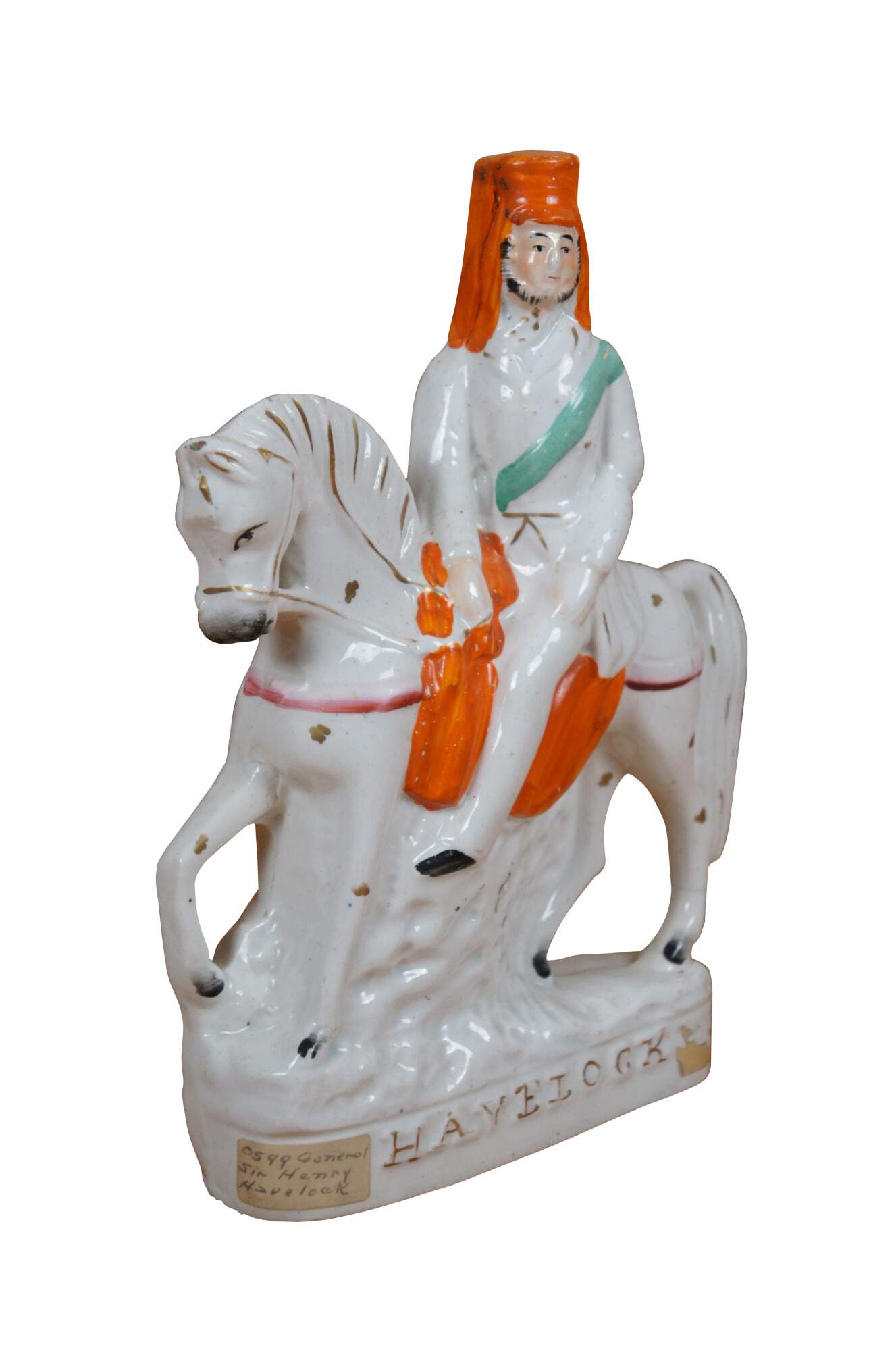Antique 19th century English Staffordshire porcelain flatback figurine depicting General Henry Havelock on horseback circa 1860 with a bright orange hat and saddle blanket. General Havelock (1795- 1857) served his military career largely in India where he died in 1857. He is entombed at Lucknow, India. He is depicted astride a powerful horse. He is in uniform with a sun curtain on his head a medal on his chest which appears to be the Order of British India. He was a revered figure in England and this figurine was cast to commemorate his death. He also has a statue in Trafalgar Square with this inscription at the base: " Your labors, your privations, your sufferings and your valour will not be forgotten by a grateful country".