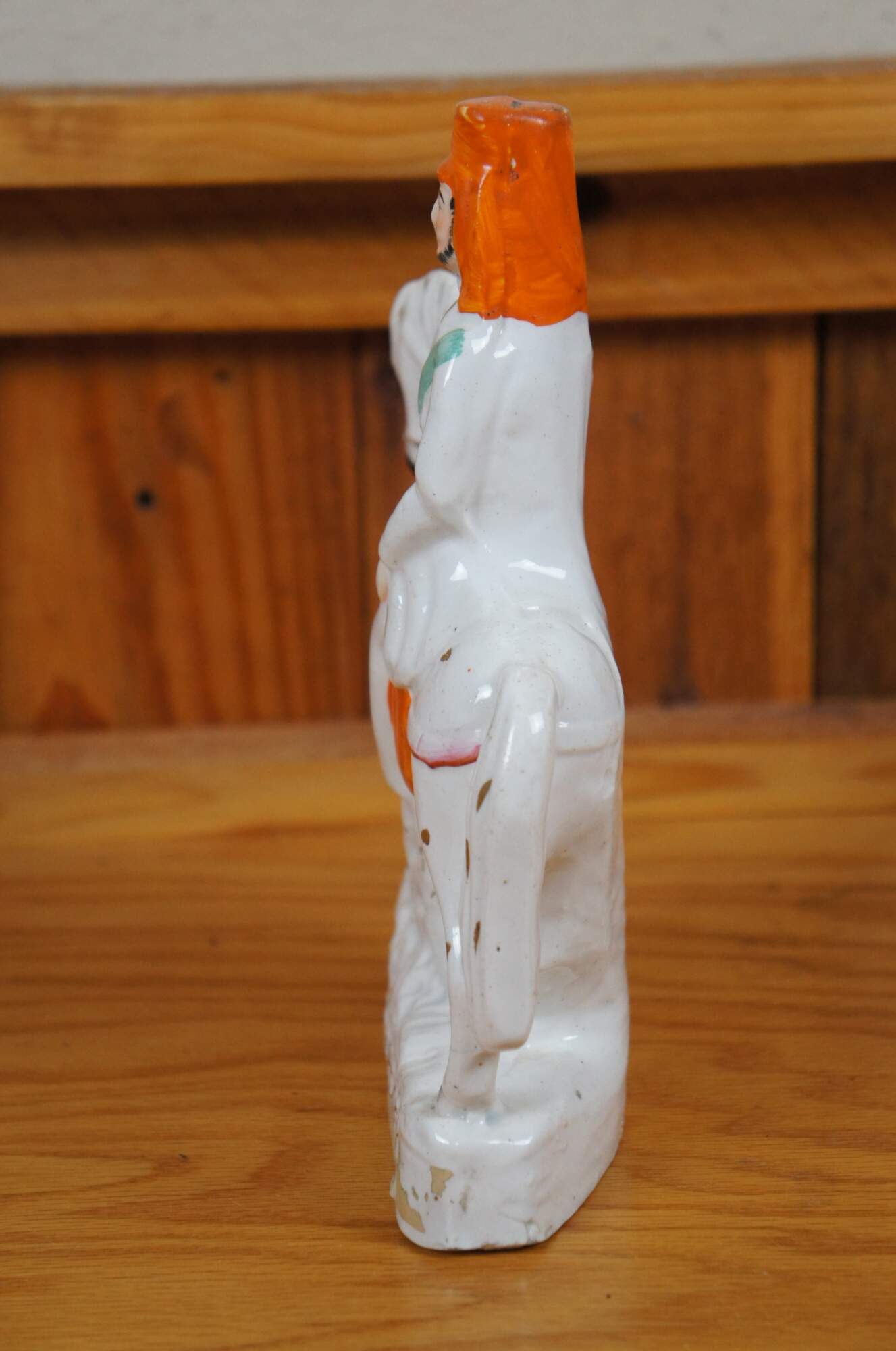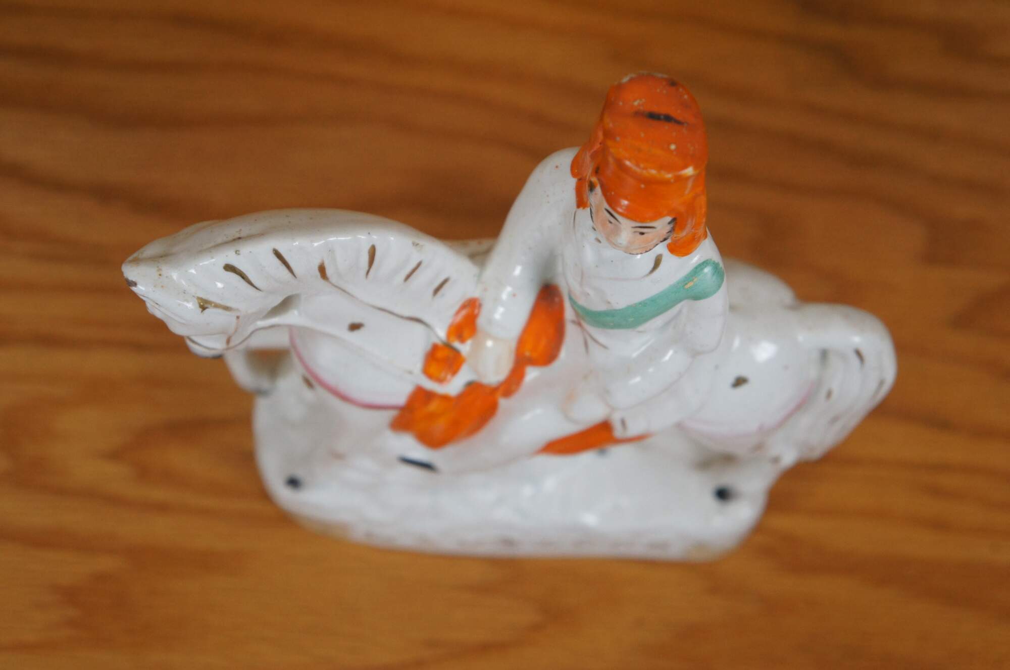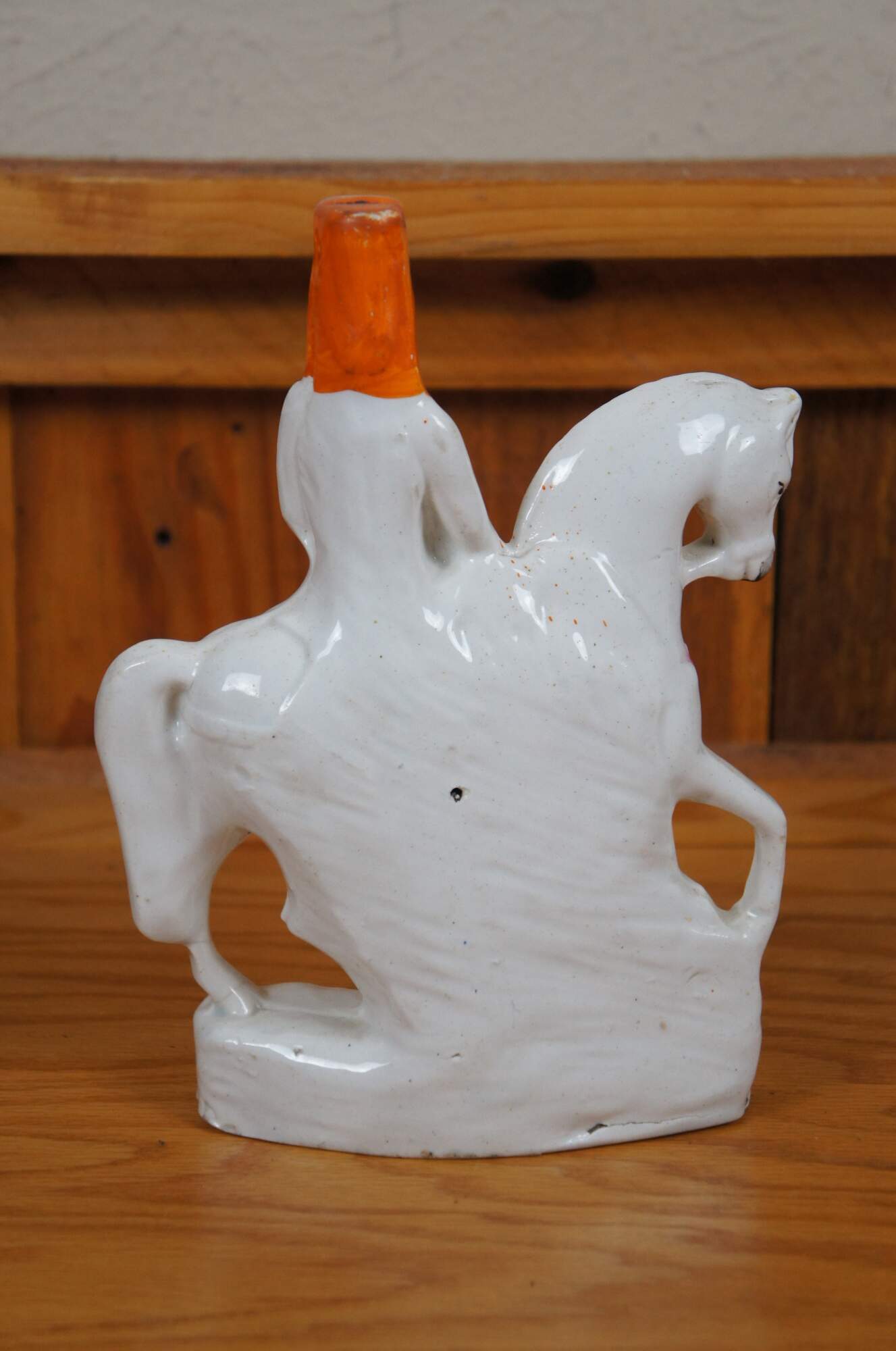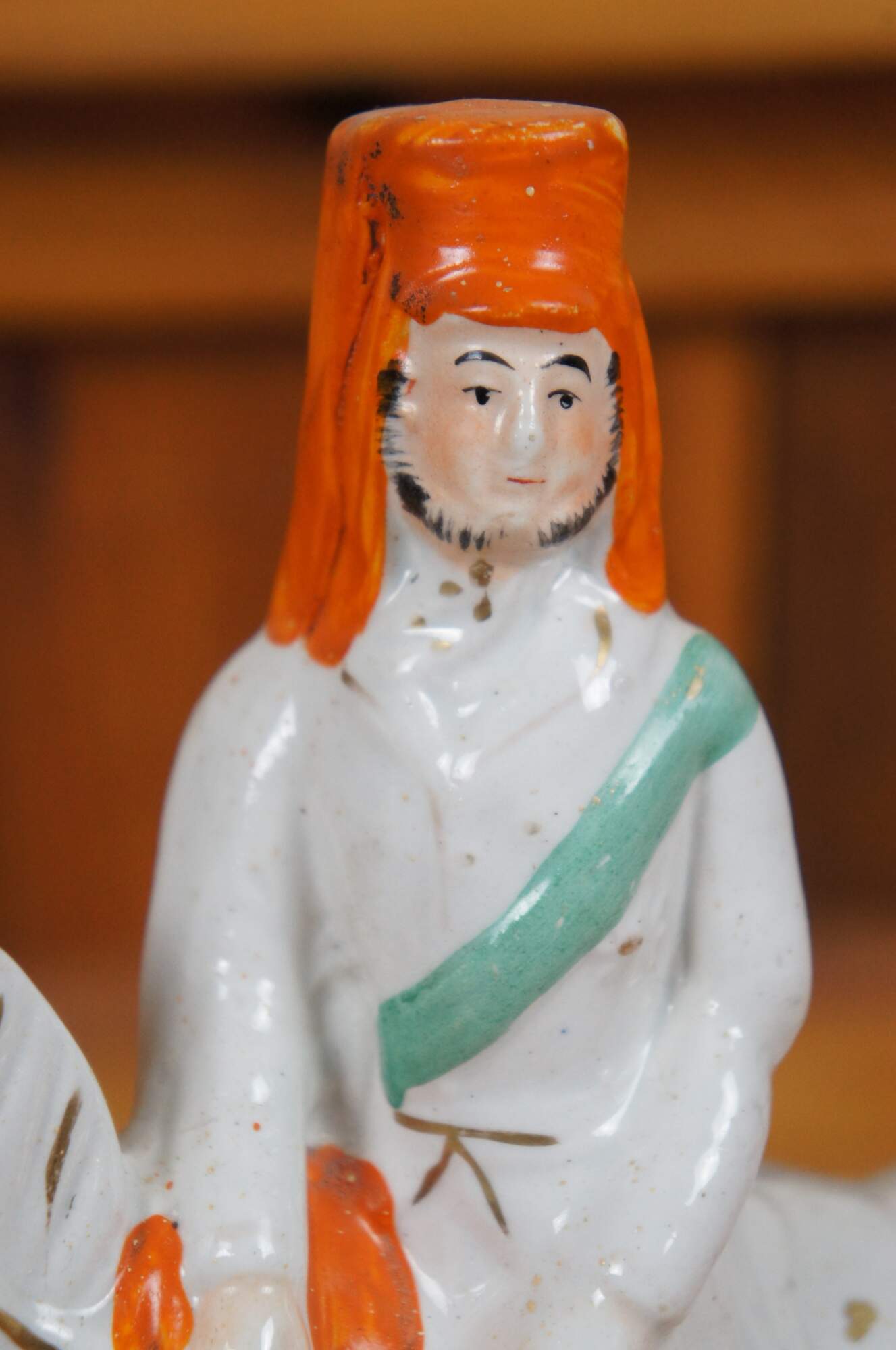 Antique 19th century English Staffordshire porcelain flatback figurine depicting General Henry Havelock on horseback circa 1860 with a bright orange hat and saddle blanket. General Havelock (1795- 1857) served his military career largely in India where he died in 1857. He is entombed at Lucknow, India. He is depicted astride a powerful horse. He is in uniform with a sun curtain on his head a medal on his chest which appears to be the Order of British India. He was a revered figure in England and this figurine was cast to commemorate his death. He also has a statue in Trafalgar Square with this inscription at the base: " Your labors, your privations, your sufferings and your valour will not be forgotten by a grateful country".