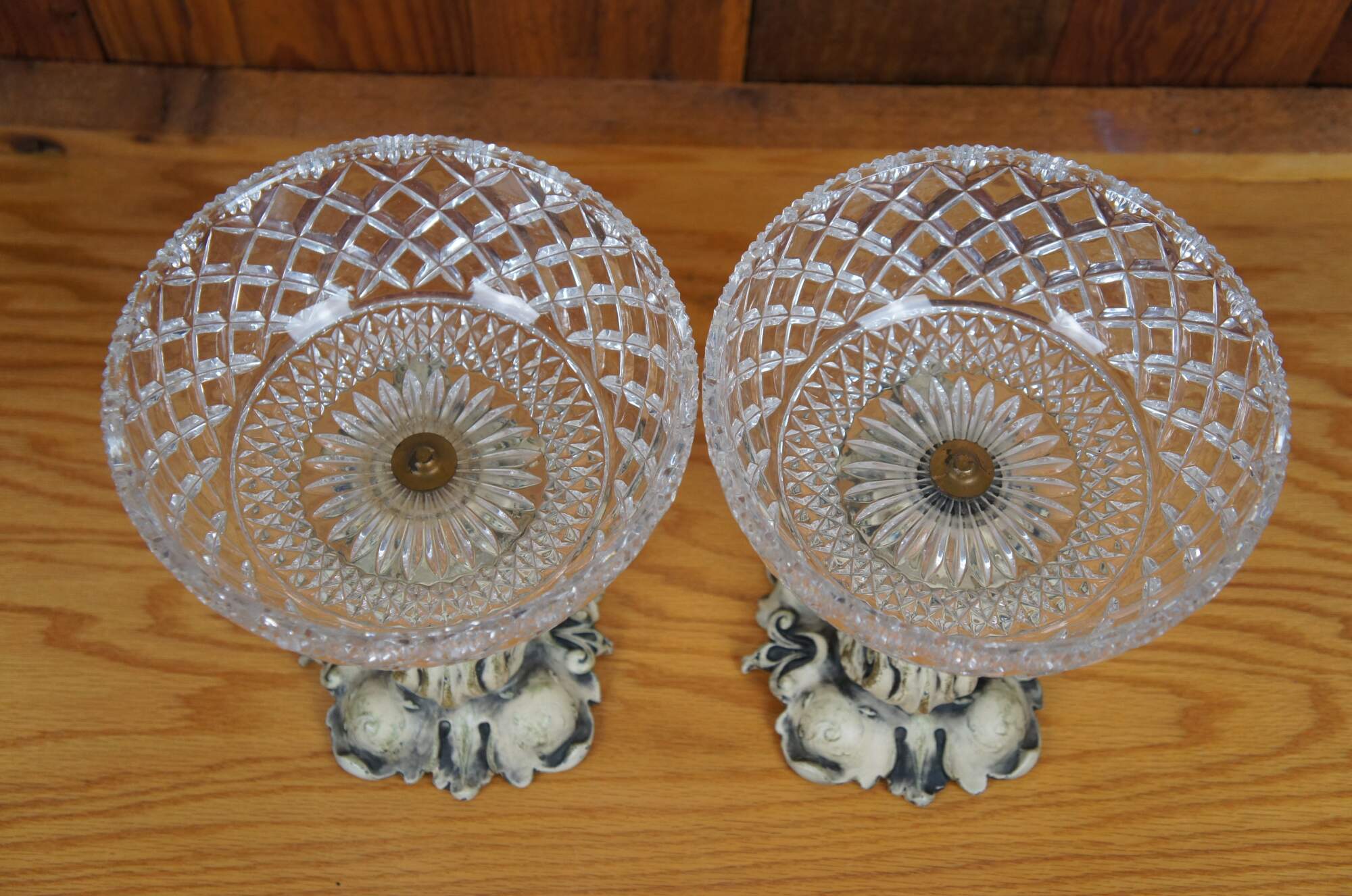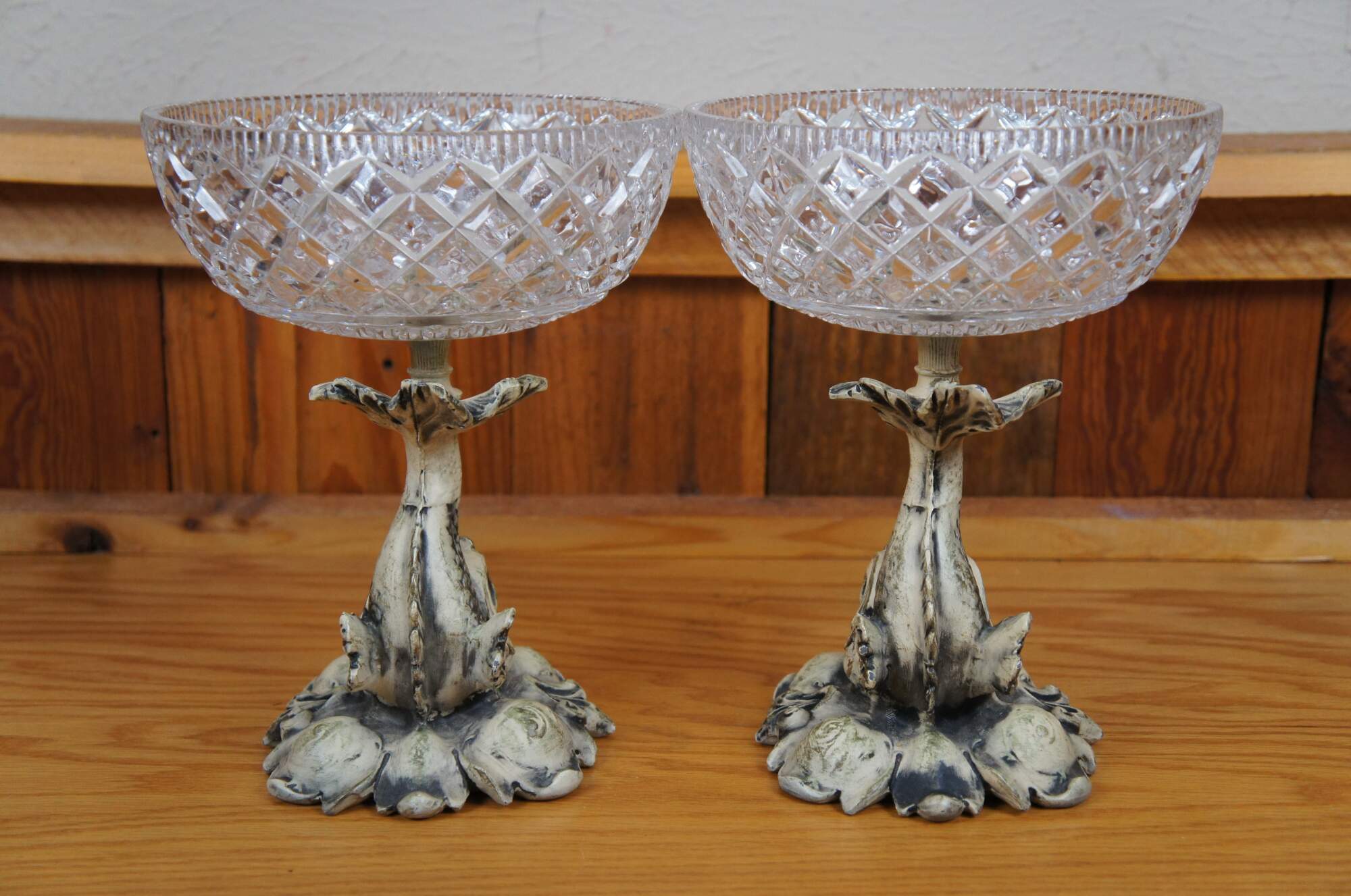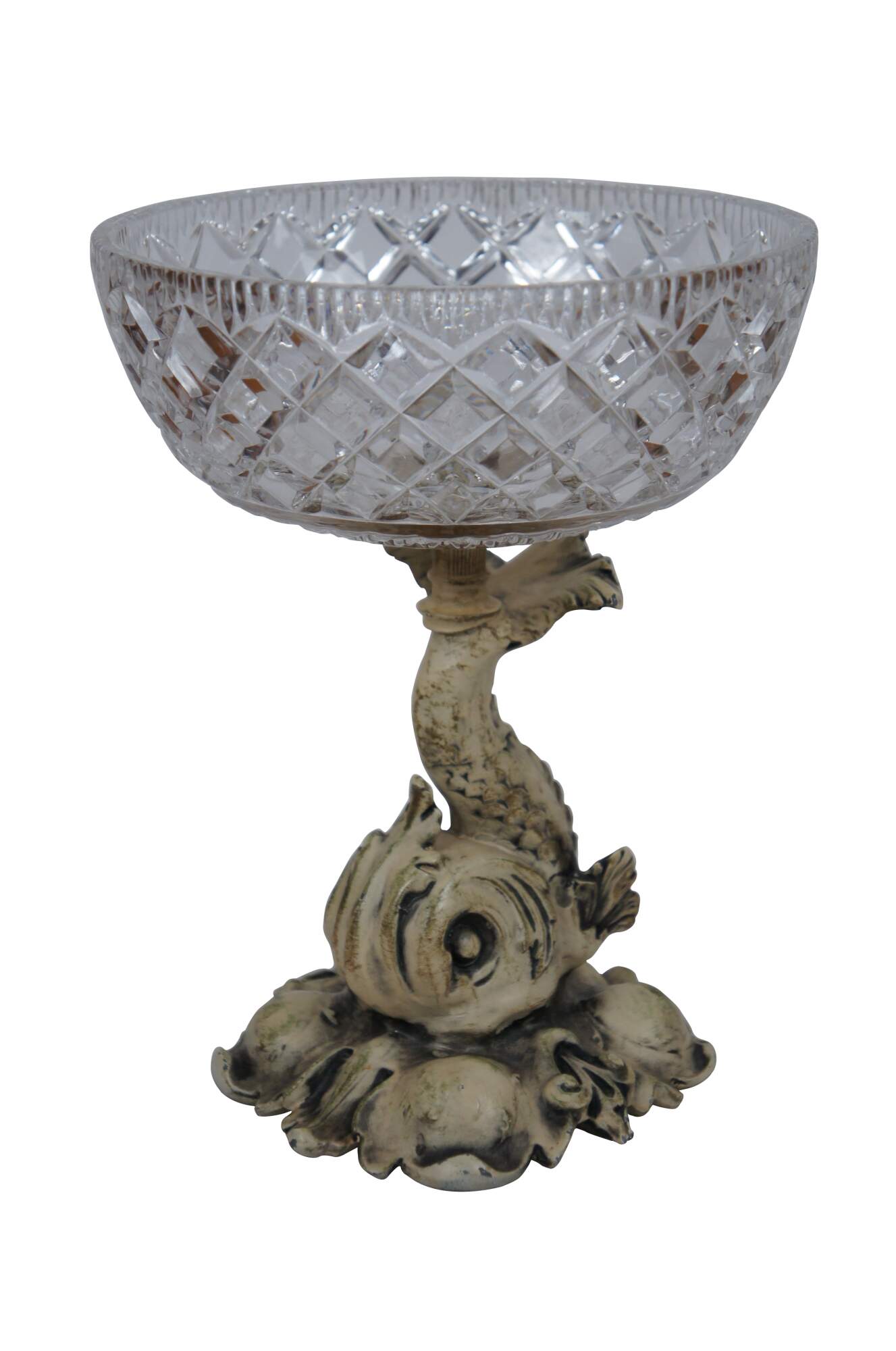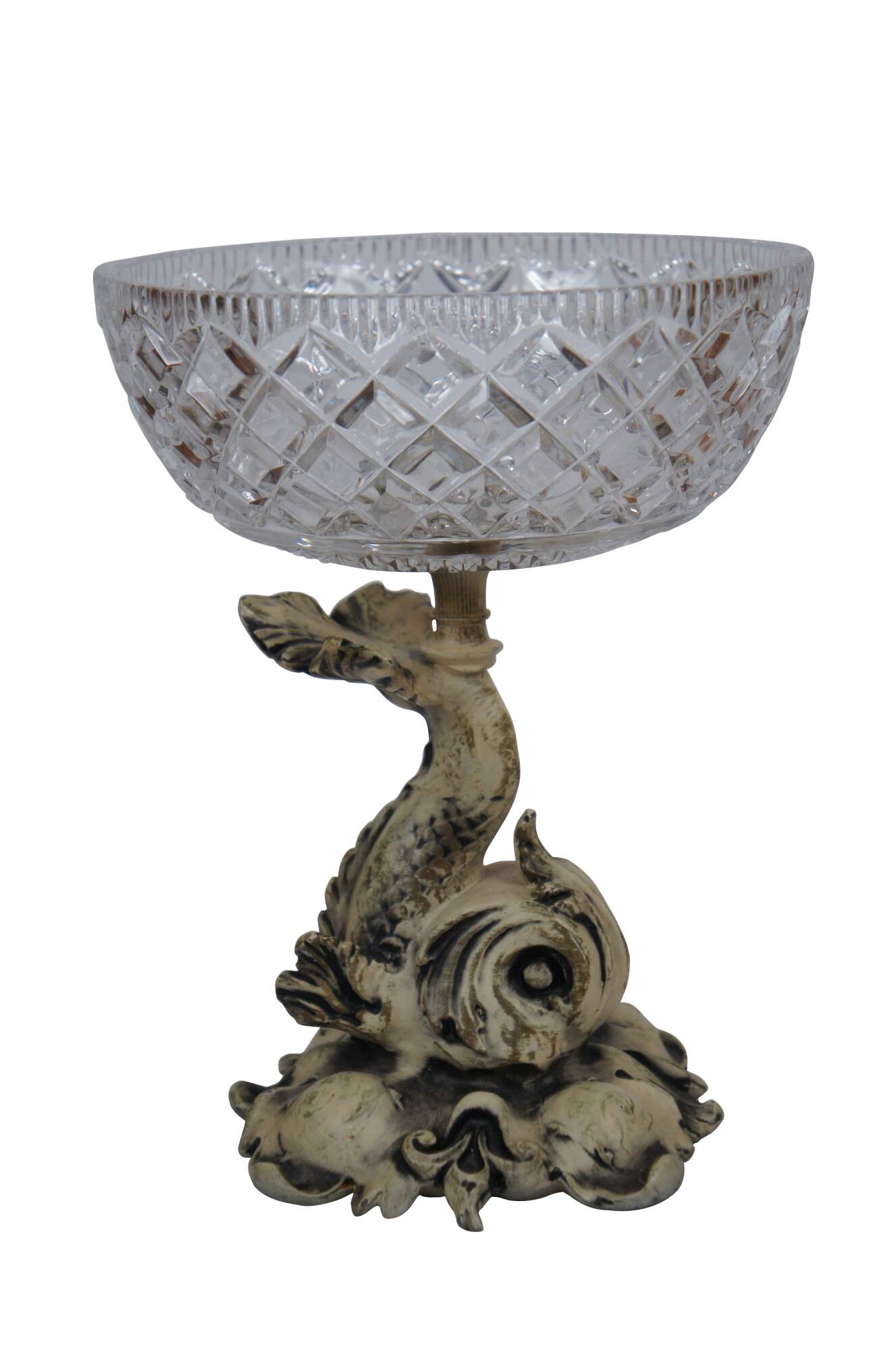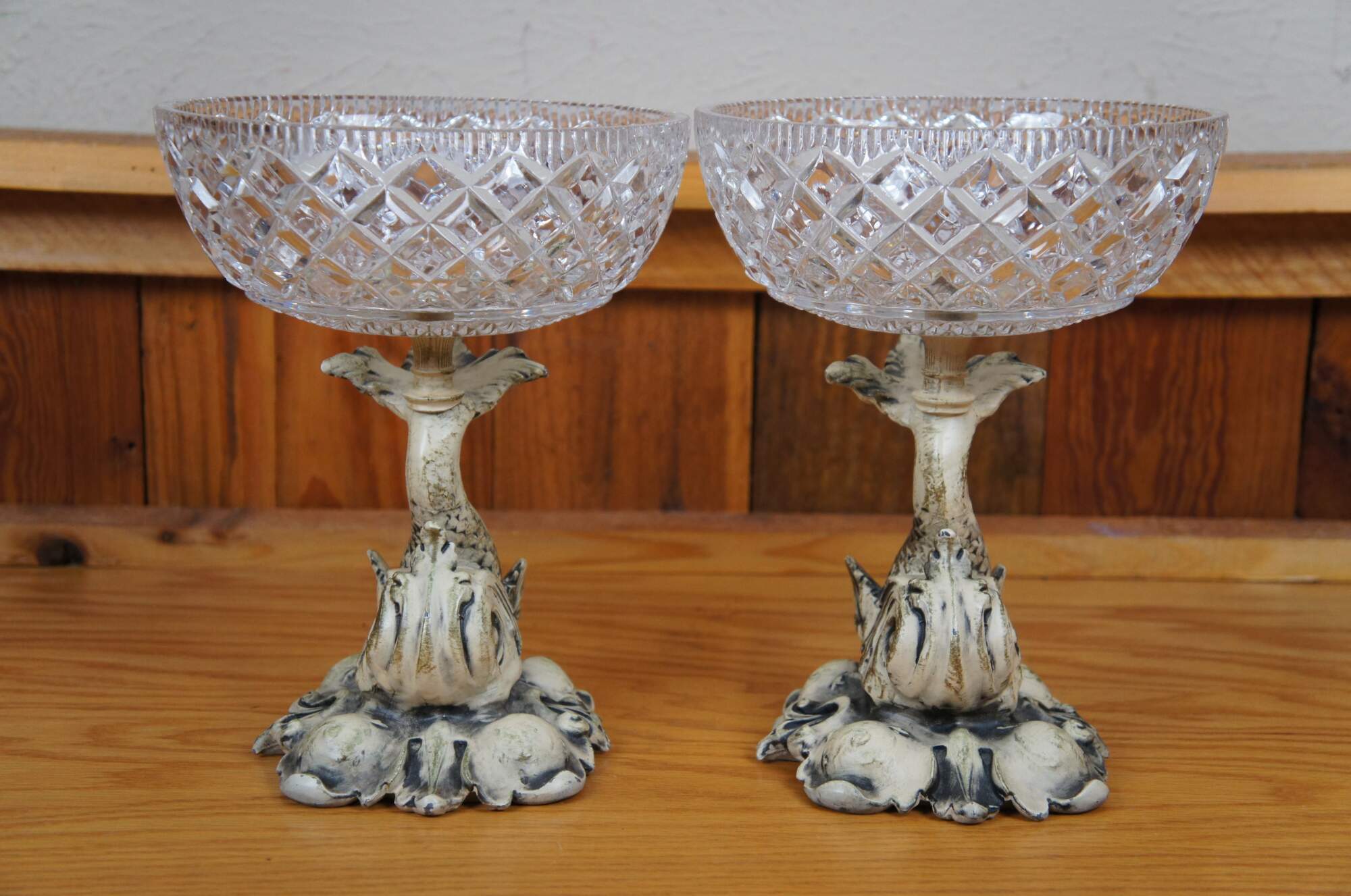 Pair of rare mid 20th century French Empire / Neoclassical compote bowls featuring cast metal pedestal bases in the shape of delphins / dolphins / fish, painted in off white, balancing cross cut crystal bowls on the tops of their tails. Base appears to read 1/9/1959.