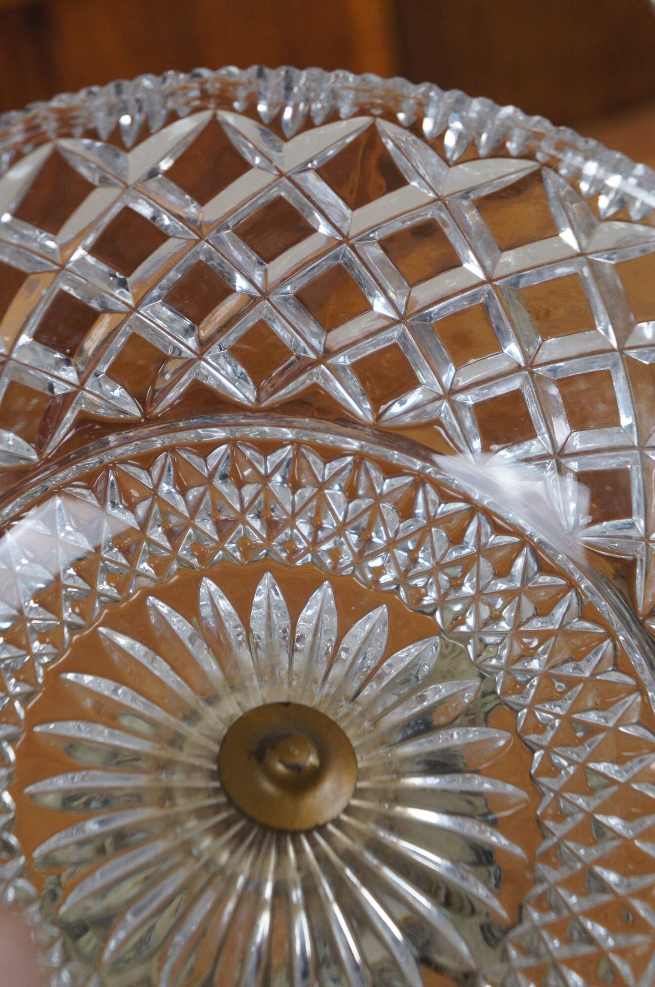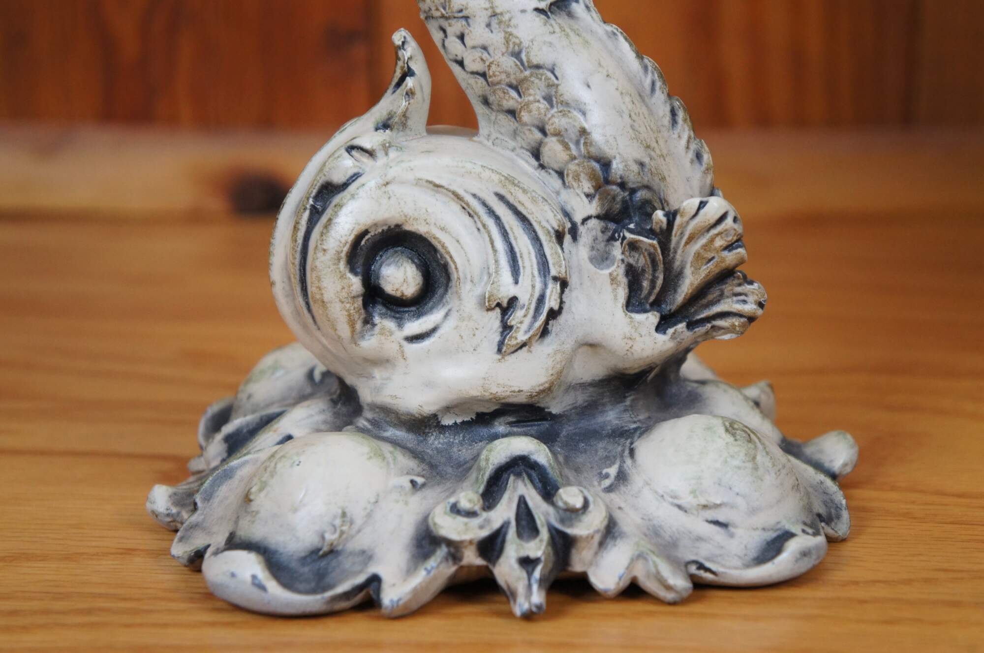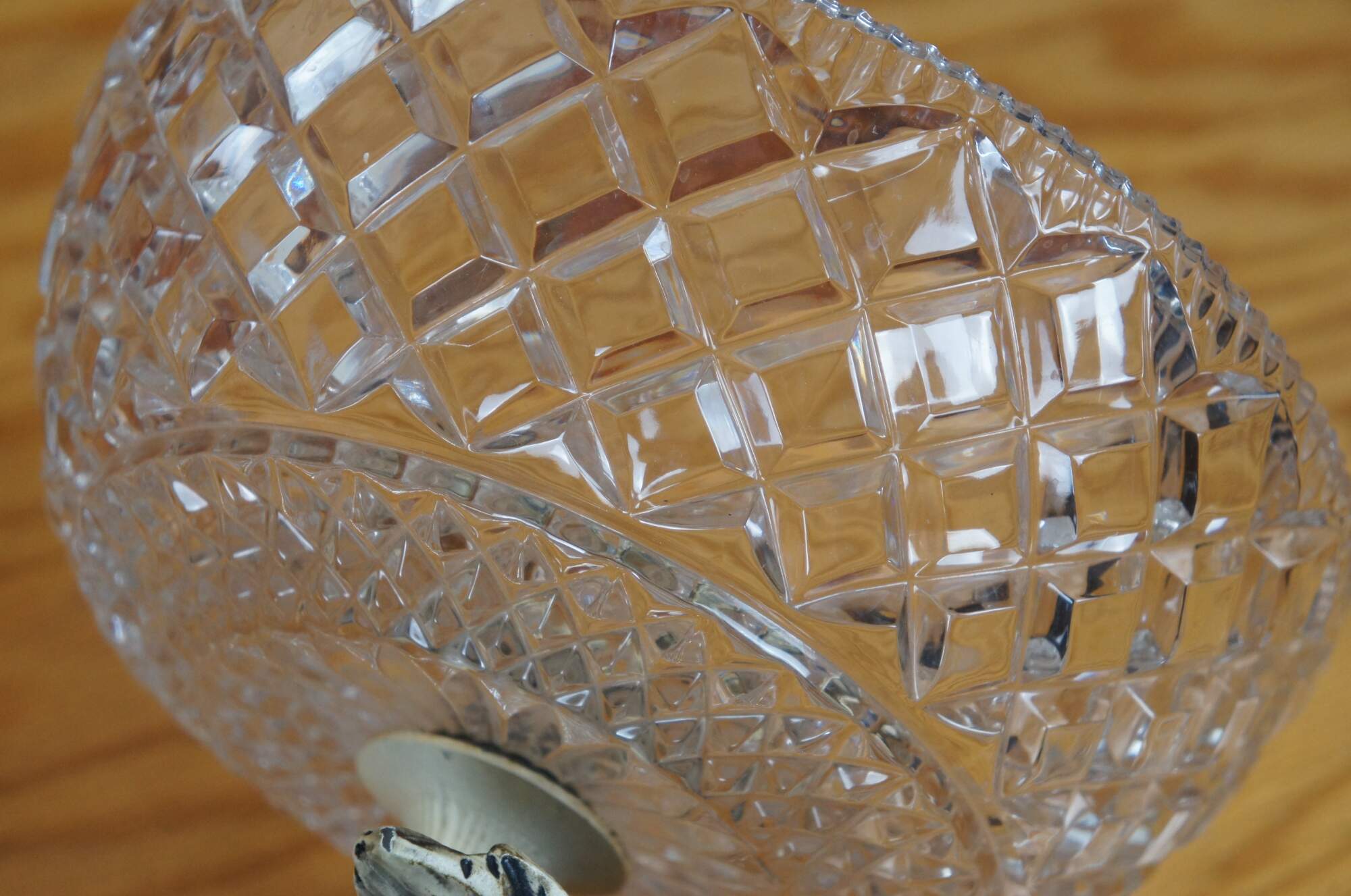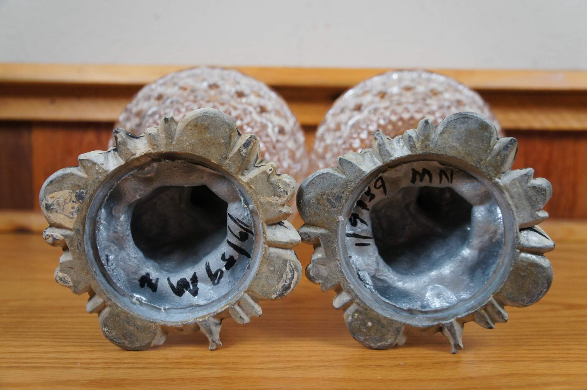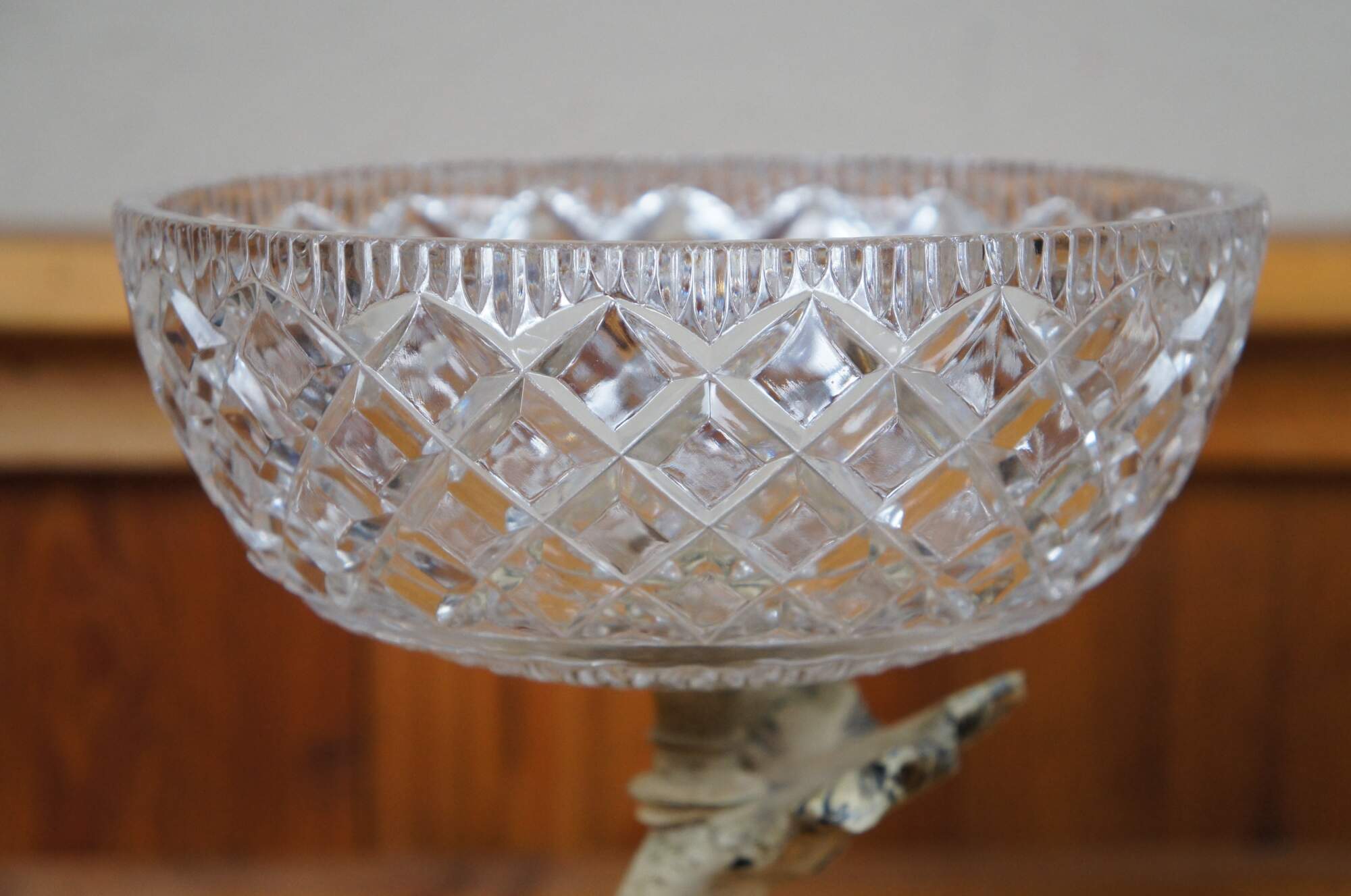 Pair of rare mid 20th century French Empire / Neoclassical compote bowls featuring cast metal pedestal bases in the shape of delphins / dolphins / fish, painted in off white, balancing cross cut crystal bowls on the tops of their tails. Base appears to read 1/9/1959.