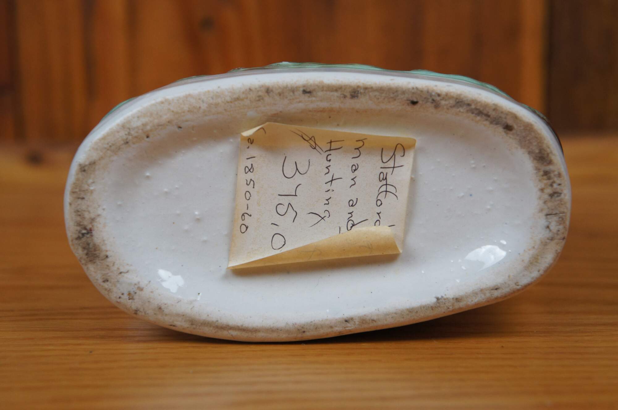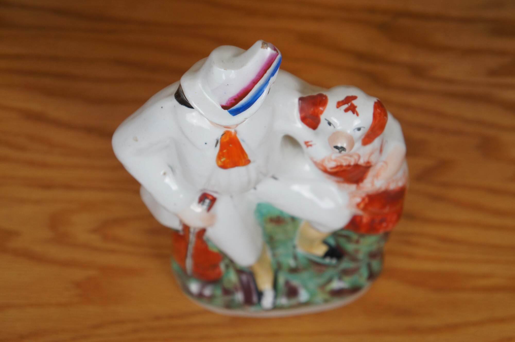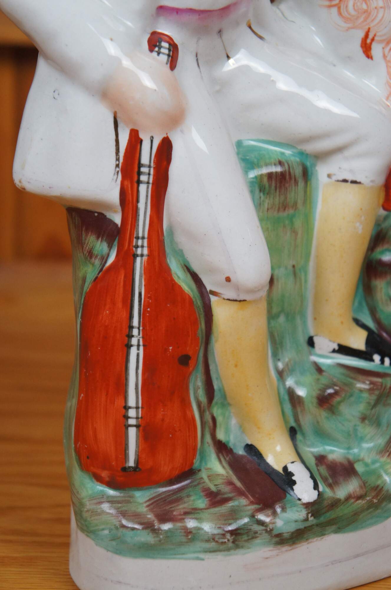 Antique 19th century Staffordshire porcelain flatback figurine in the shape of a man / minstrel or troubadour, holding a guitar / stringed instrument, seated on a mossy wall with a red and white dog, a King Charles spaniel.