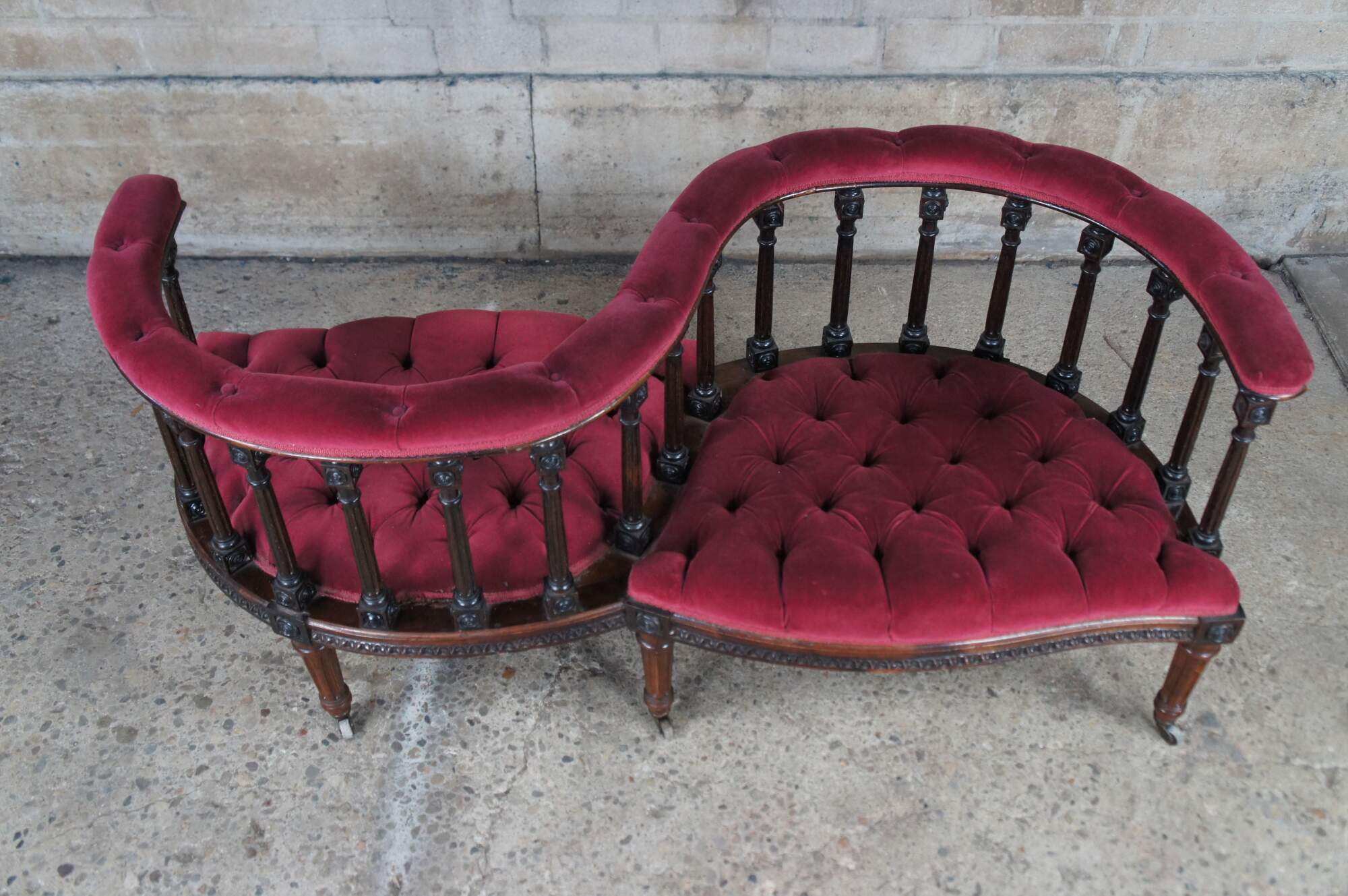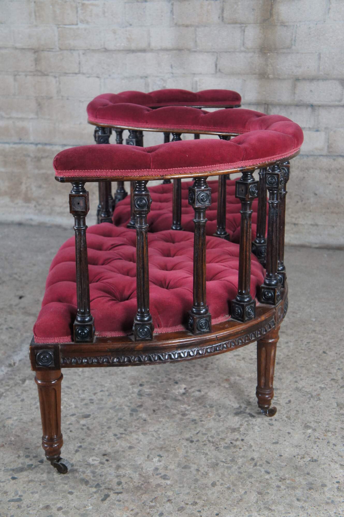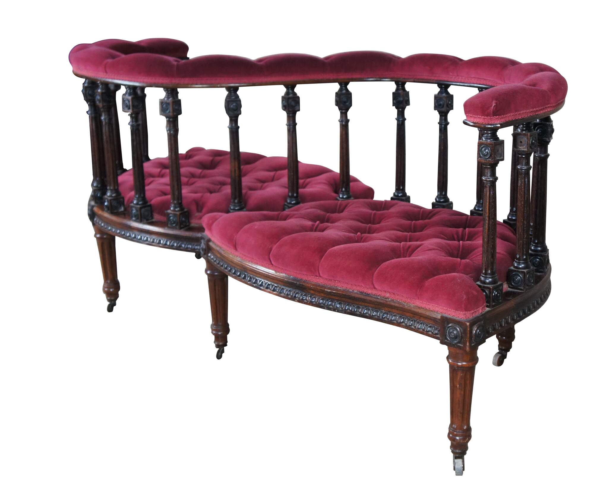 An Antique 19th Century French Louis XVI Style Tete A Tete Conversation Chair / Courting Bench. Made from Rosewood with an elaborate "S" form supported by turned and fluted columns terminating into block posts with round medallions on all four sides. The bench is upholstered in a red velvet upholstery with tufting. The aprons of the settee are carved with an elegant tulip pattern and supported by turned, tapered, fluted legs with arrow feet and casters.