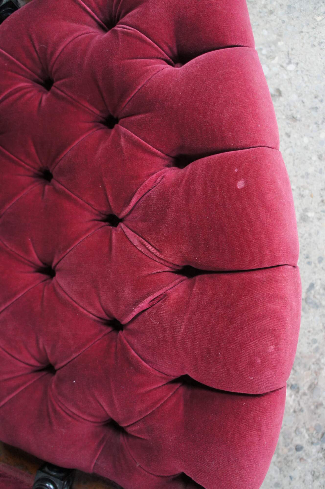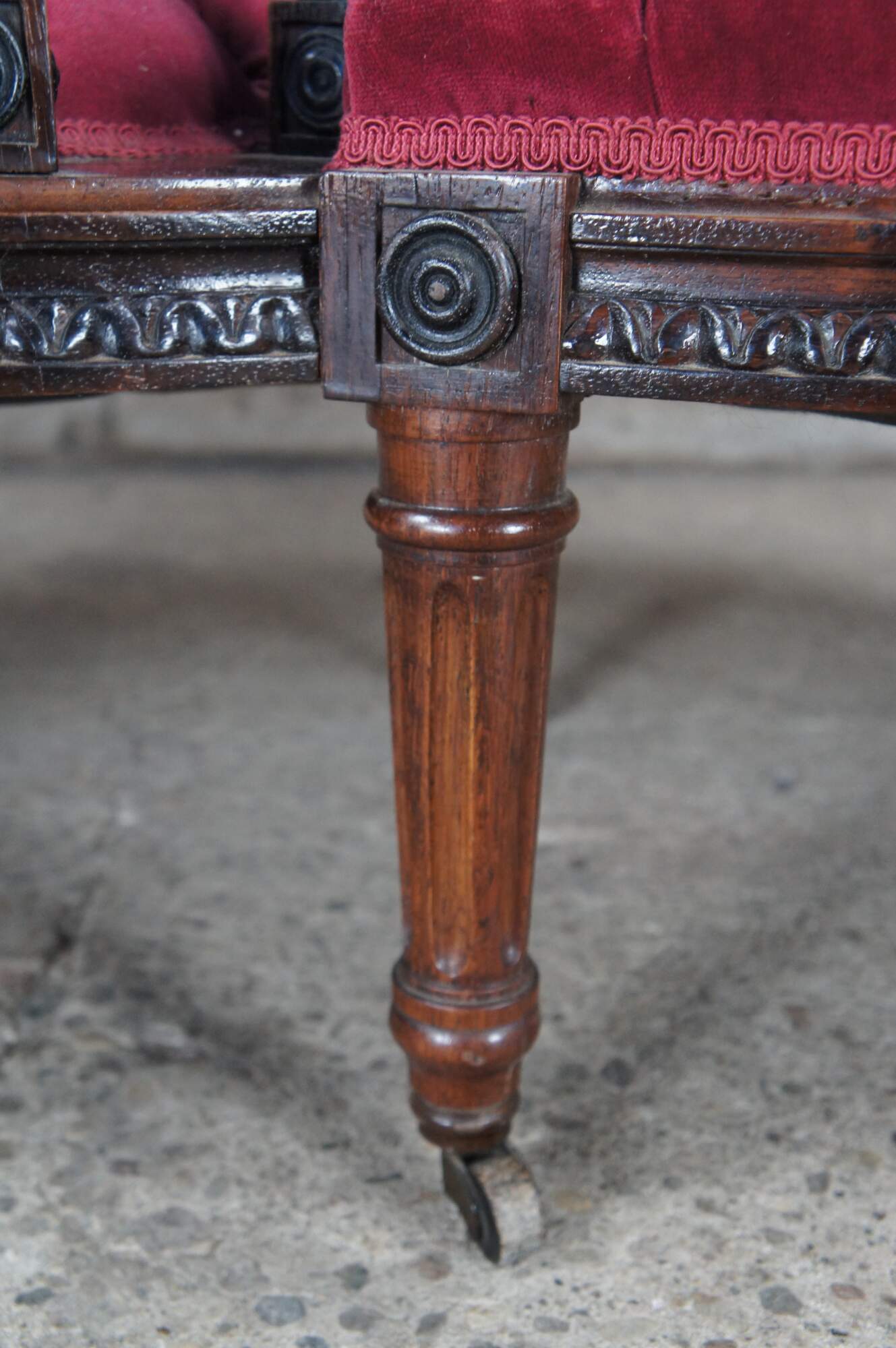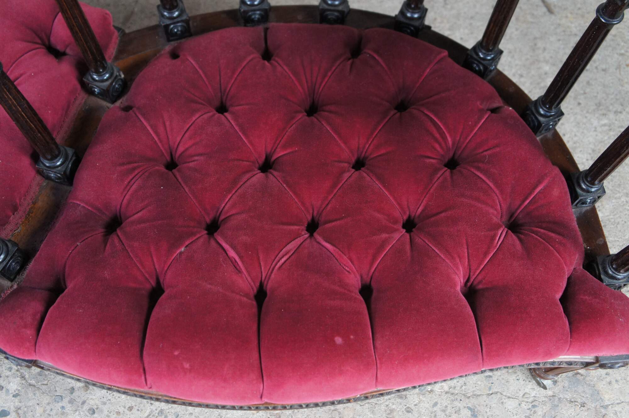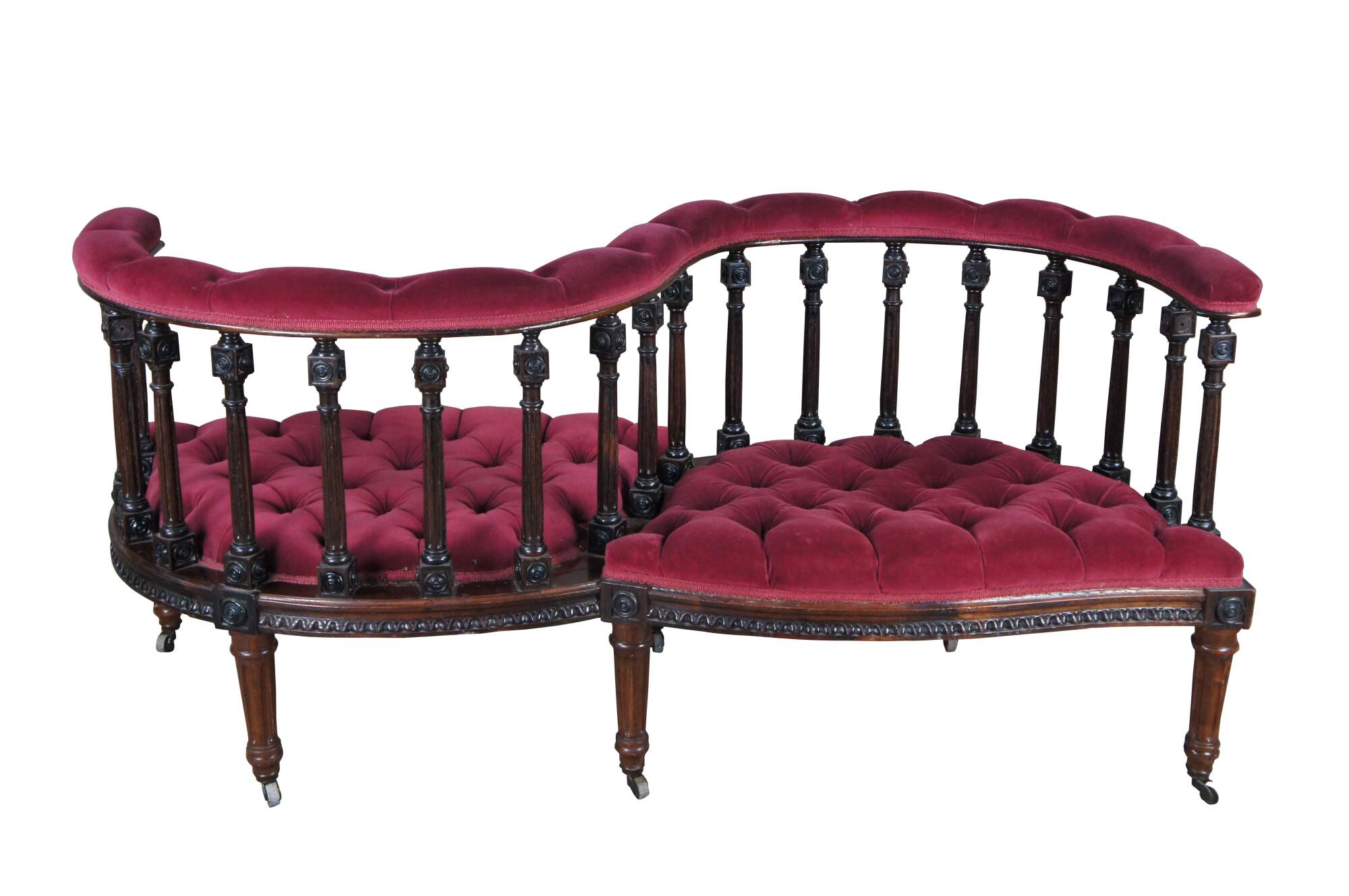 An Antique 19th Century French Louis XVI Style Tete A Tete Conversation Chair / Courting Bench. Made from Rosewood with an elaborate "S" form supported by turned and fluted columns terminating into block posts with round medallions on all four sides. The bench is upholstered in a red velvet upholstery with tufting. The aprons of the settee are carved with an elegant tulip pattern and supported by turned, tapered, fluted legs with arrow feet and casters.