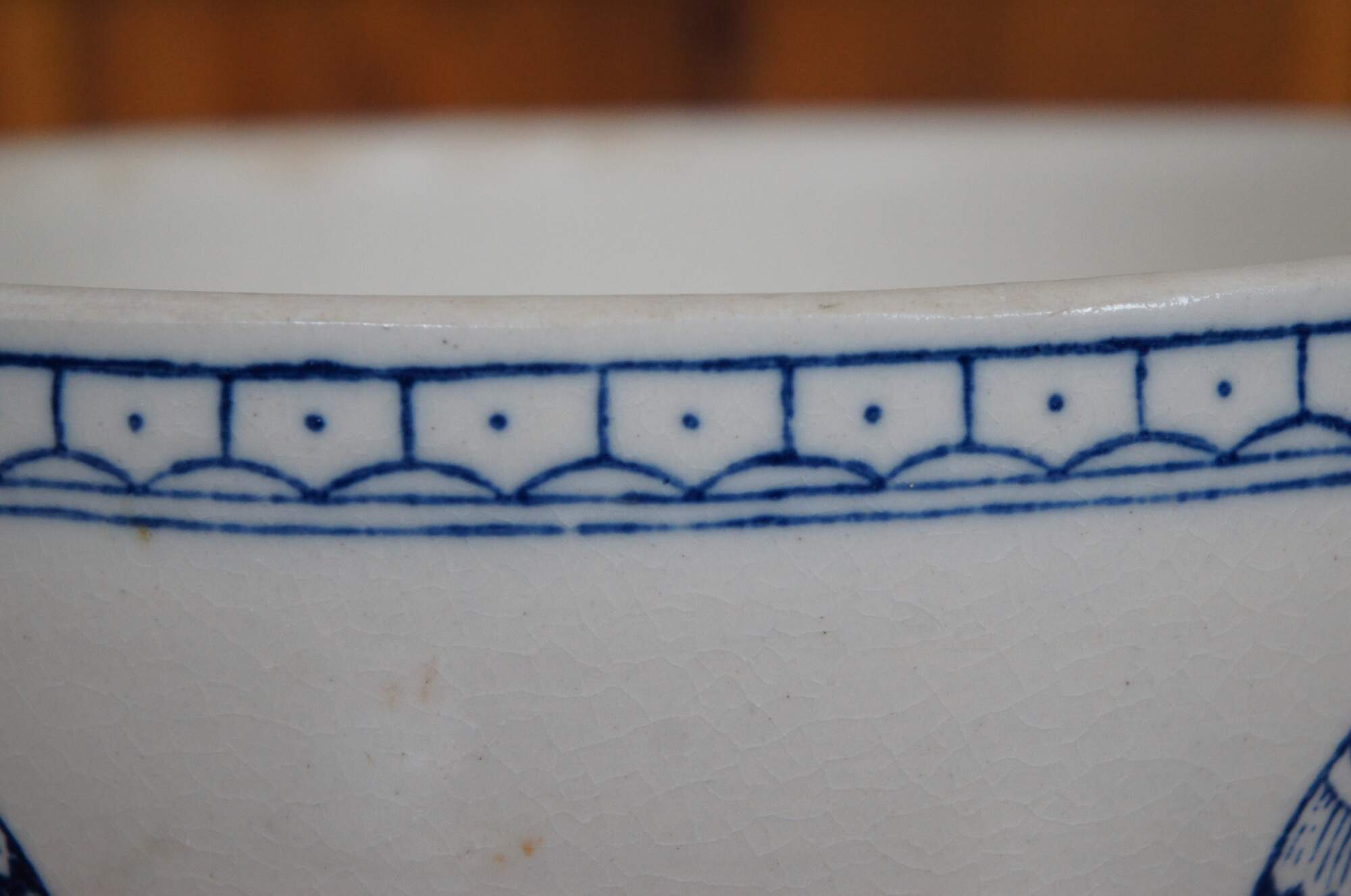 Vintage 20th century Lillian Vernon white porcelain Chinese chinoiserie farmhouse rice bowl decorated with medallions depicting blue herons / cranes / phoenix birds and a scalloped pattern around the upper edge.