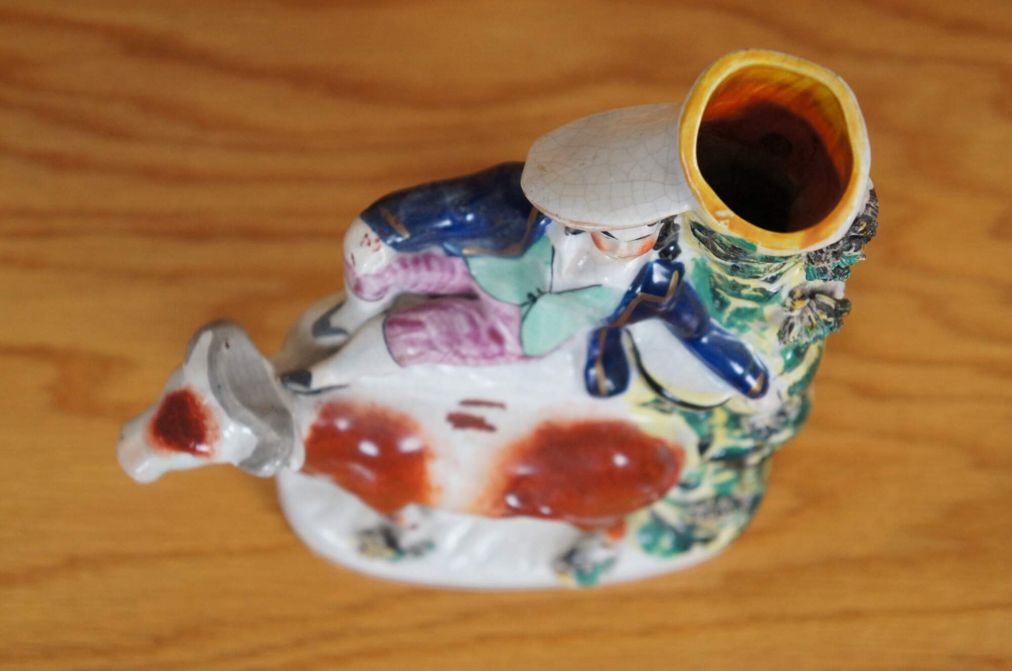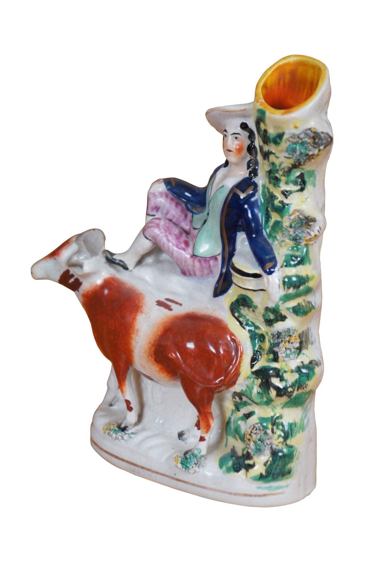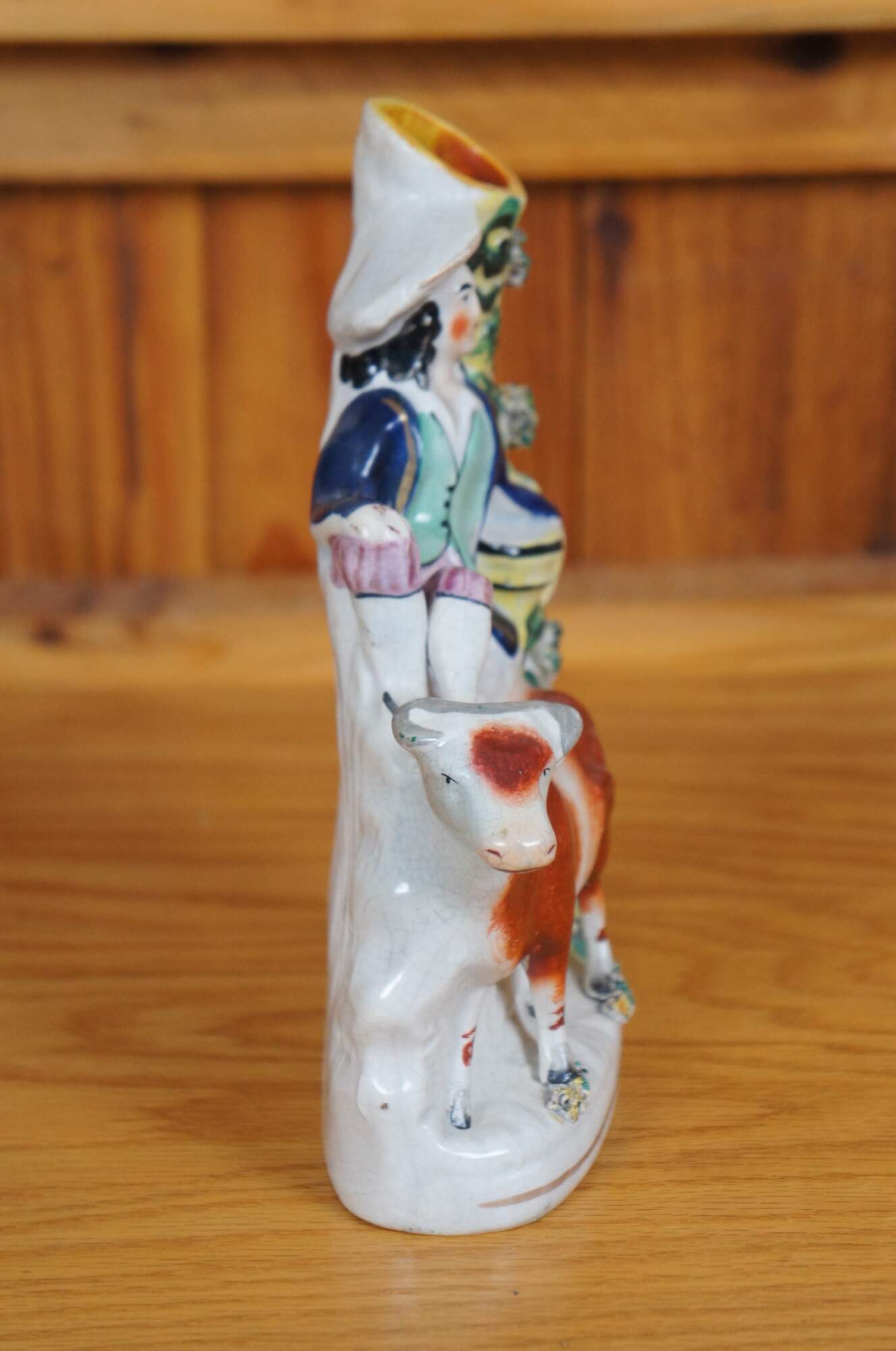 Antique 19th century Staffordshire porcelain flatback figural spill vase depicting a farmhouse scene with male figure recling against a tree with a red and white cow and milk bucket. This figurine was originally paired with a right facing milk maid.