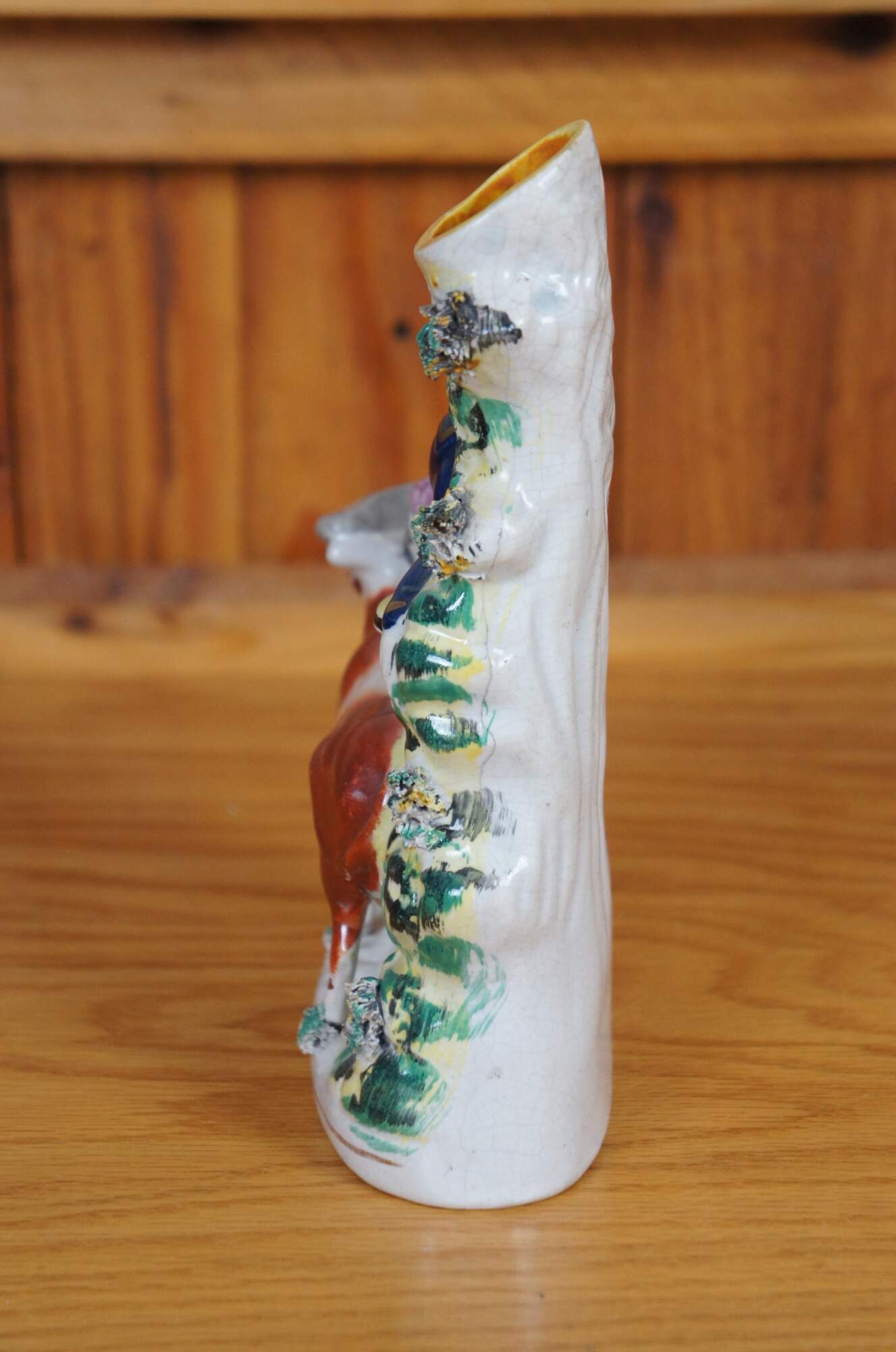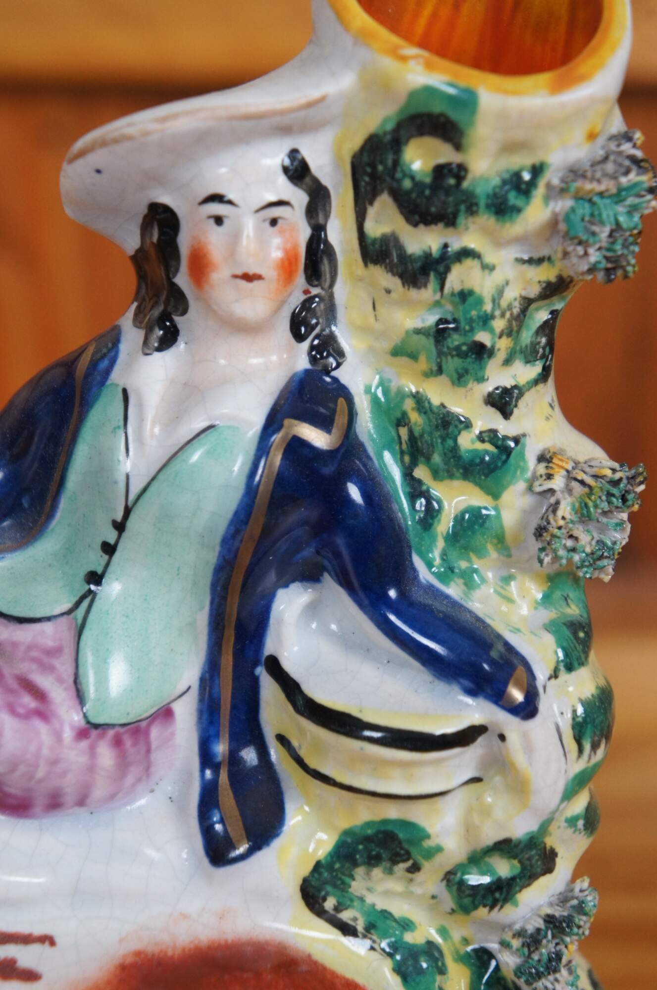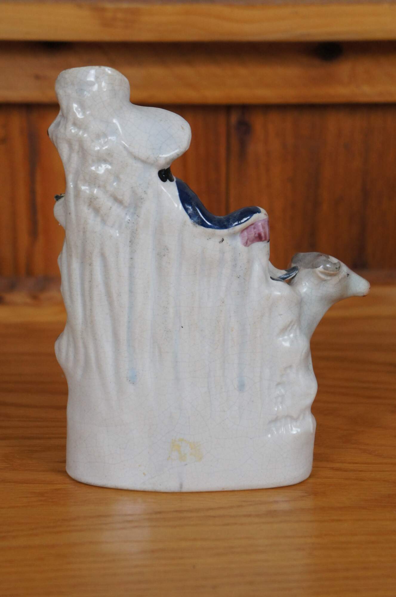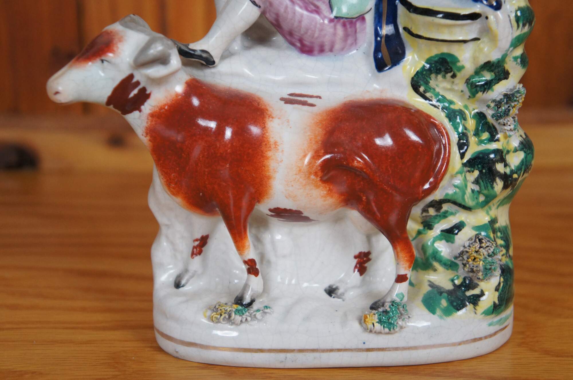 Antique 19th century Staffordshire porcelain flatback figural spill vase depicting a farmhouse scene with male figure recling against a tree with a red and white cow and milk bucket. This figurine was originally paired with a right facing milk maid.