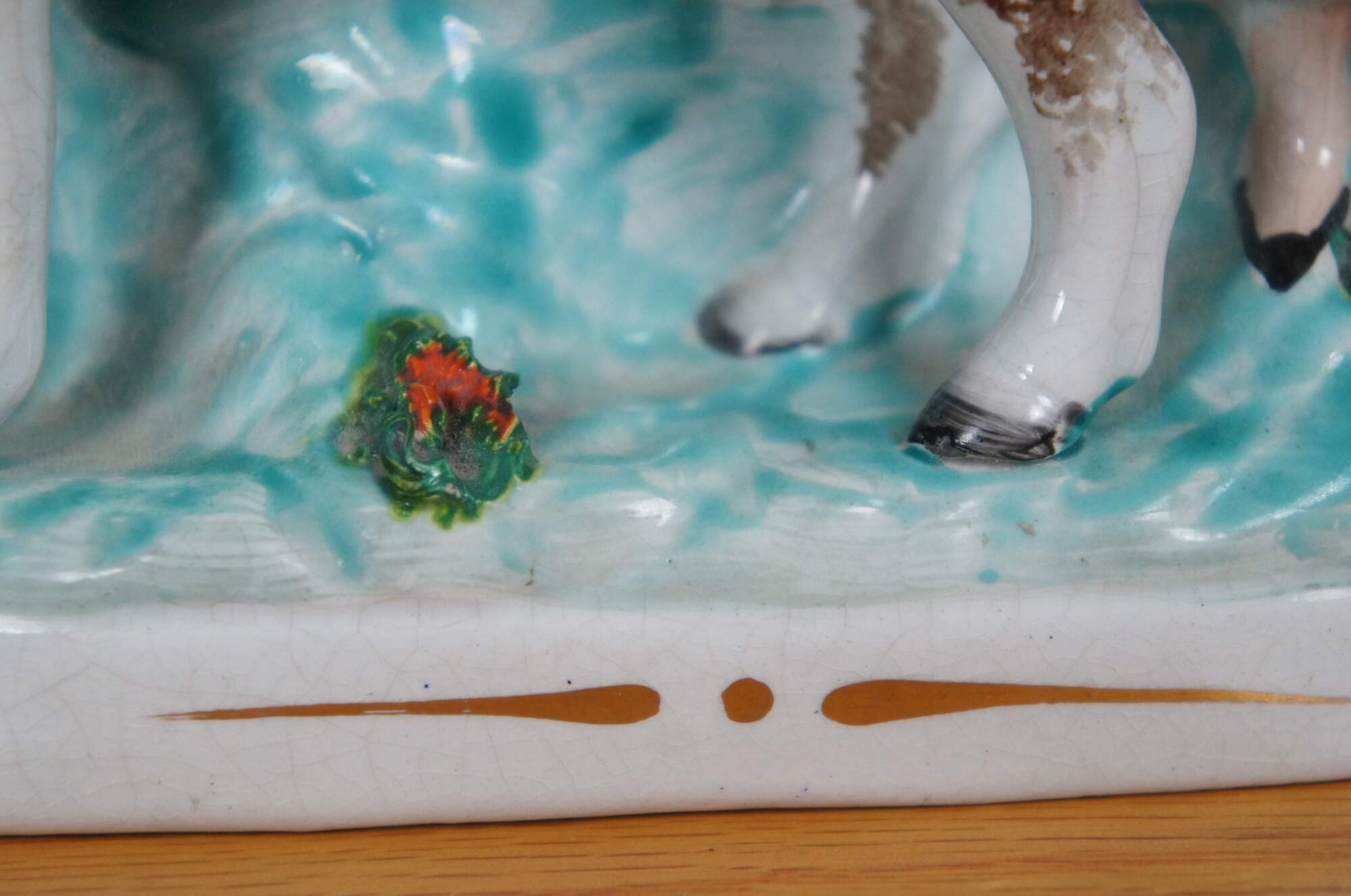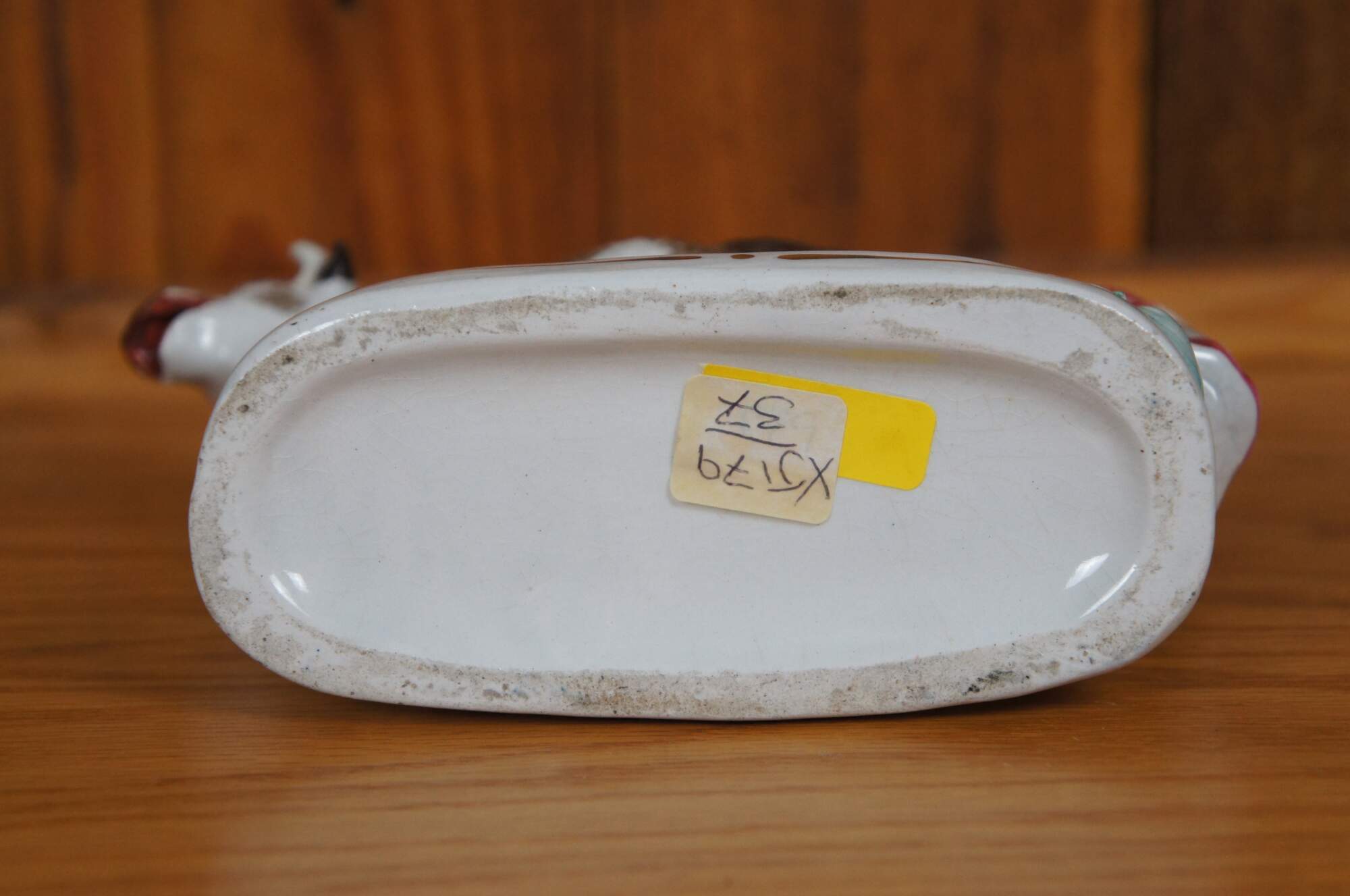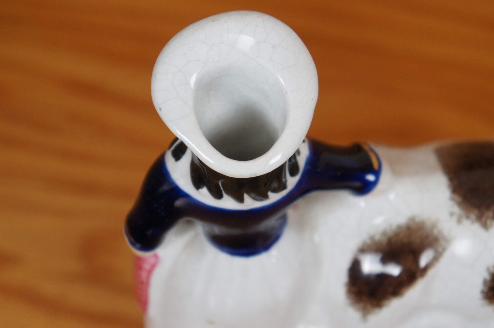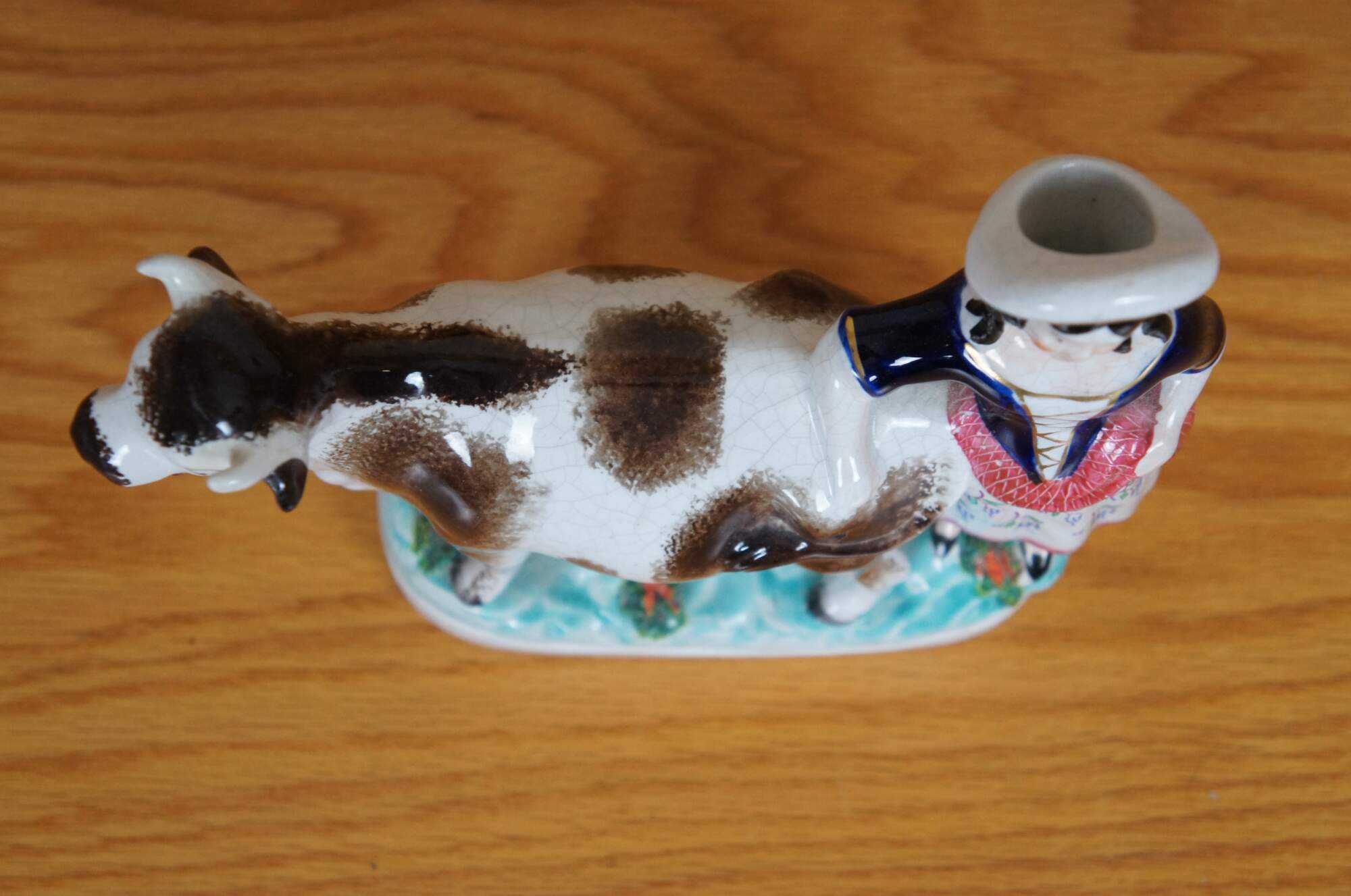 Antique 19th century staffordshire porcelain flatback figural spill vase or creamer in the shape of a woman with grapes on her skirt standing next to a very happy brown and white cown.