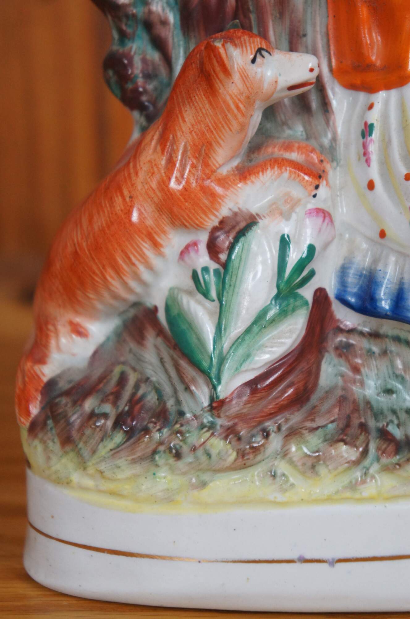Antique 19th century Staffordshire porcelain flatback figural spill vase depicting fairy tale figure Little Red Riding Hood and the wolf standing next to a tree.