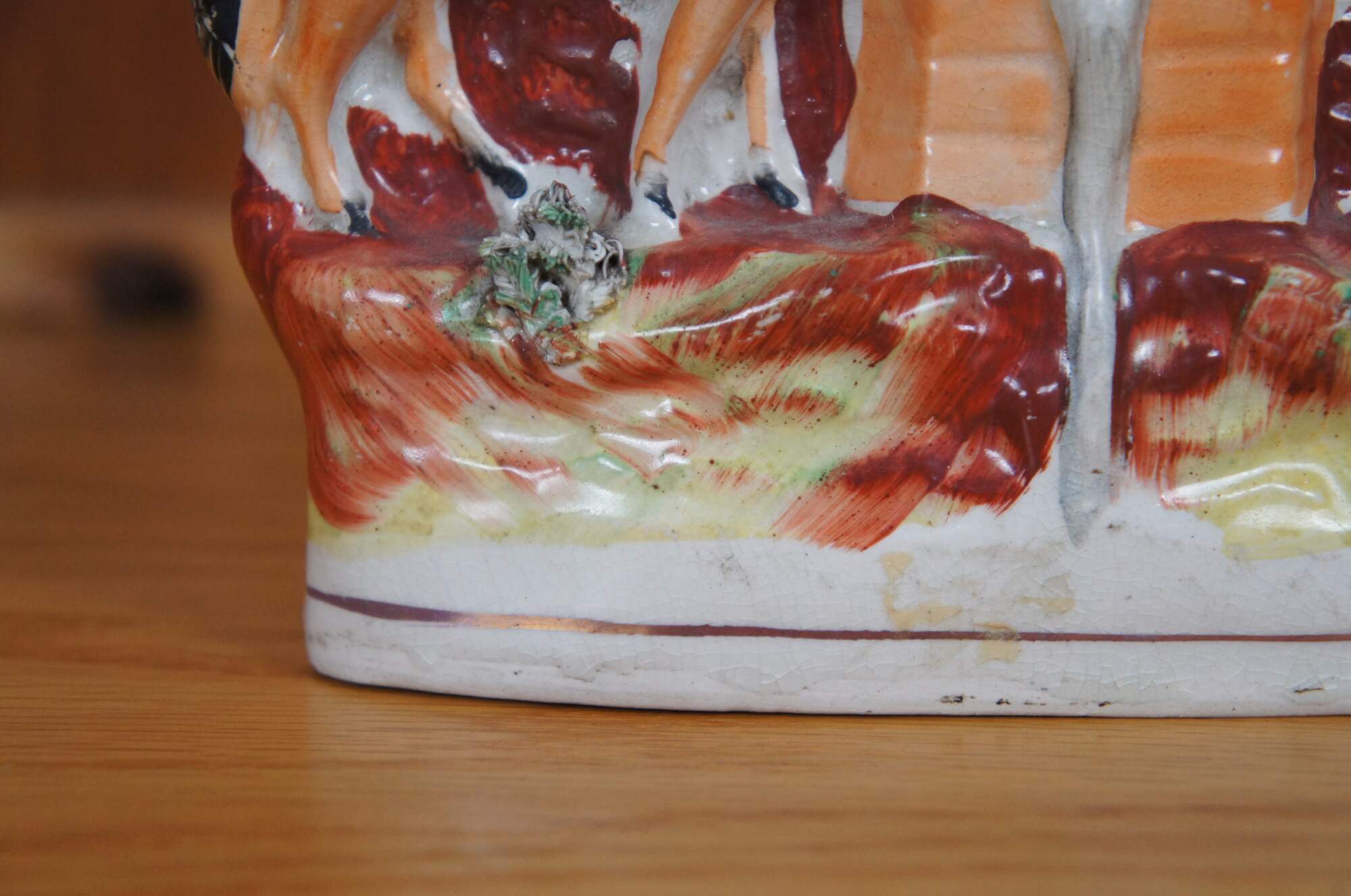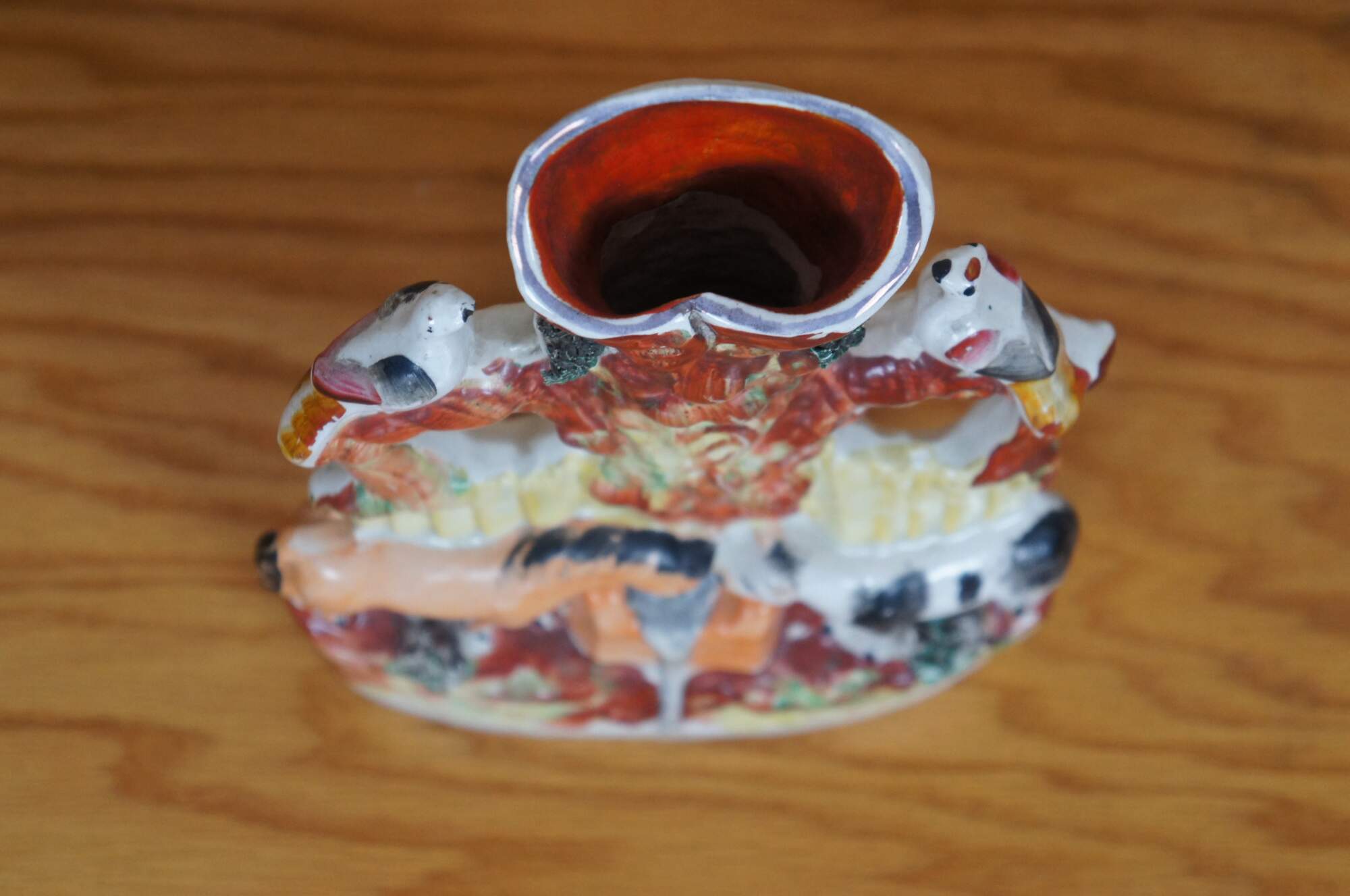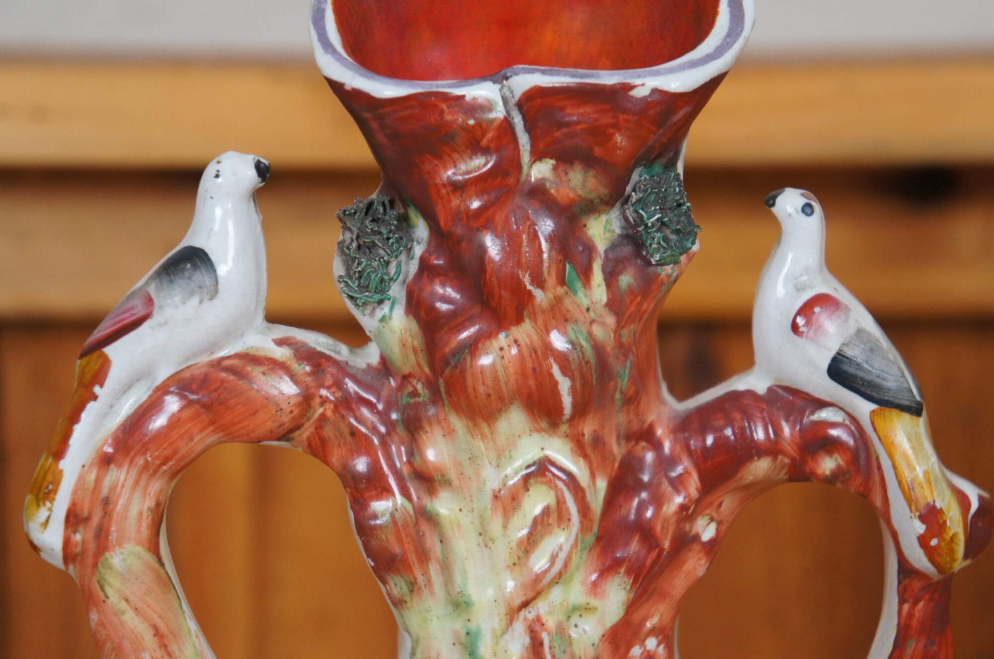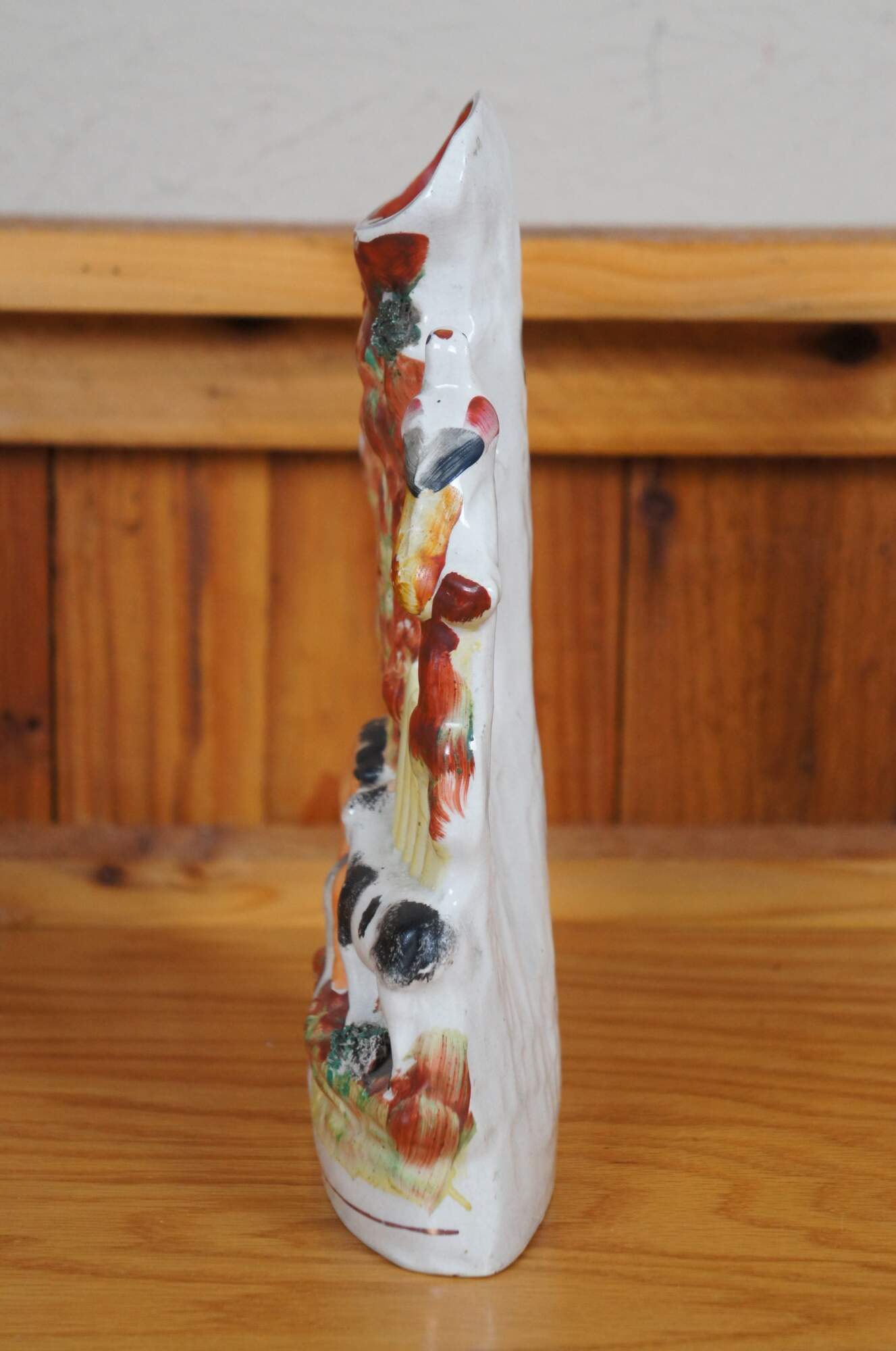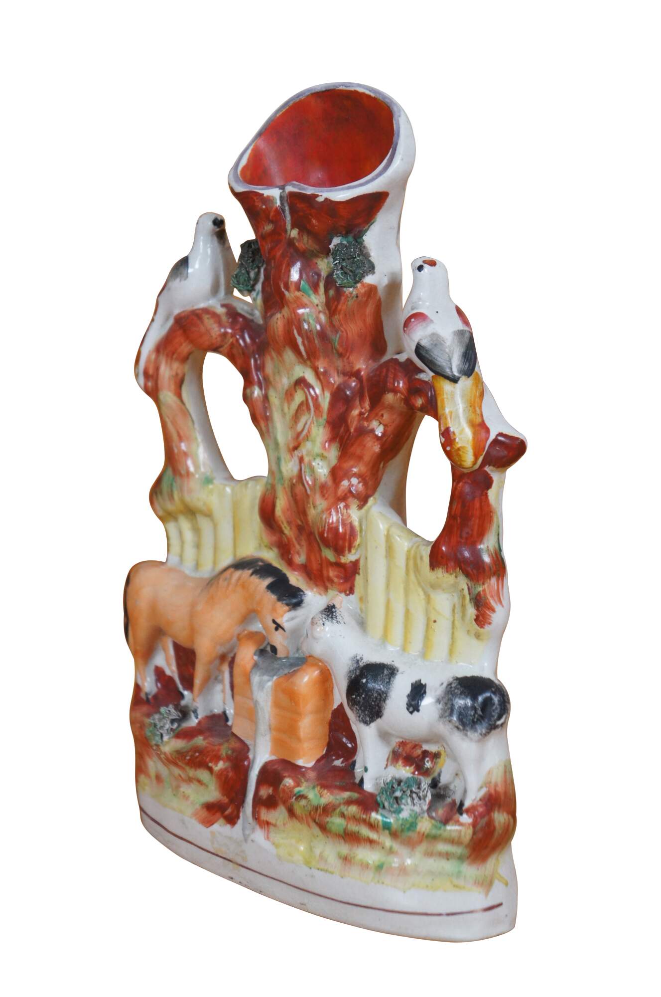 Antique 19th century Staffordshire porcelain flatback figural spill vase known as Good Companions - depicting a rural farm scene with horse and cow drinking together at an overflowing water trough or tree of life style fountain, at the base of a tree on whose curved branches perch a pair of birds. Circa 1870s.
