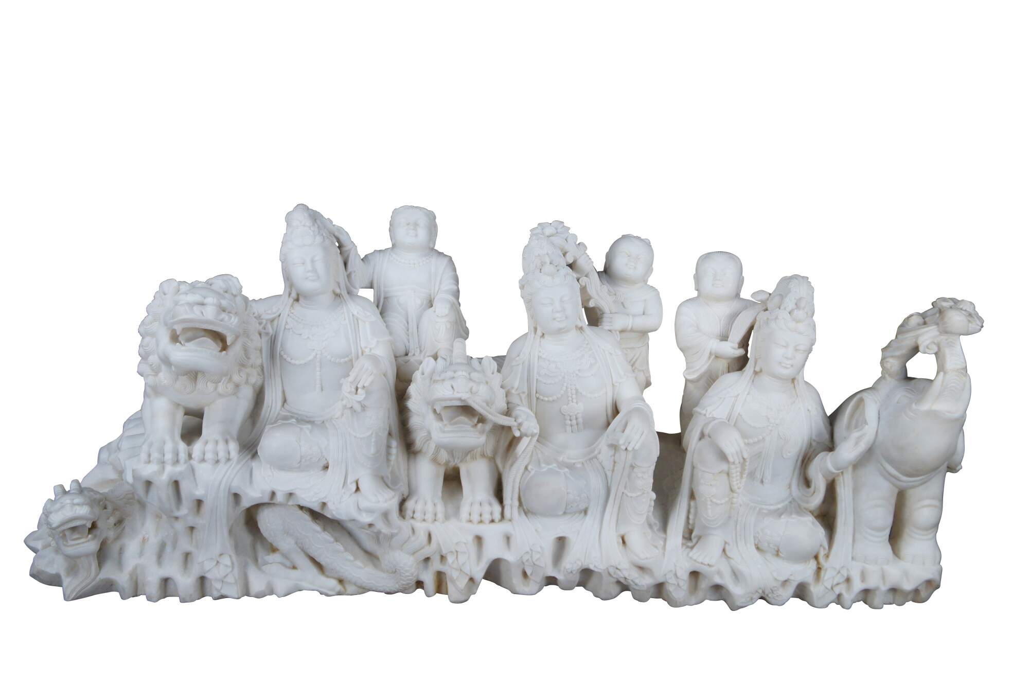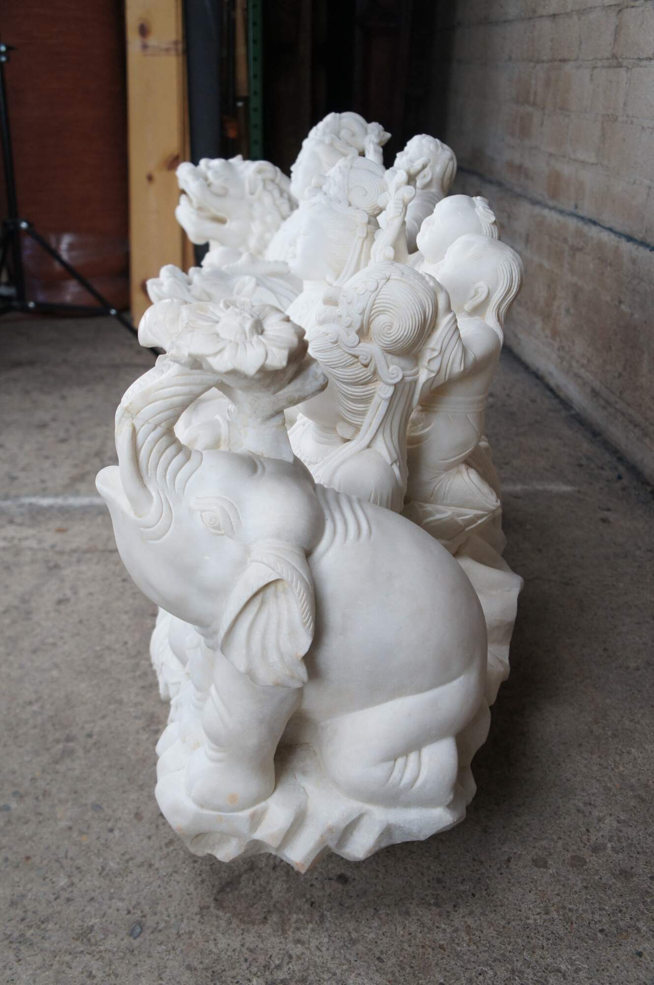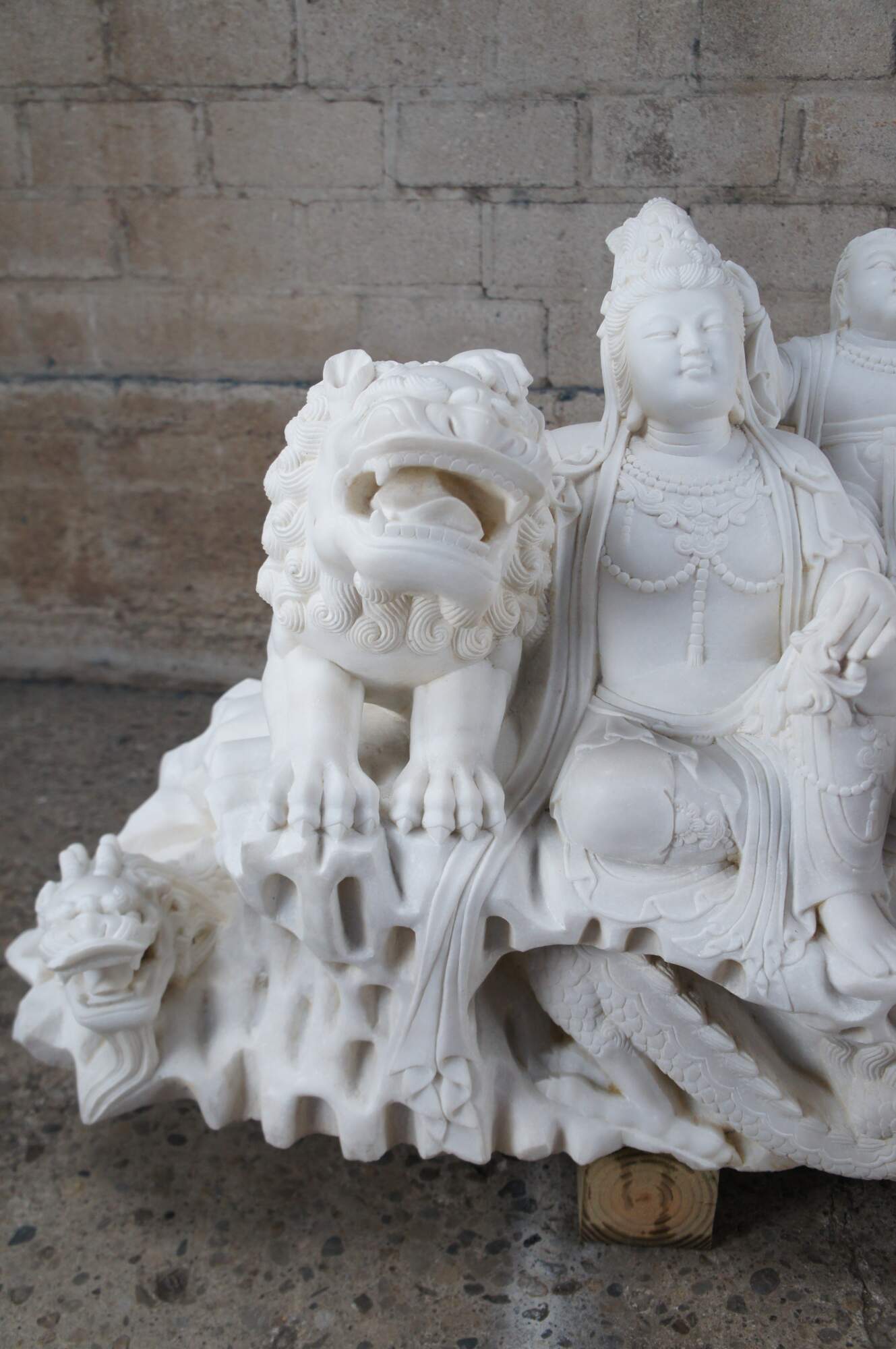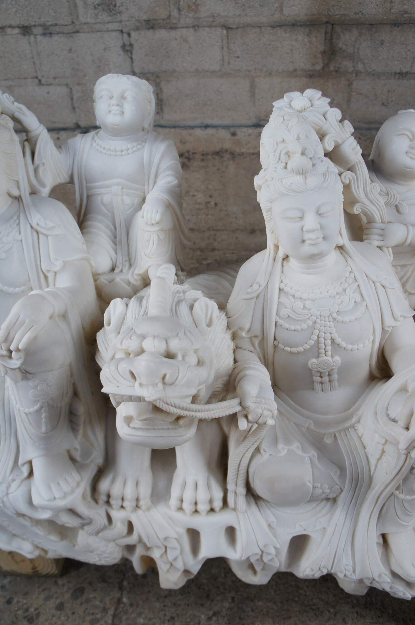Monumental rare antique hand carved marble Buddhist Shakyamuni Triad sculpture. The Shaka Triad was one of the earliest significant examples of a Buddhist sculpture. It was crafted from bronze and created during the Asuka period around 623 CE. This beautiful example is meticulously carved from marble and features a central rear figure of Shaka with lotus flower (also known as Shakyamuni Buddha), flanked by the Bodhisattvas Manjushri (Monju) and Samantabhadra (Fugen), who are shown as charming, childlike figures astride their respective animal vehicles. On the viewer’s right sits Manjushri the Bodhisattva of Wisdom with attenuated scepter. Along the left is Samantabhadra, the Bodhisattva of Benevolence, in a position of royal ease. Each of the spiritual leaders is shown in both a childlike figure and larger modern seated figures with headdress, jewelry and impressive robes. They are shown with their respective animal vehicles (Fu Dog / Fu Lions / Komainu and Elephant). The figures are set on a fluffy cloud with a dragon piercing through the lower left edge. This sculpture is a true masterpiece that will instantly become the focal point of any space. The sculpture was brought to American in the 1800s. It weighs Approximately 1000lbs. Due to its weight this piece requires a pallet jack or forklift for unloading and positioning.