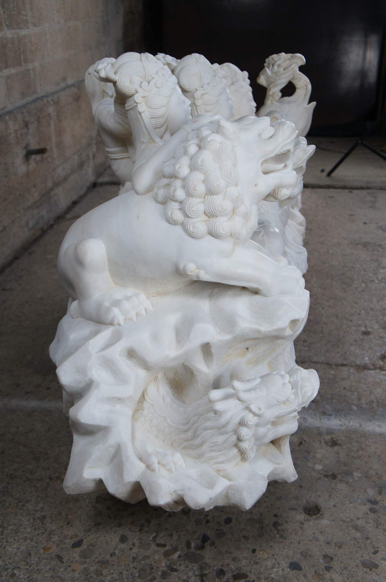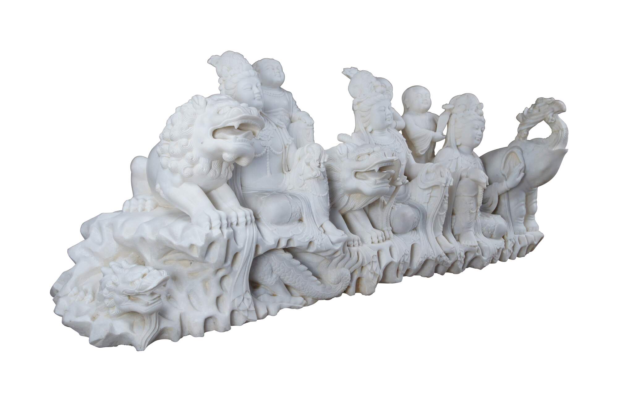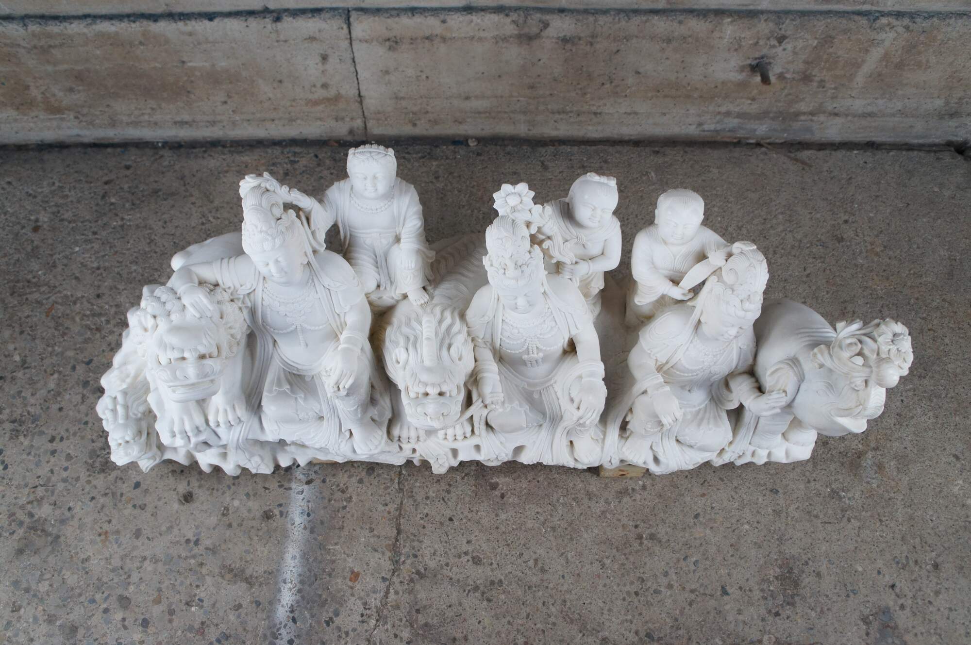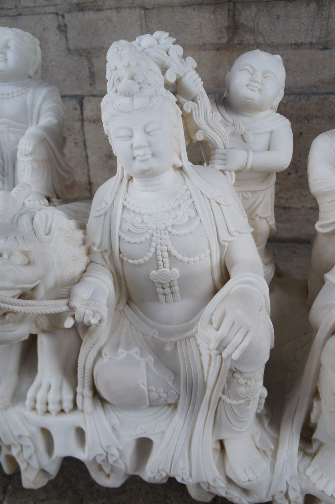 Monumental rare antique hand carved marble Buddhist Shakyamuni Triad sculpture. The Shaka Triad was one of the earliest significant examples of a Buddhist sculpture. It was crafted from bronze and created during the Asuka period around 623 CE. This beautiful example is meticulously carved from marble and features a central rear figure of Shaka with lotus flower (also known as Shakyamuni Buddha), flanked by the Bodhisattvas Manjushri (Monju) and Samantabhadra (Fugen), who are shown as charming, childlike figures astride their respective animal vehicles. On the viewer’s right sits Manjushri the Bodhisattva of Wisdom with attenuated scepter. Along the left is Samantabhadra, the Bodhisattva of Benevolence, in a position of royal ease. Each of the spiritual leaders is shown in both a childlike figure and larger modern seated figures with headdress, jewelry and impressive robes. They are shown with their respective animal vehicles (Fu Dog / Fu Lions / Komainu and Elephant). The figures are set on a fluffy cloud with a dragon piercing through the lower left edge. This sculpture is a true masterpiece that will instantly become the focal point of any space. The sculpture was brought to American in the 1800s. It weighs Approximately 1000lbs. Due to its weight this piece requires a pallet jack or forklift for unloading and positioning.