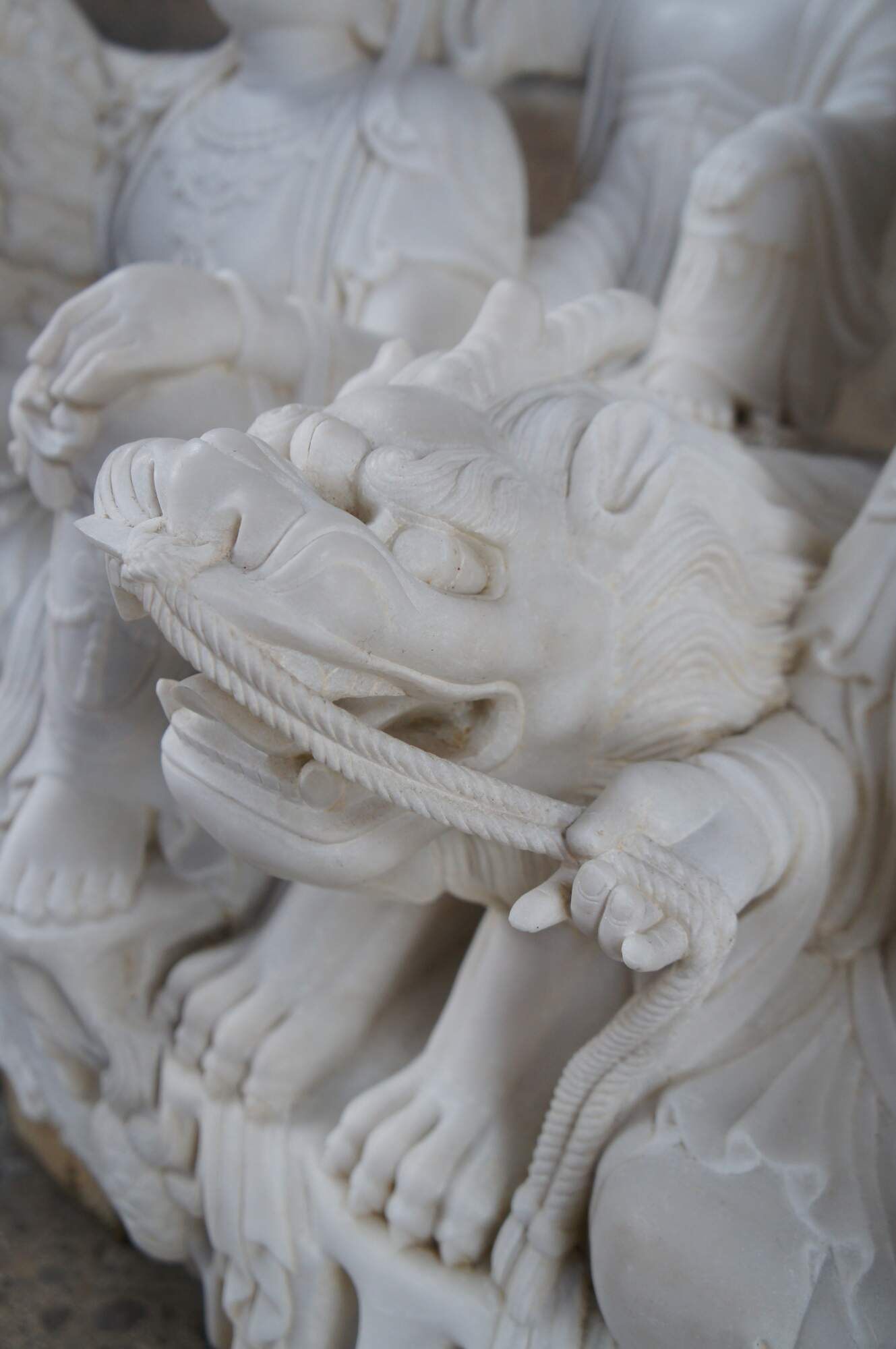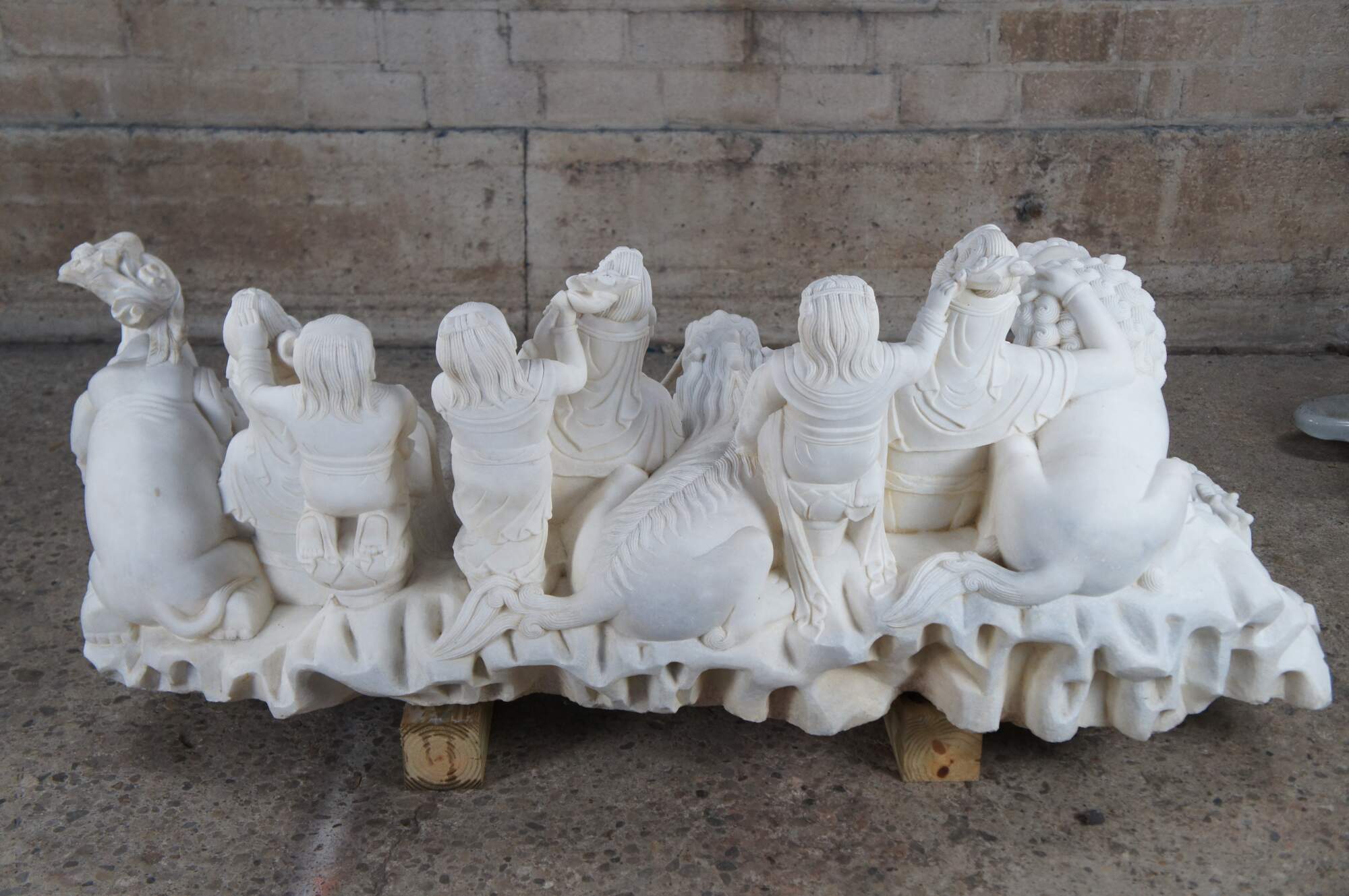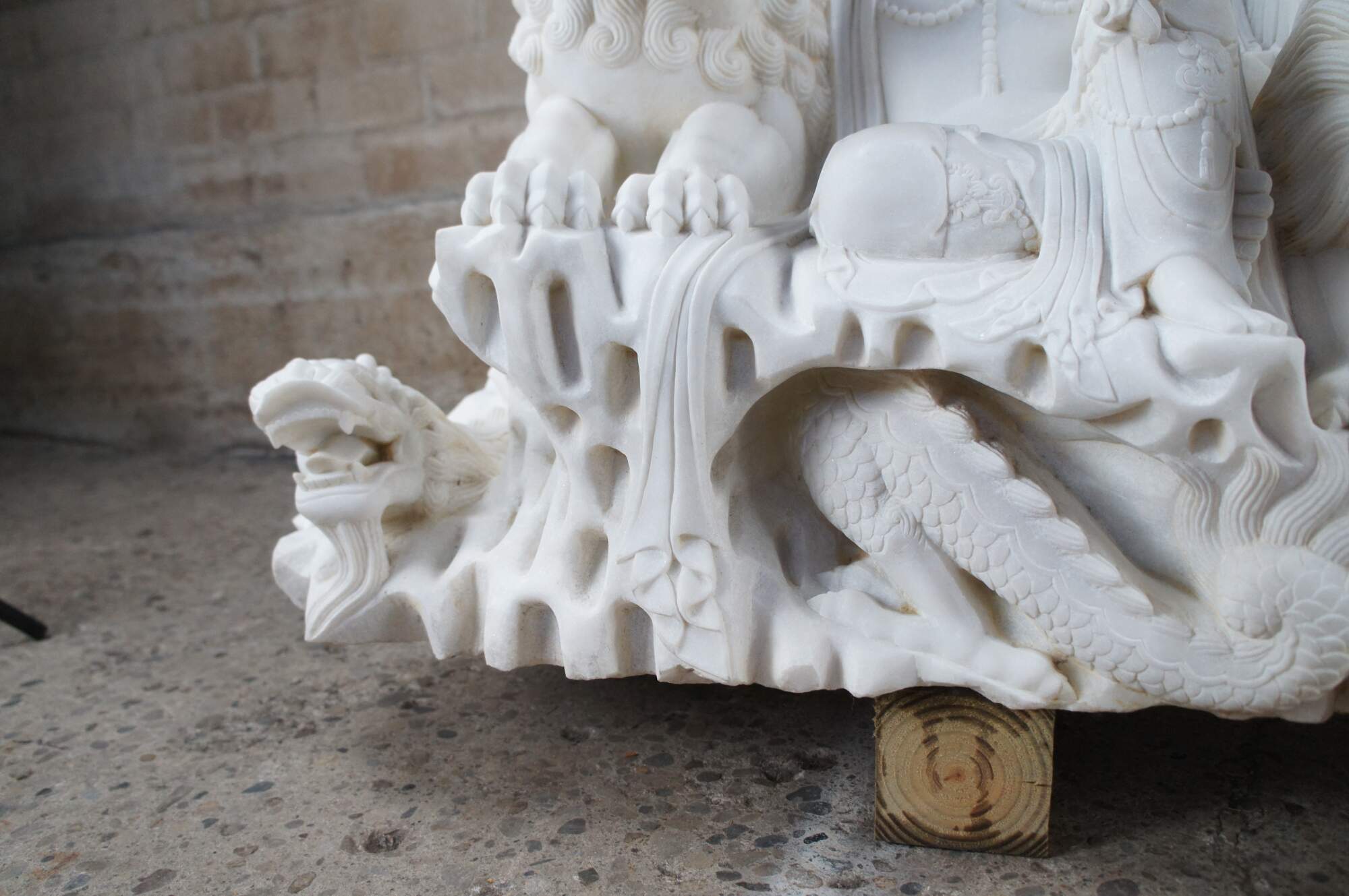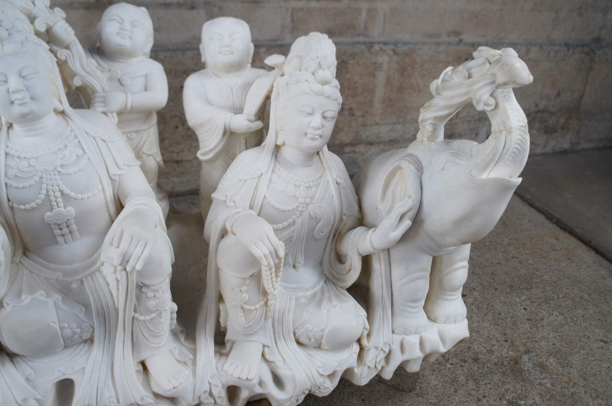 Monumental rare antique hand carved marble Buddhist Shakyamuni Triad sculpture. The Shaka Triad was one of the earliest significant examples of a Buddhist sculpture. It was crafted from bronze and created during the Asuka period around 623 CE. This beautiful example is meticulously carved from marble and features a central rear figure of Shaka with lotus flower (also known as Shakyamuni Buddha), flanked by the Bodhisattvas Manjushri (Monju) and Samantabhadra (Fugen), who are shown as charming, childlike figures astride their respective animal vehicles. On the viewer’s right sits Manjushri the Bodhisattva of Wisdom with attenuated scepter. Along the left is Samantabhadra, the Bodhisattva of Benevolence, in a position of royal ease. Each of the spiritual leaders is shown in both a childlike figure and larger modern seated figures with headdress, jewelry and impressive robes. They are shown with their respective animal vehicles (Fu Dog / Fu Lions / Komainu and Elephant). The figures are set on a fluffy cloud with a dragon piercing through the lower left edge. This sculpture is a true masterpiece that will instantly become the focal point of any space. The sculpture was brought to American in the 1800s. It weighs Approximately 1000lbs. Due to its weight this piece requires a pallet jack or forklift for unloading and positioning.