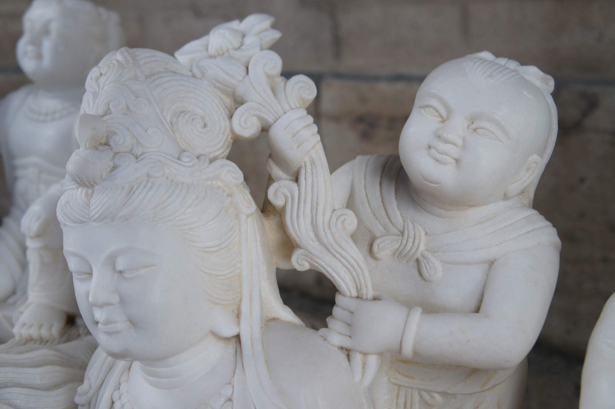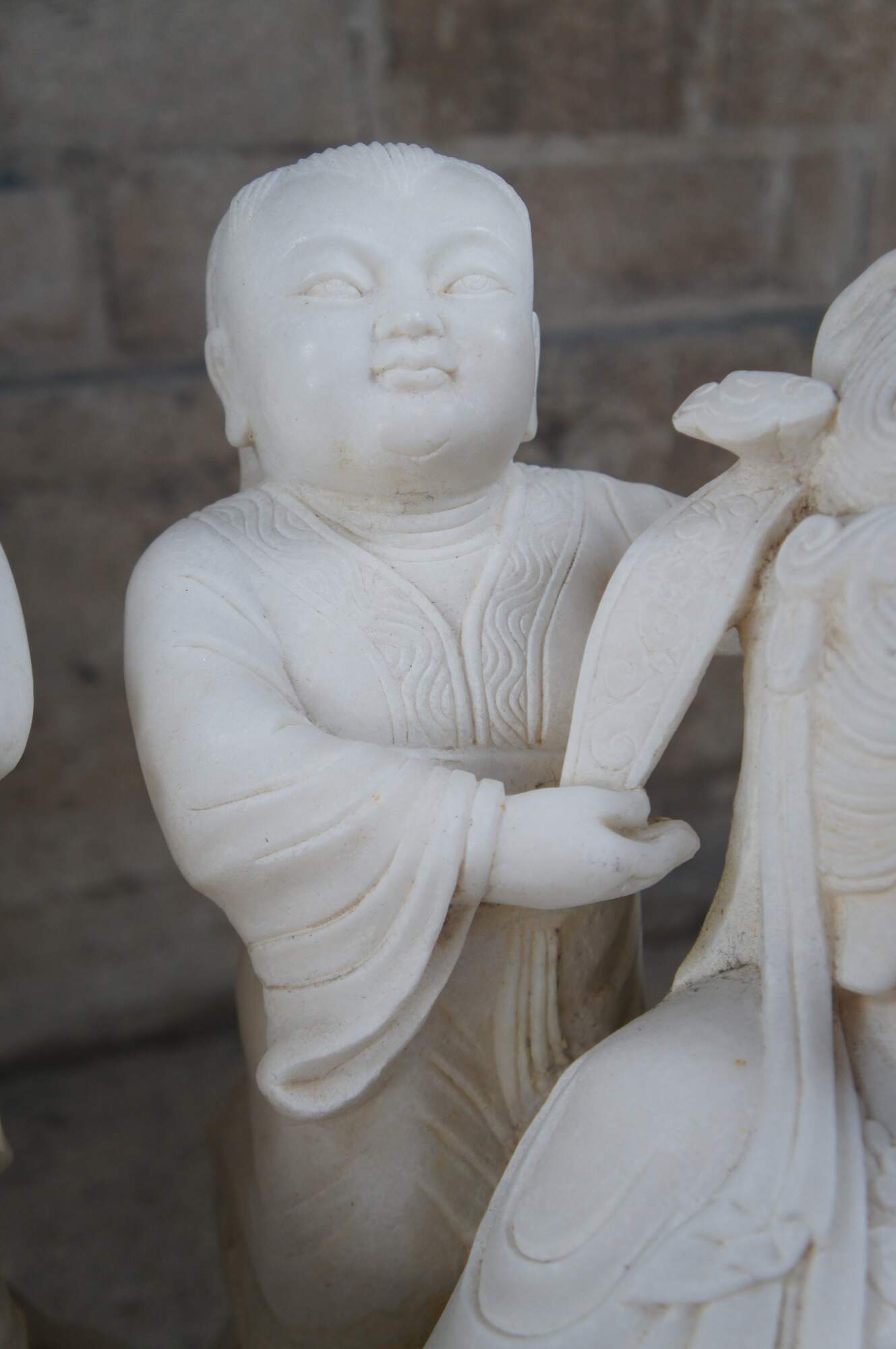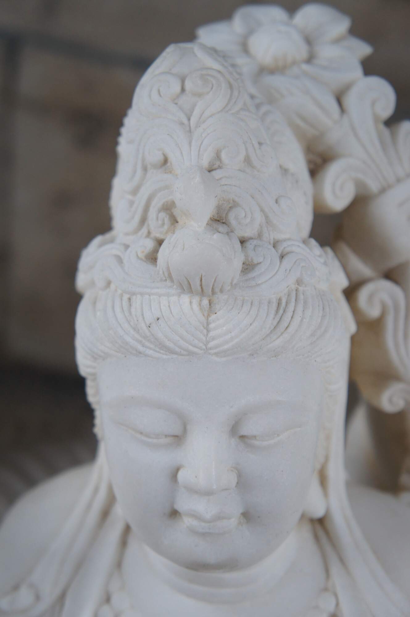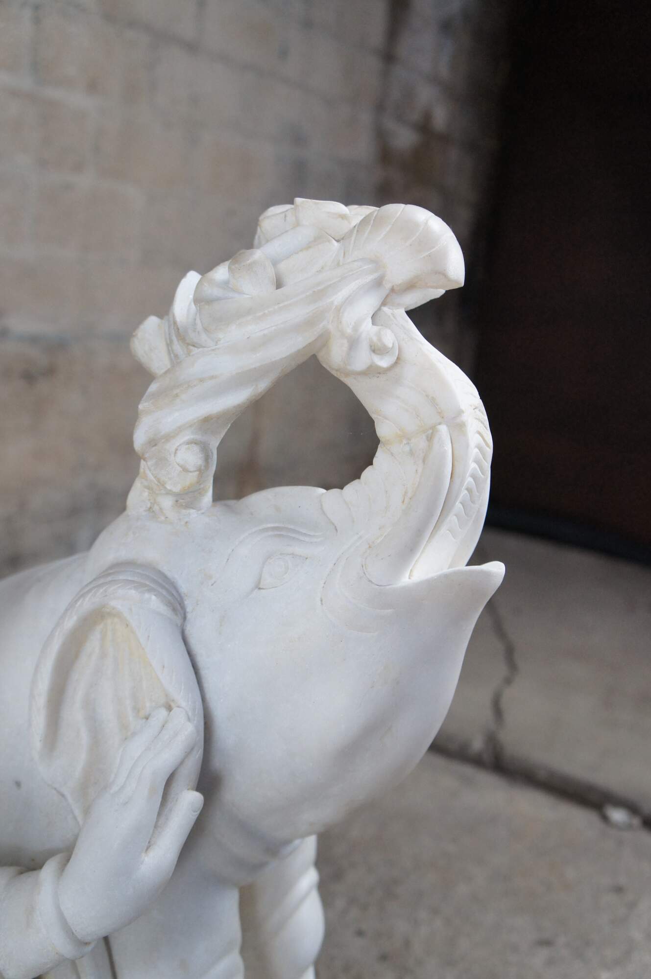 Monumental rare antique hand carved marble Buddhist Shakyamuni Triad sculpture. The Shaka Triad was one of the earliest significant examples of a Buddhist sculpture. It was crafted from bronze and created during the Asuka period around 623 CE. This beautiful example is meticulously carved from marble and features a central rear figure of Shaka with lotus flower (also known as Shakyamuni Buddha), flanked by the Bodhisattvas Manjushri (Monju) and Samantabhadra (Fugen), who are shown as charming, childlike figures astride their respective animal vehicles. On the viewer’s right sits Manjushri the Bodhisattva of Wisdom with attenuated scepter. Along the left is Samantabhadra, the Bodhisattva of Benevolence, in a position of royal ease. Each of the spiritual leaders is shown in both a childlike figure and larger modern seated figures with headdress, jewelry and impressive robes. They are shown with their respective animal vehicles (Fu Dog / Fu Lions / Komainu and Elephant). The figures are set on a fluffy cloud with a dragon piercing through the lower left edge. This sculpture is a true masterpiece that will instantly become the focal point of any space. The sculpture was brought to American in the 1800s. It weighs Approximately 1000lbs. Due to its weight this piece requires a pallet jack or forklift for unloading and positioning.