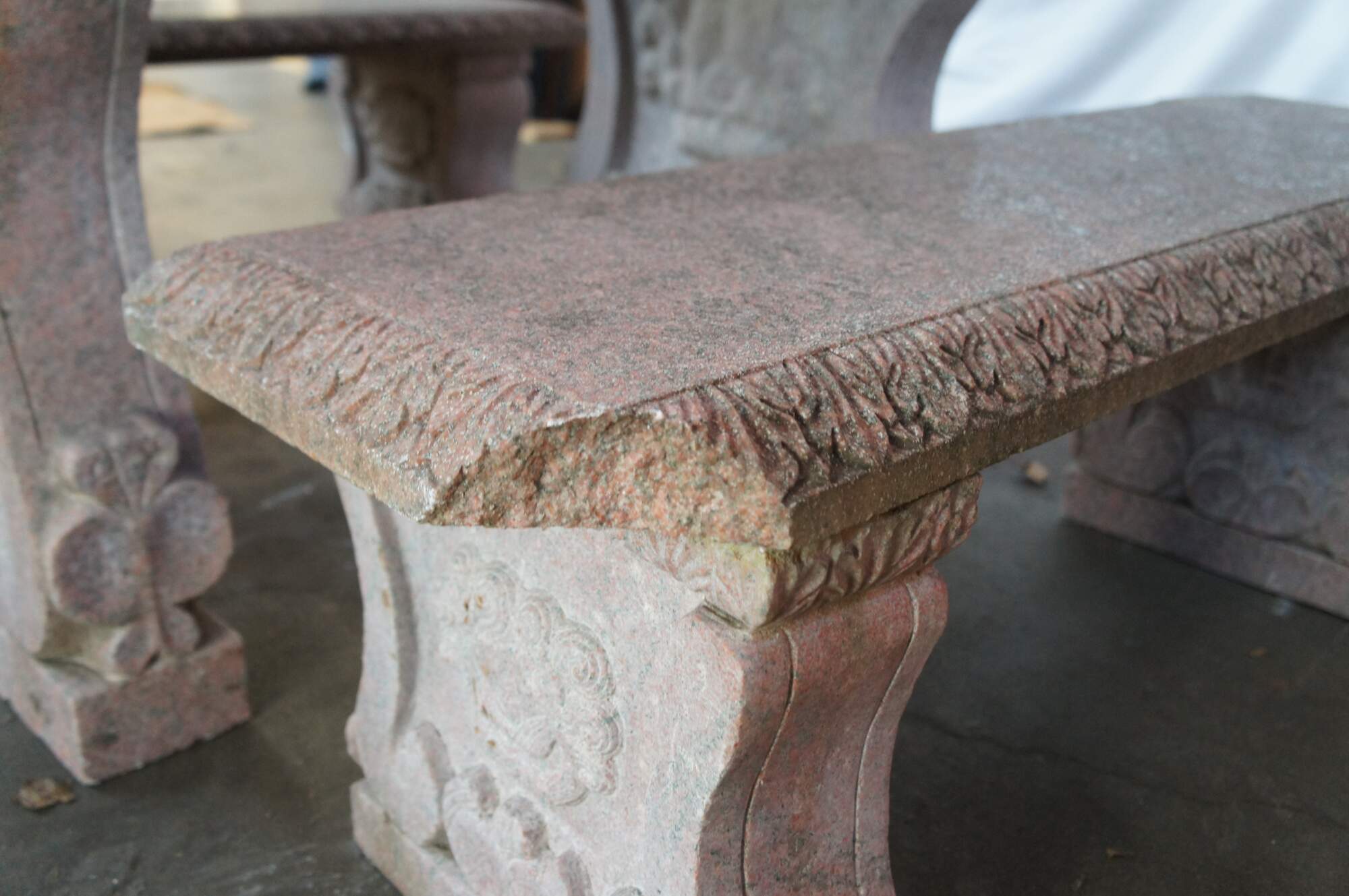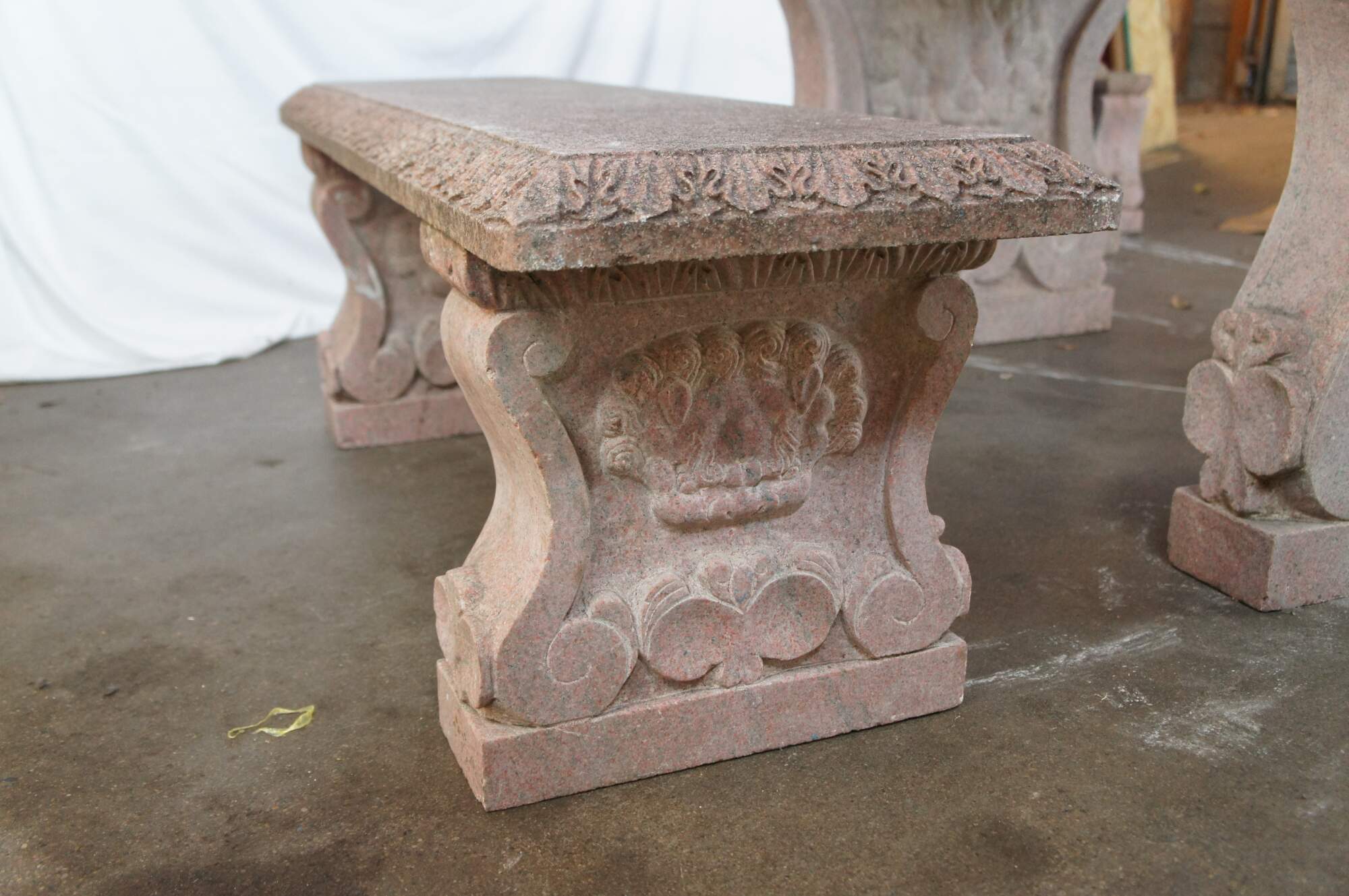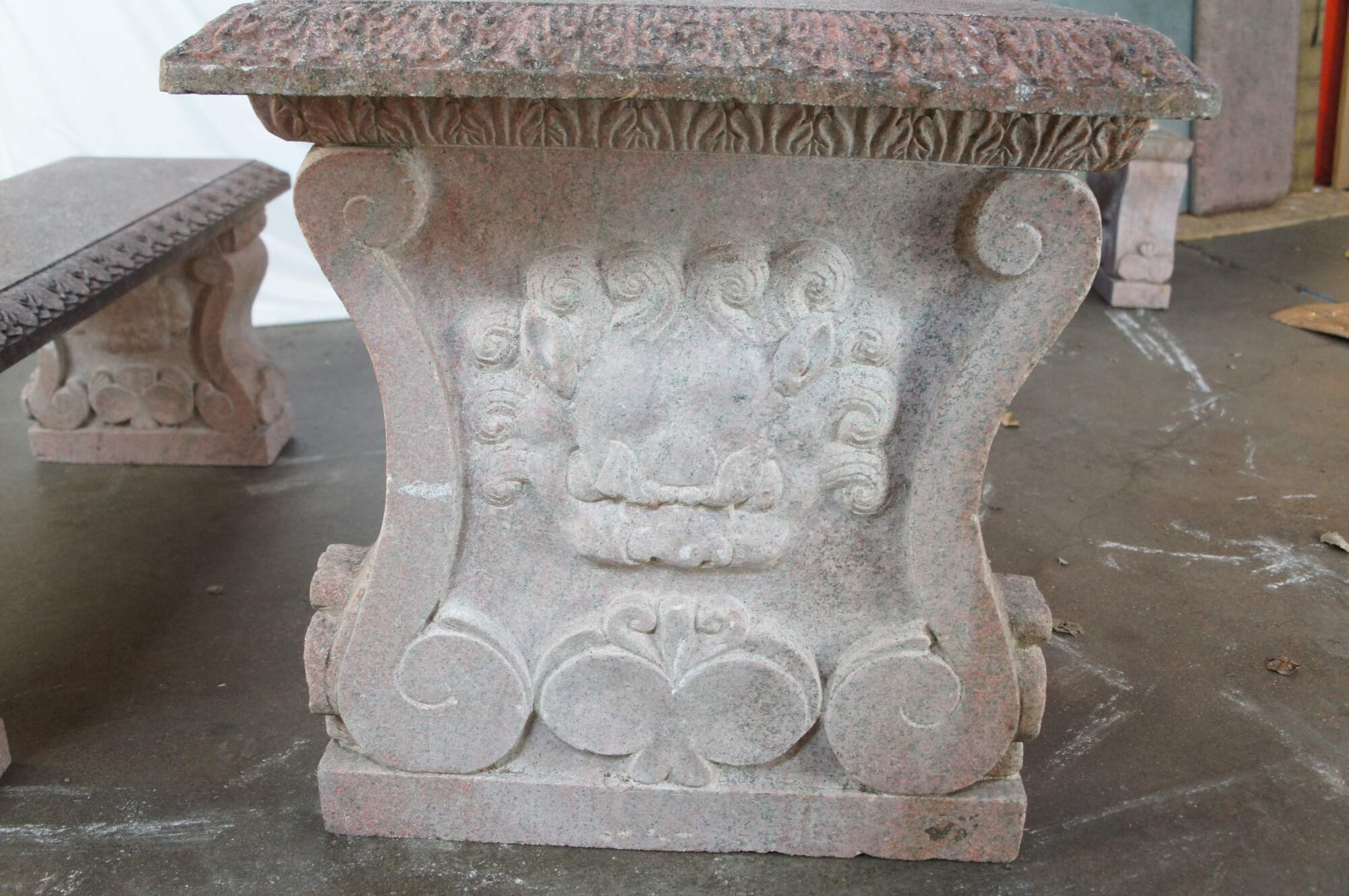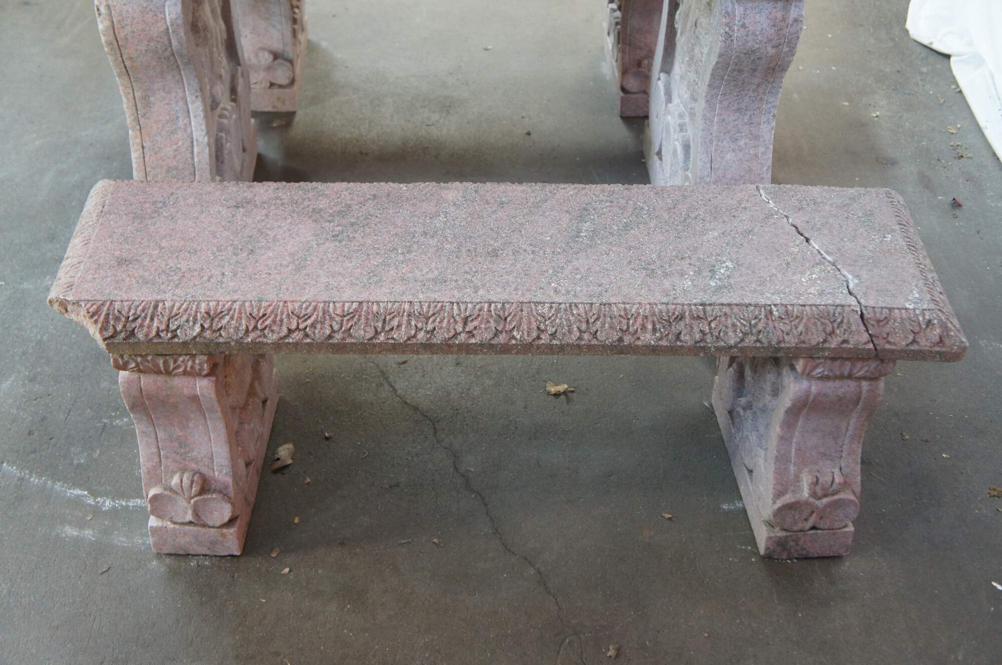 Classical Italian Revival Sculpted Granite Picnic Patio Table & Benches. Features acanthus carved edges and scrolled supports. Great for use in the garden or on your porch. Breaks down for ease of moving.