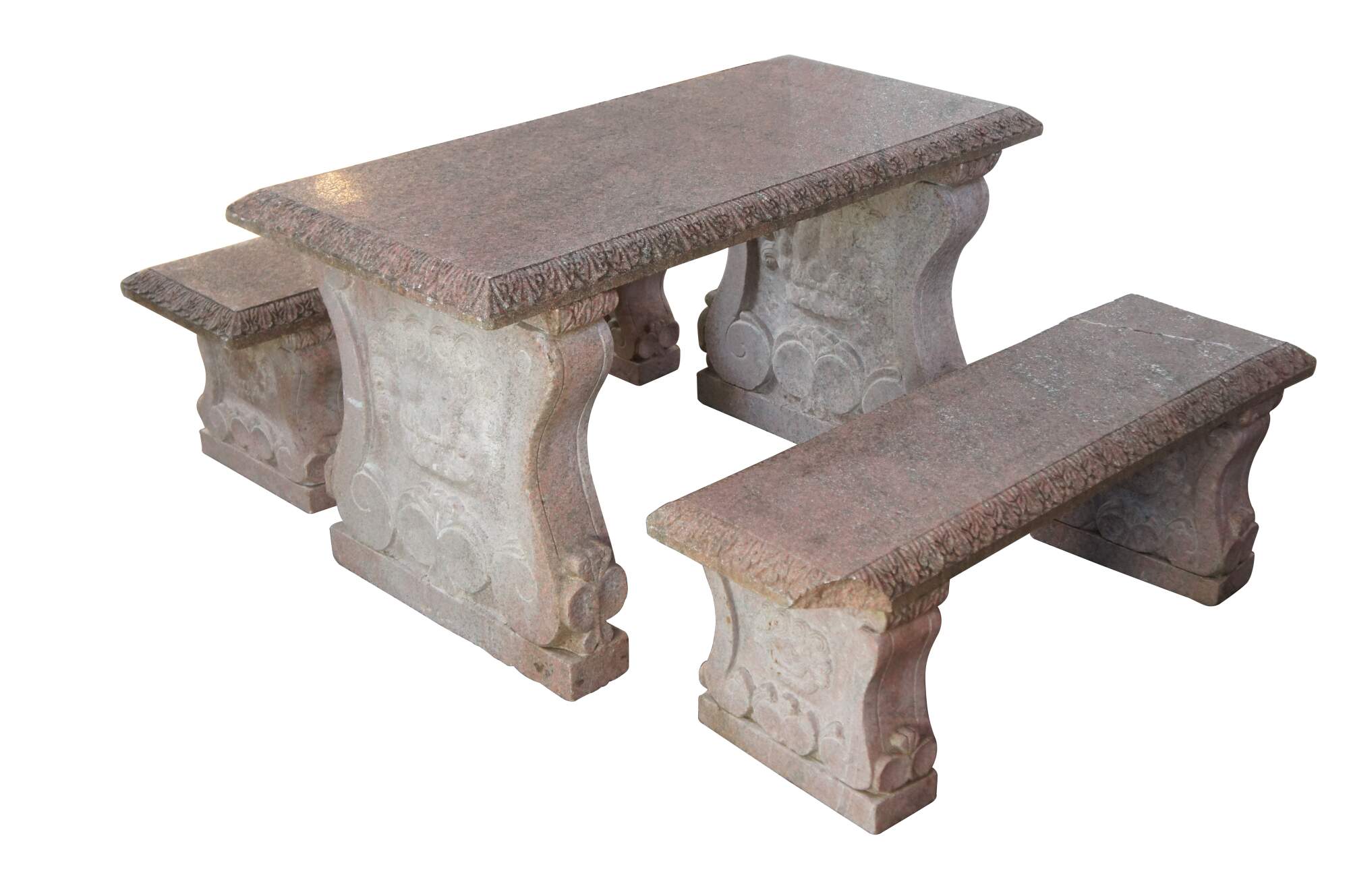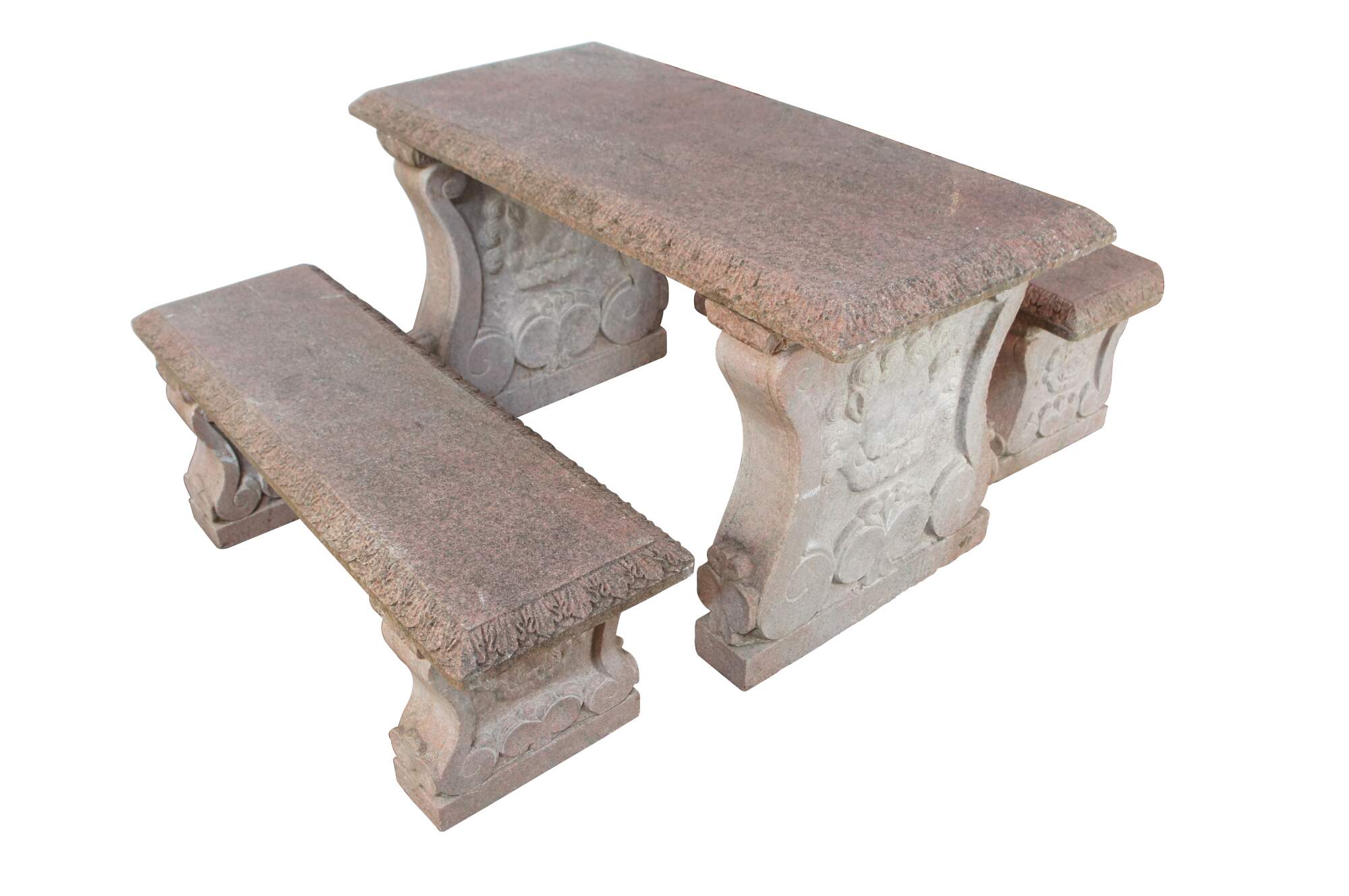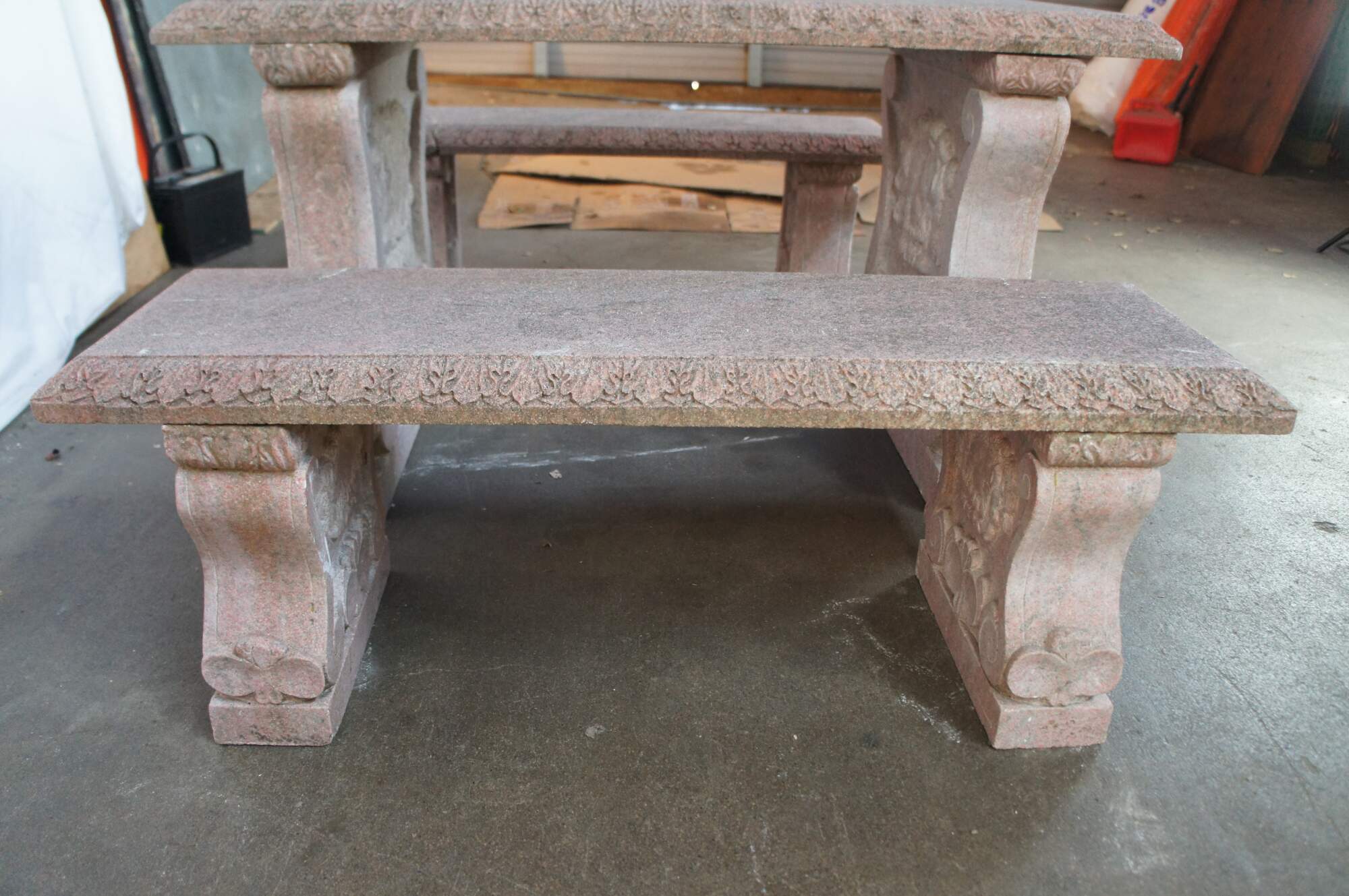 Classical Italian Revival Sculpted Granite Picnic Patio Table & Benches. Features acanthus carved edges and scrolled supports. Great for use in the garden or on your porch. Breaks down for ease of moving.