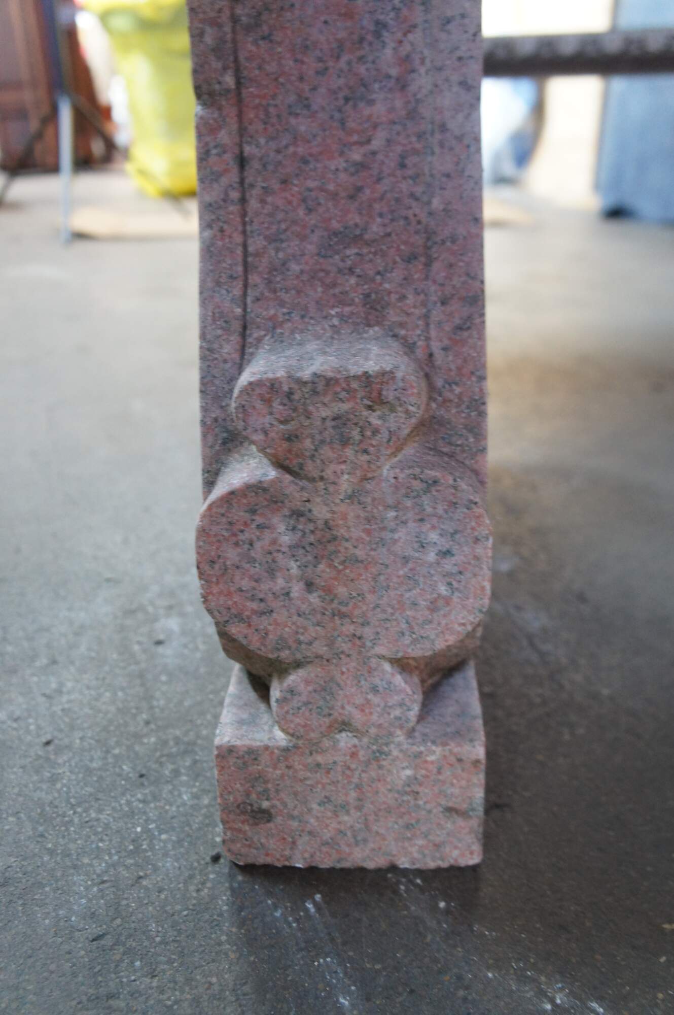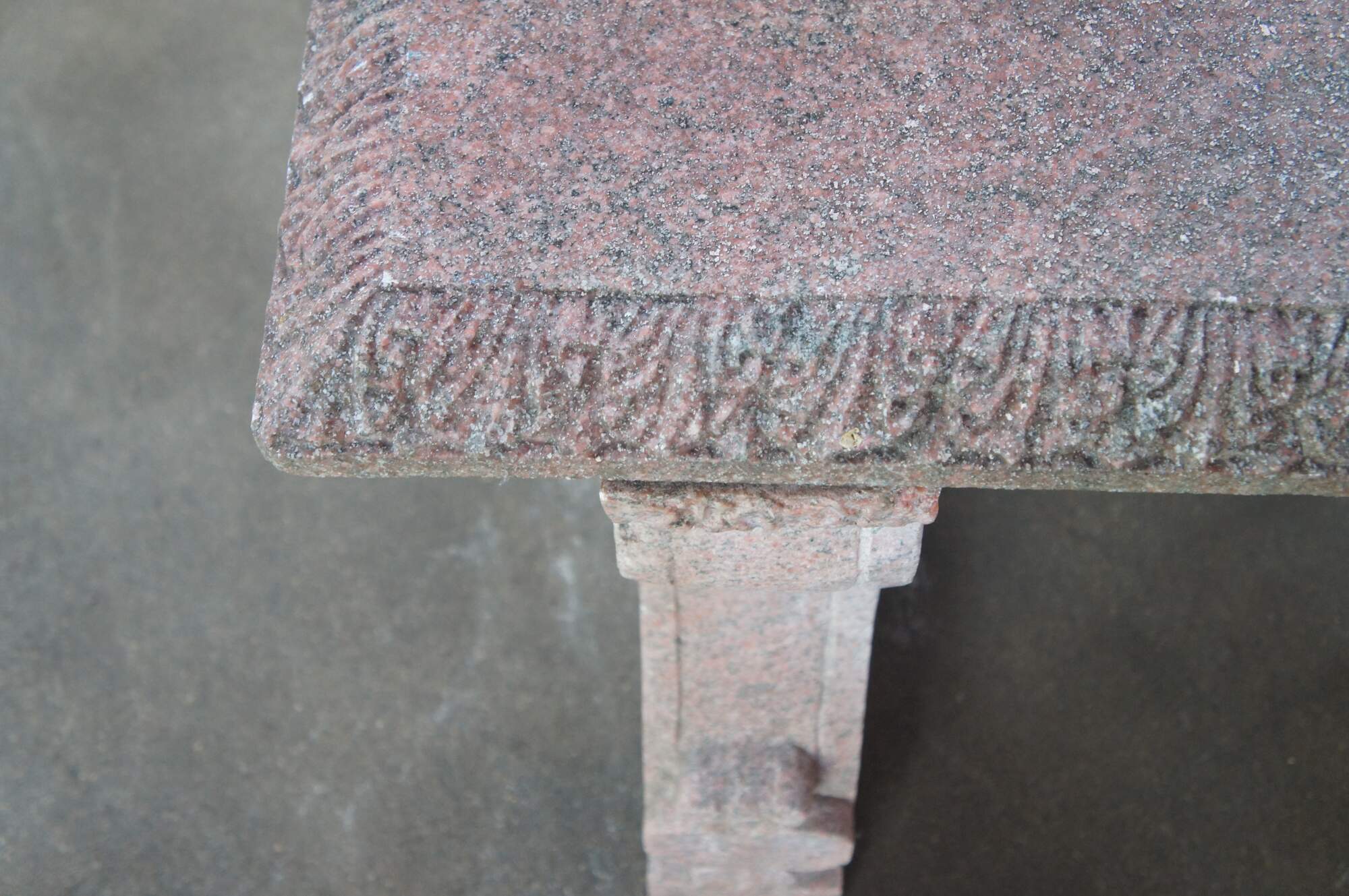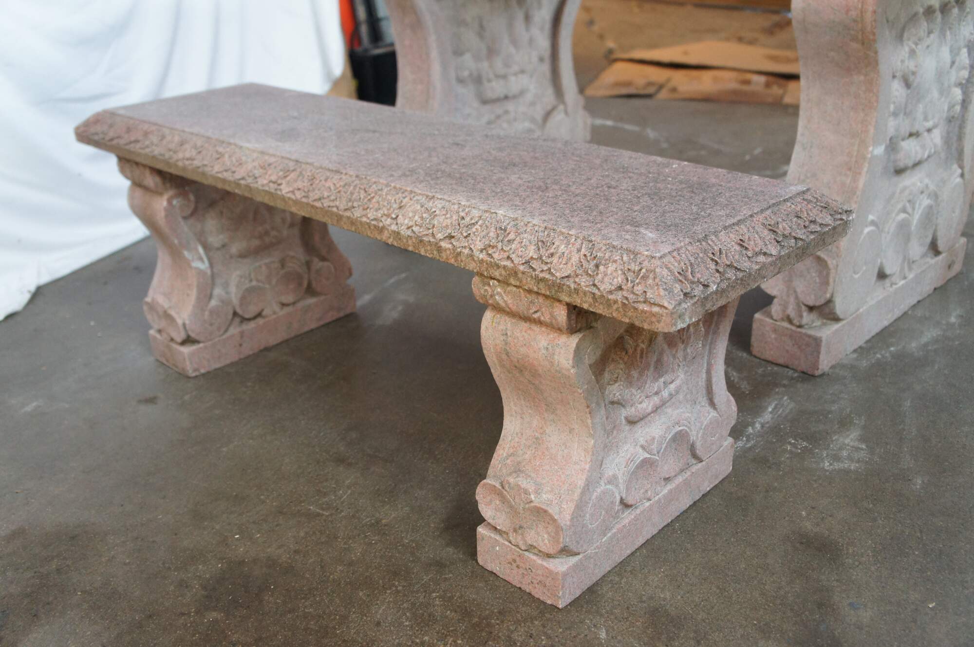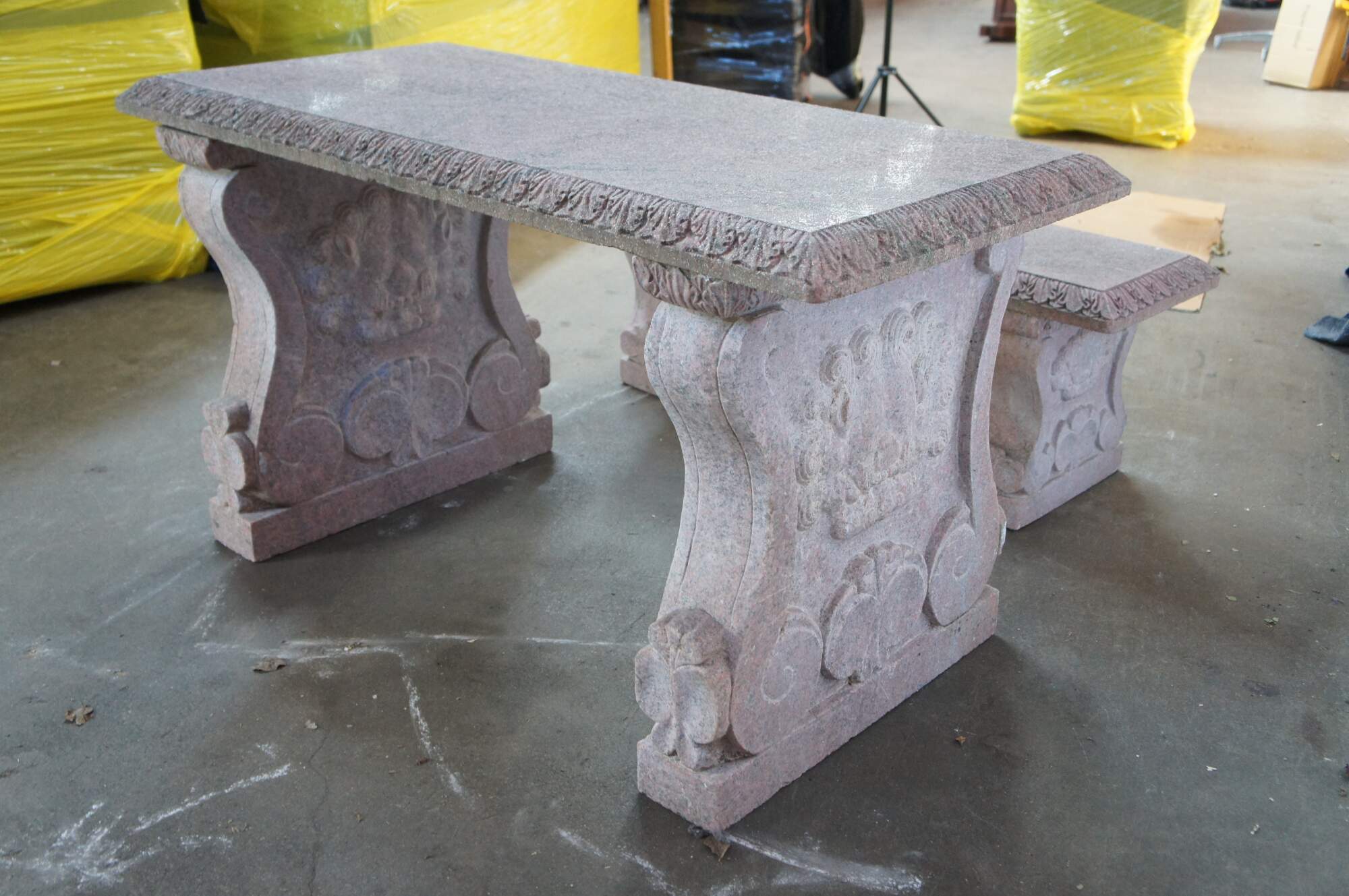 Classical Italian Revival Sculpted Granite Picnic Patio Table & Benches. Features acanthus carved edges and scrolled supports. Great for use in the garden or on your porch. Breaks down for ease of moving.