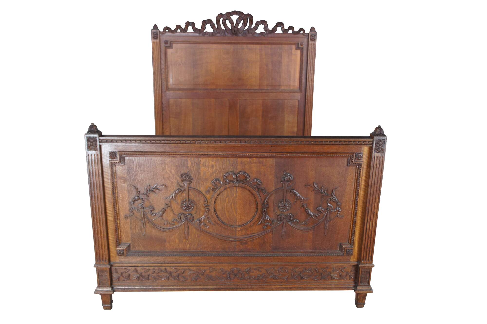 Exquisite antique 19th century French Louis XVI Full Size Bed. Made from solid quartersawn oak with meticulous carving throughout. Features square fluted posts with French medallions. The footboard is beautifully carved with a neoclassical scene showcasing ribbons, torchieres, scrolling foliate and swag. The scene is inset and framed in a panel with stepped dentil molding. Lower apron has a ribbon at the center flanked by an intertwined vine motif. This motif continues along the side rails with some fluting at the center. The final touch of this masterpiece can be seen along the crown of the headboard in a flowing serpentine pierced and carved ribbon and bow motif. This elaborate and large scale carving is rarely found in pieces from this period. The frame is supported by square tapered feet. Side rails have metal L brackets to support box spring and mattress. The perfect addition to any space.