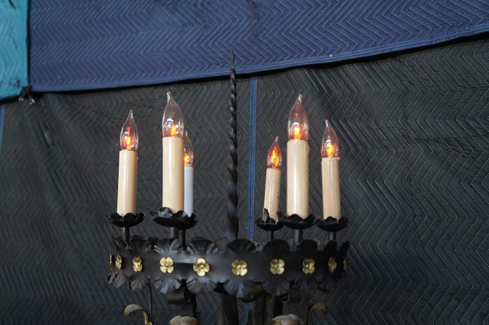 Early 20th Century pair of Spanish Revival palace sized torchiere candelabra floor lamps. Made from black twisted iron with gold acanthus trim and floret accents. Each lamp has six candlestick posts centered around a twisted iron spire. The lights are supported by scrolled tripod bases and turn on via a switch along the cord. Electric cords are very long allow for versatility in use. An exception set that will make a grande addition to any space.