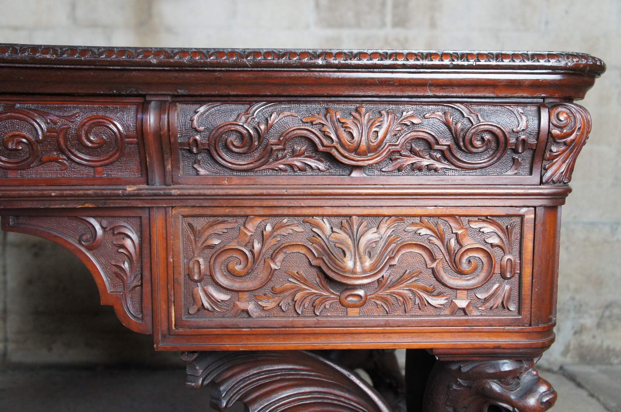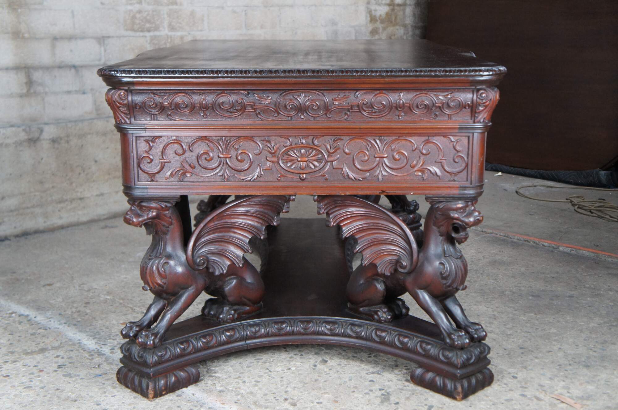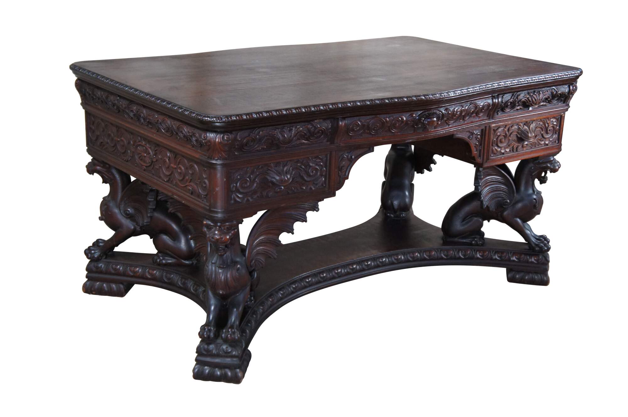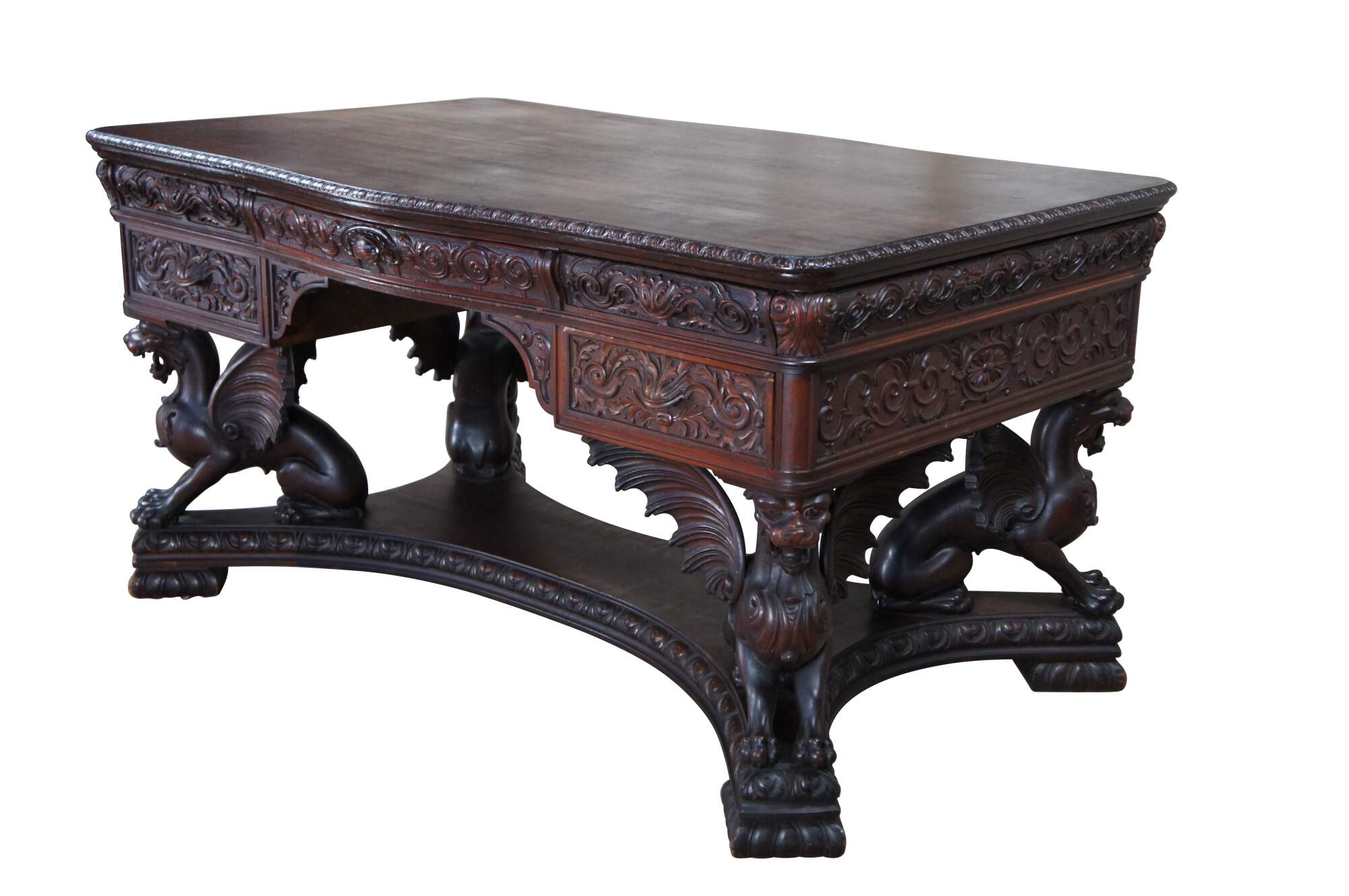 An exceptionally carved mahogany partners desk by R.J. Horner & Co, circa 1890s. Drawing inspiration from Victorian & Italian Baroque Styling. Features a serpentine form with carved table border surmounting a central frieze drawer flanked by two fitted right side drawers on each side that run the full depth of the desk, and faux drawers on each left side. Drawer surfaces, side and aprons are all perfectly carved with raised scrollwork, foliate, scalloped and acanthus detail. The desk is supported by the four corner iconic winged griffins on a shaped medial stretcher with egg and dart carved border over four square carved feet. The perfect statement for any library, study or office.