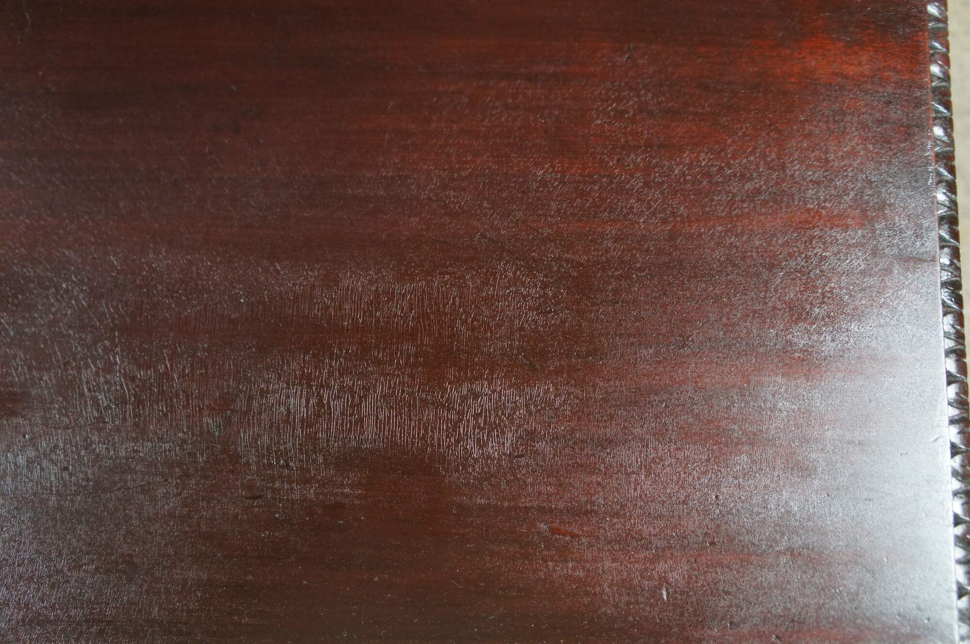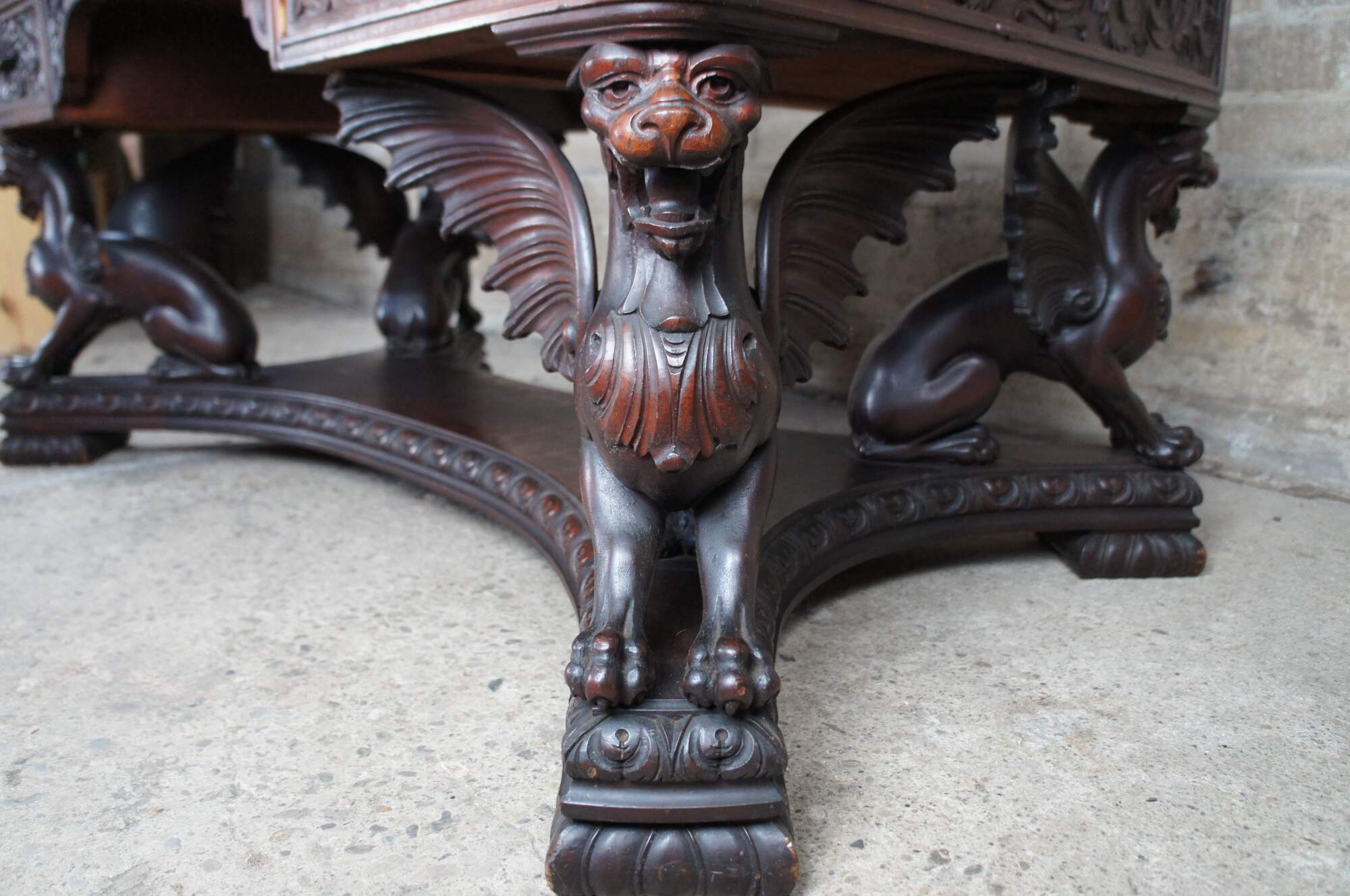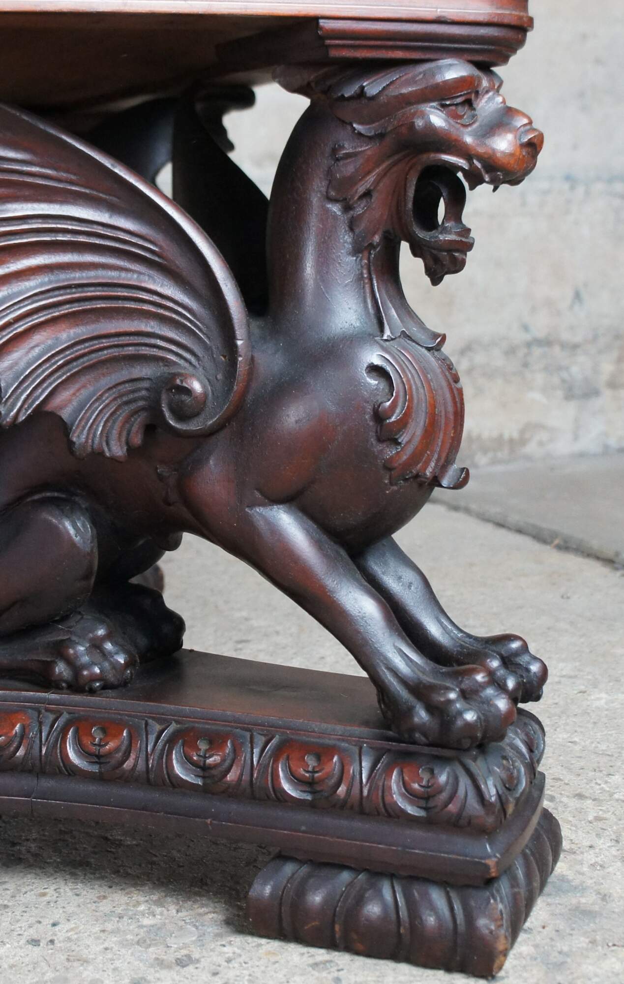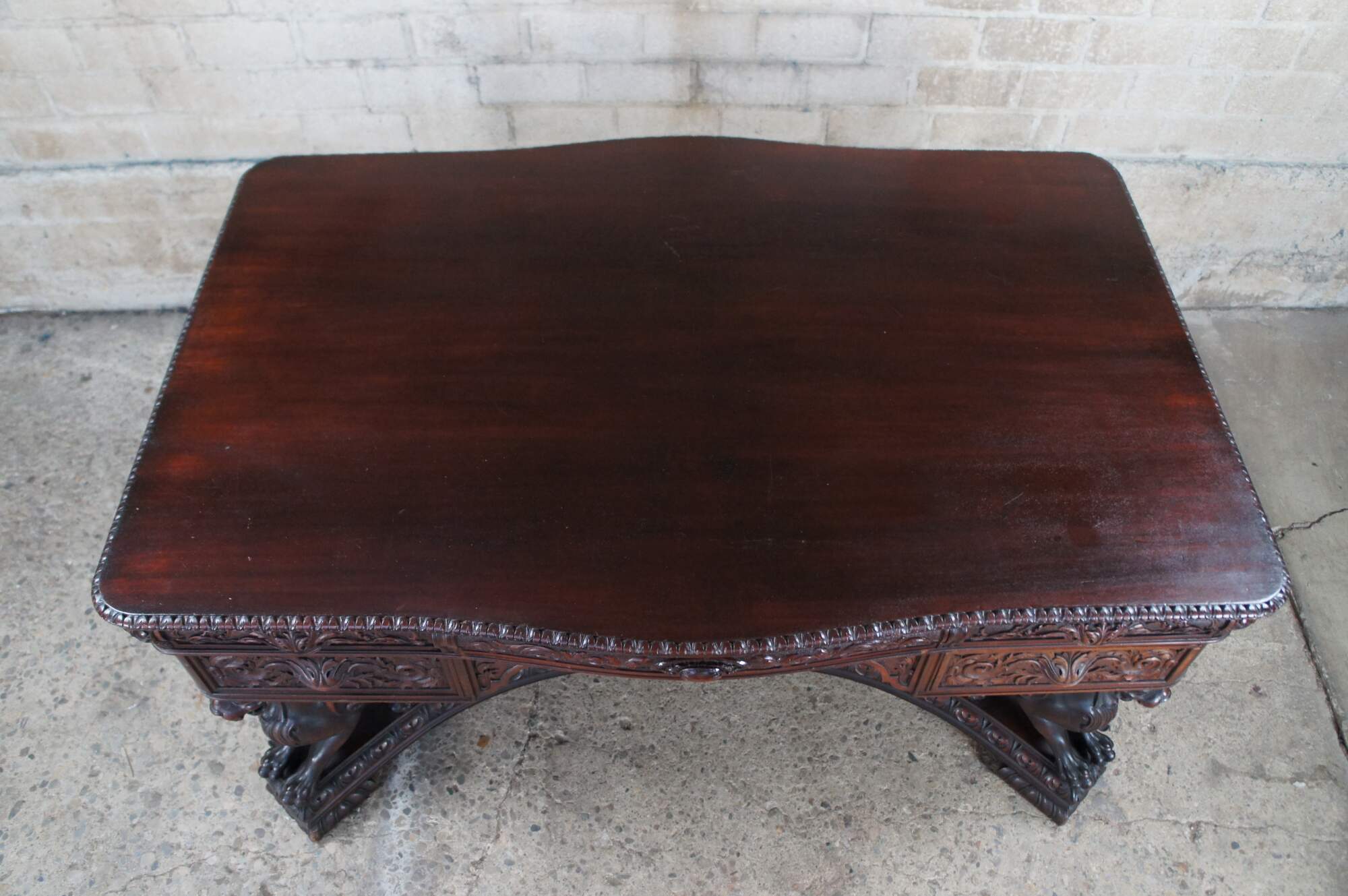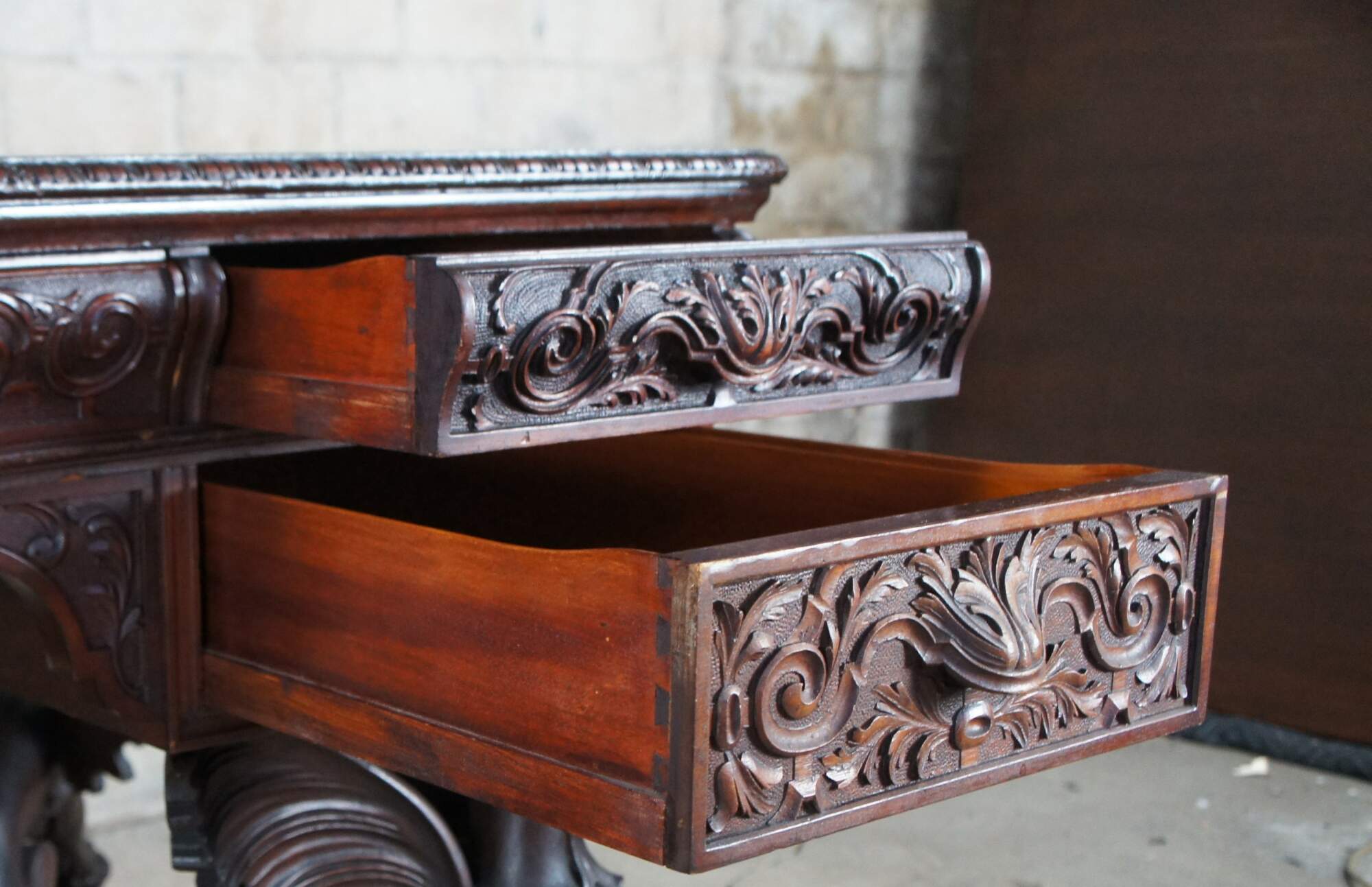 An exceptionally carved mahogany partners desk by R.J. Horner & Co, circa 1890s. Drawing inspiration from Victorian & Italian Baroque Styling. Features a serpentine form with carved table border surmounting a central frieze drawer flanked by two fitted right side drawers on each side that run the full depth of the desk, and faux drawers on each left side. Drawer surfaces, side and aprons are all perfectly carved with raised scrollwork, foliate, scalloped and acanthus detail. The desk is supported by the four corner iconic winged griffins on a shaped medial stretcher with egg and dart carved border over four square carved feet. The perfect statement for any library, study or office.