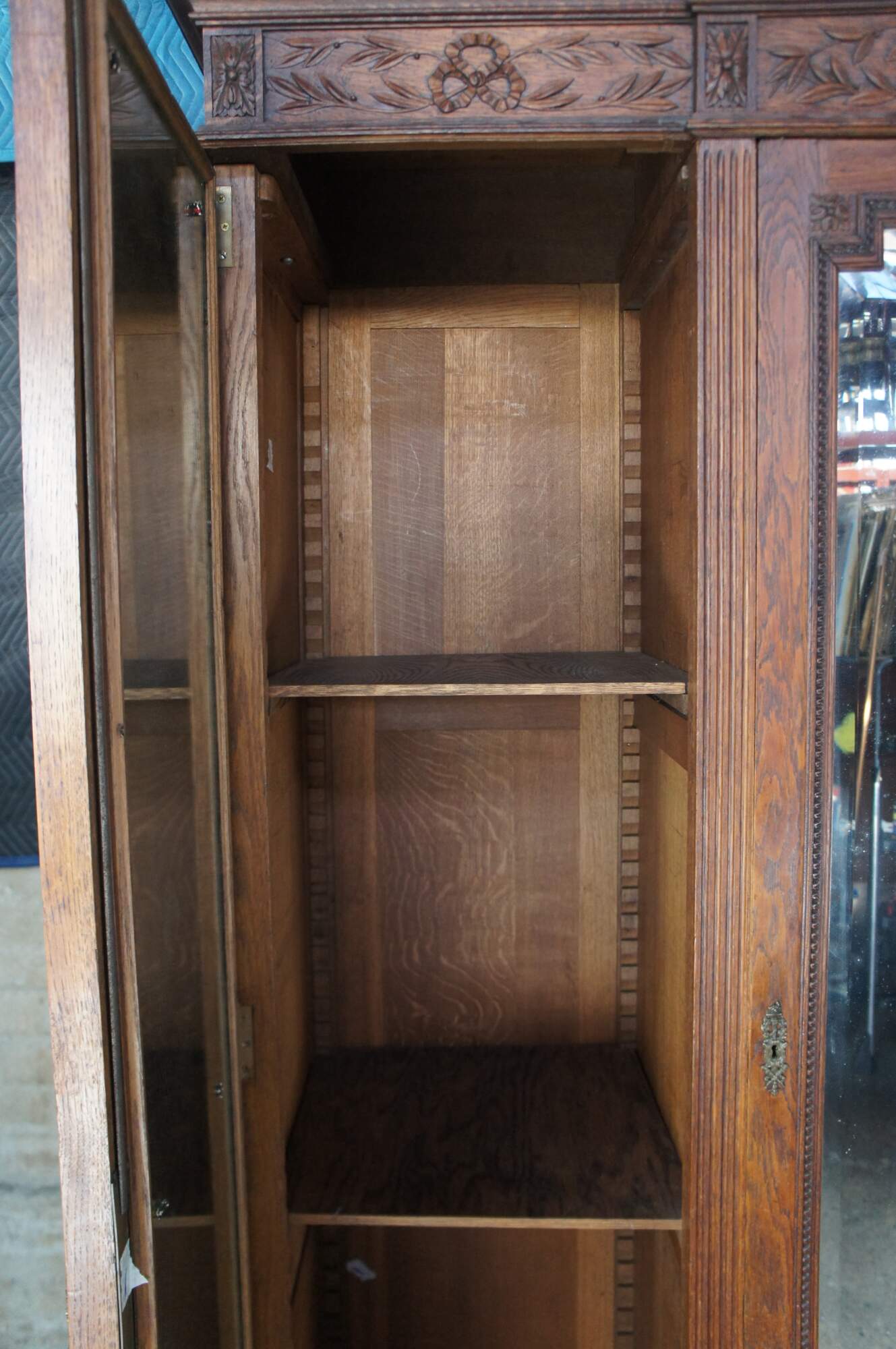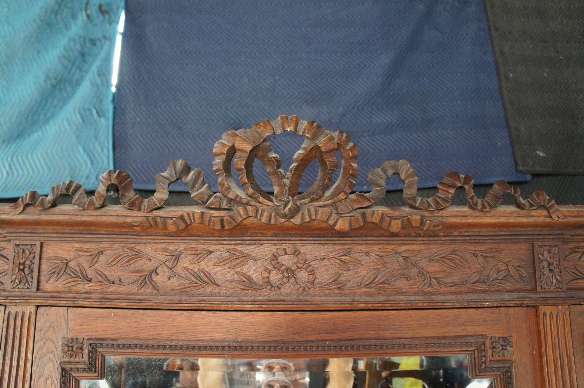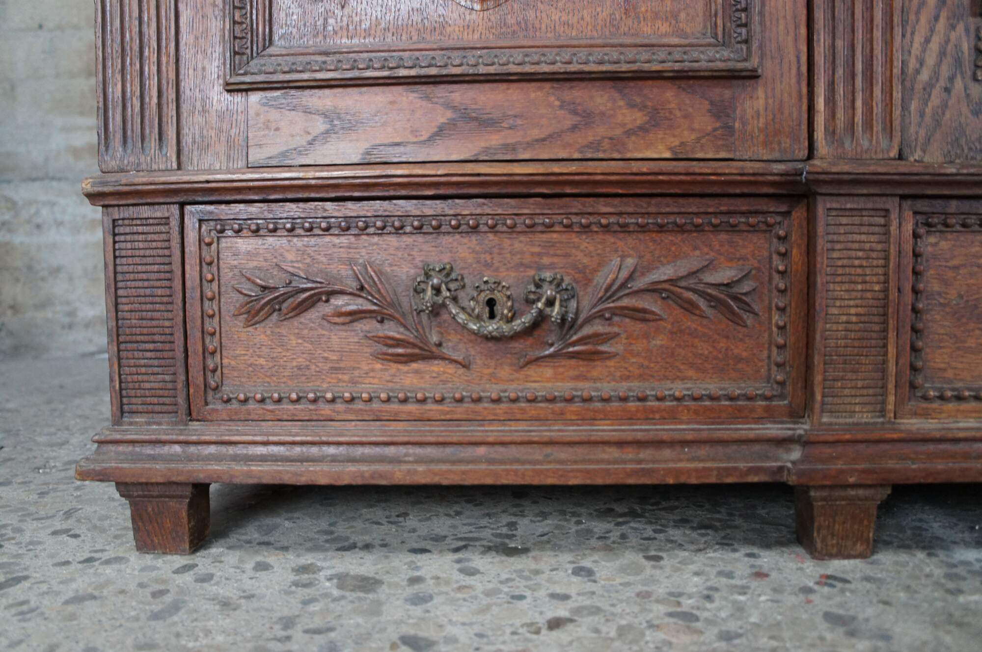 Exquisite antique 19th century French Louis XVI Knockdown Armoire. Made from solid oak / quartersawn oak with meticulous carving throughout. Features a three door mirrored front with large rectangular stepped center flanked by lattice design, all in beveled glass. The elegant front showcases fluted columns, French medallions and a neoclassical scene showcasing ribbons, torchieres, scrolling foliate and swag. Upper apron has ribbons flanked by an intertwined vine motif beneath a flowing serpentine pierced and carved ribbon and bow motif. This elaborate and large scale carving is rarely found in pieces from this period. The base opens to three hand dovetailed drawers for additional storage and the frame is supported by square tapered feet. Interior opens to mirrored doors and shelves along the outside. The large center is perfect for hanging garments. A remarkable cabinet that will make the perfect addition to any space.