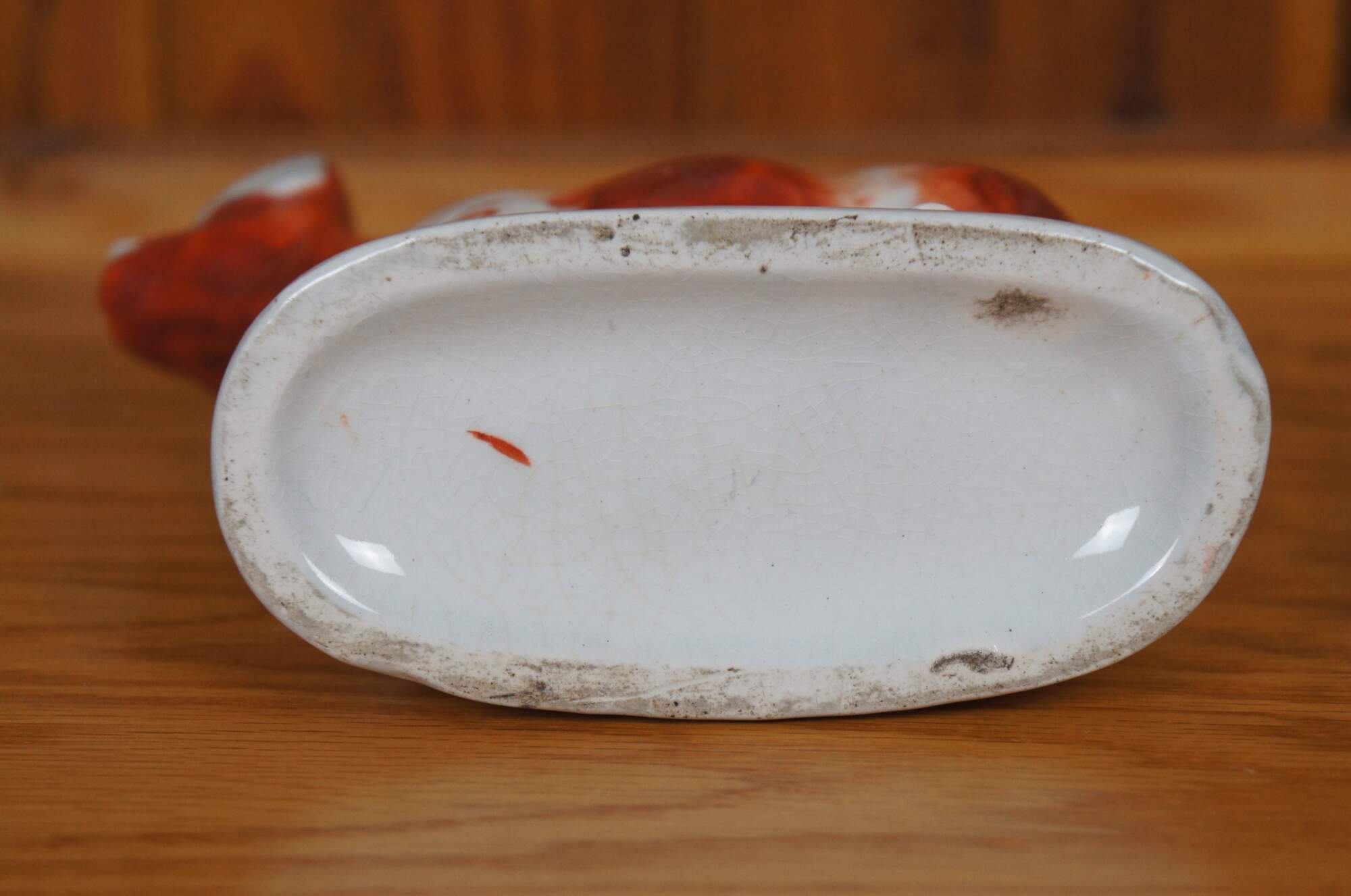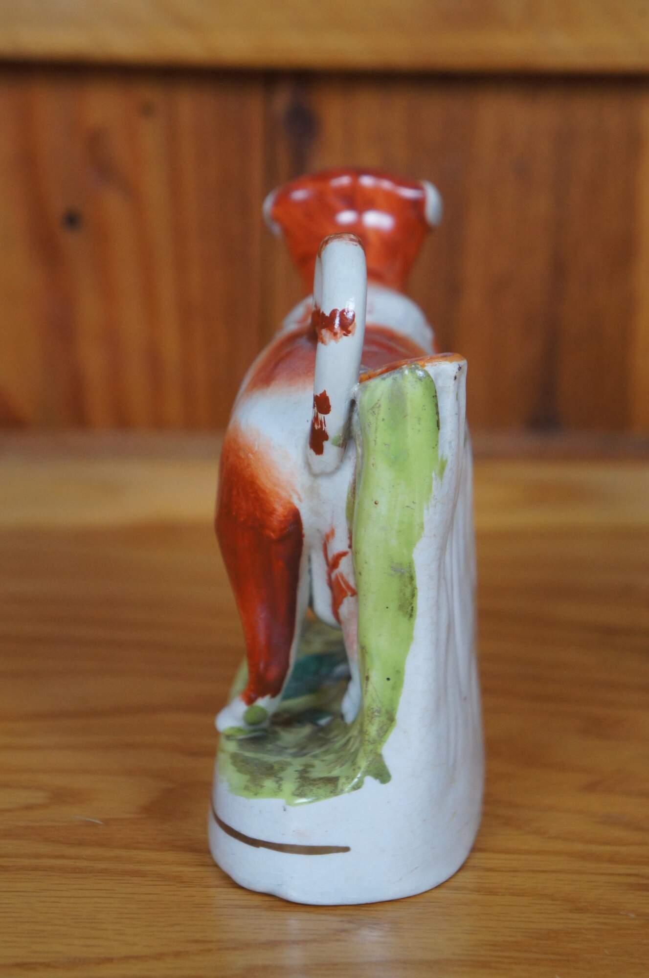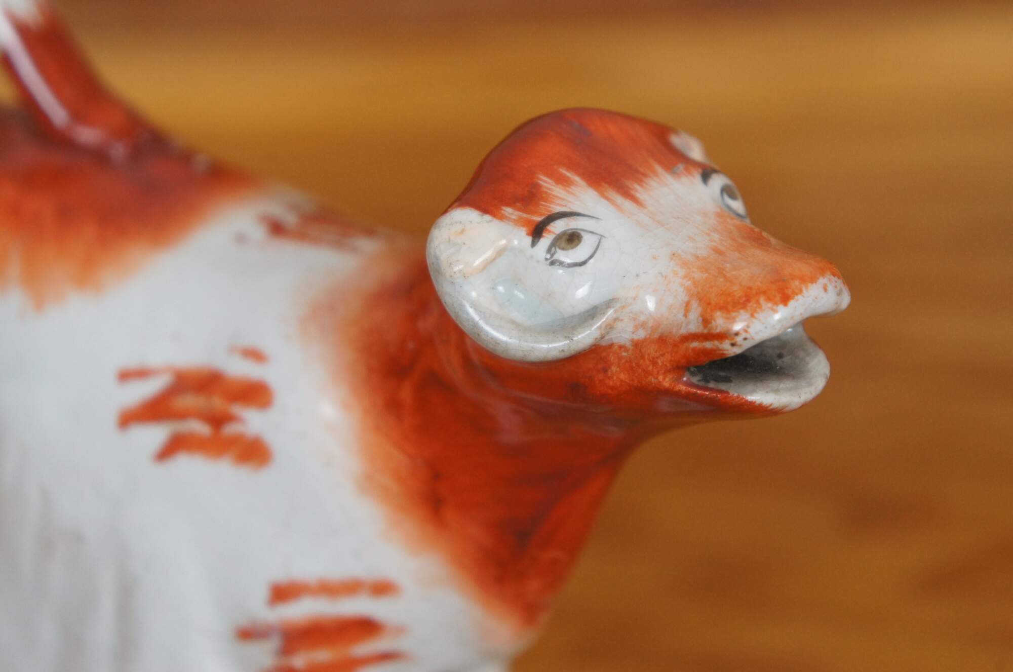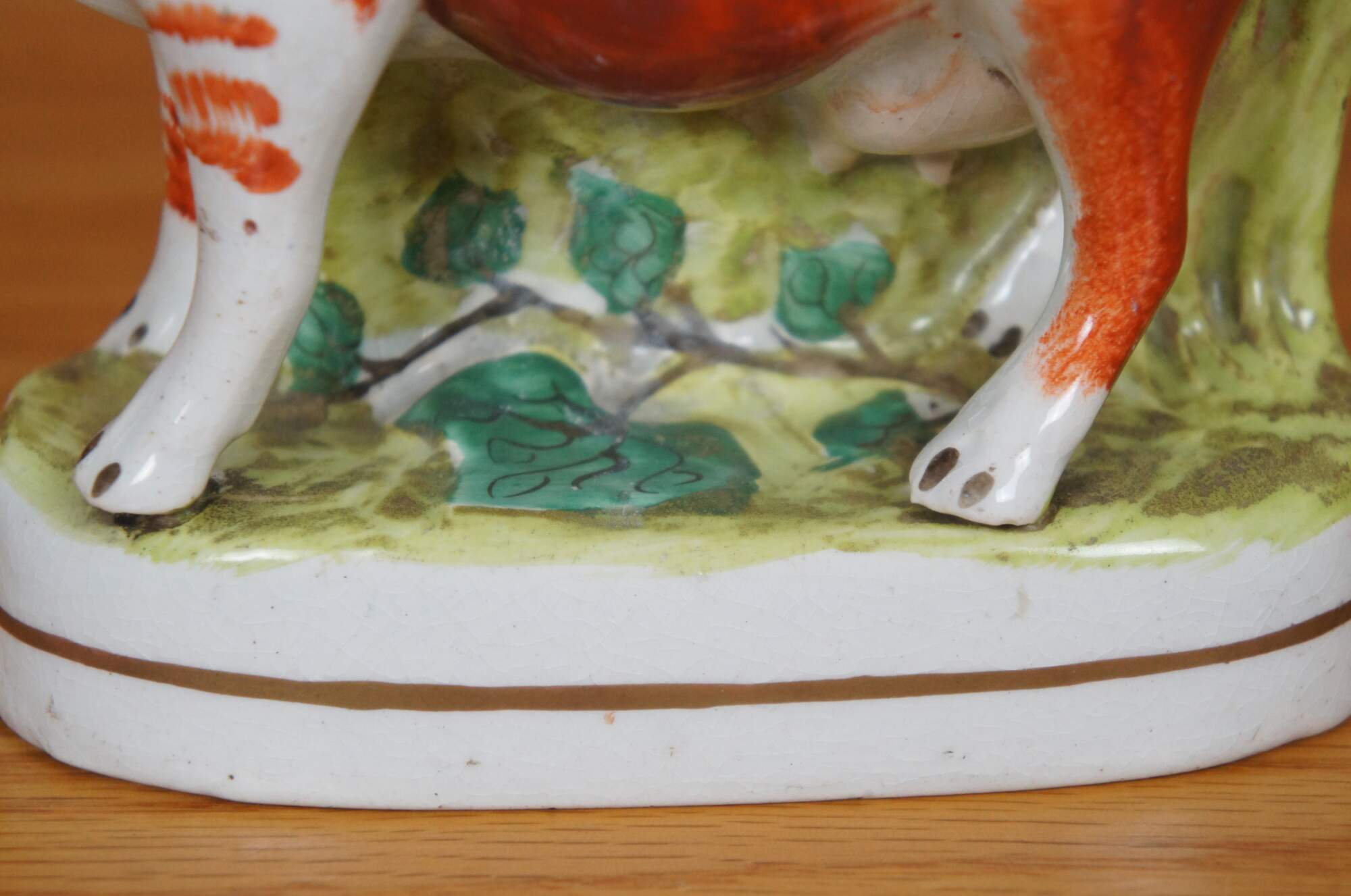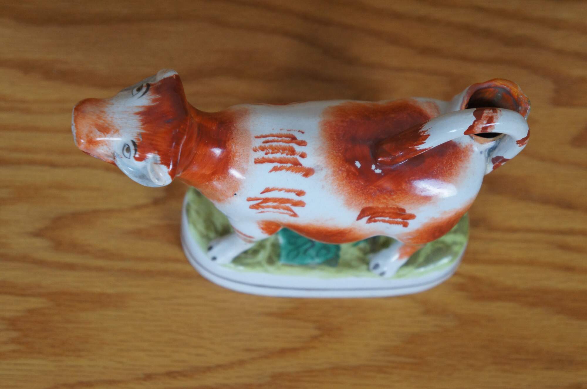 Antique 19th century Staffordshire porcelain flatback figural cream pitcher / bud vase in the shape of a red and white cow next to a tree stump, on a grassy oval base. Base painted with grass and English ivy. Tail curls to form handle.