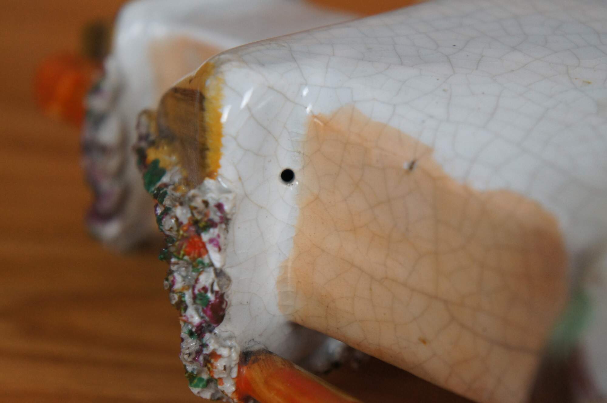 Antique 19th century Staffordshire porceain flatback figurine in the shape of a brown stone manor house with tall central tower, two chimneys and a yellow roof, trimmed with flowers.