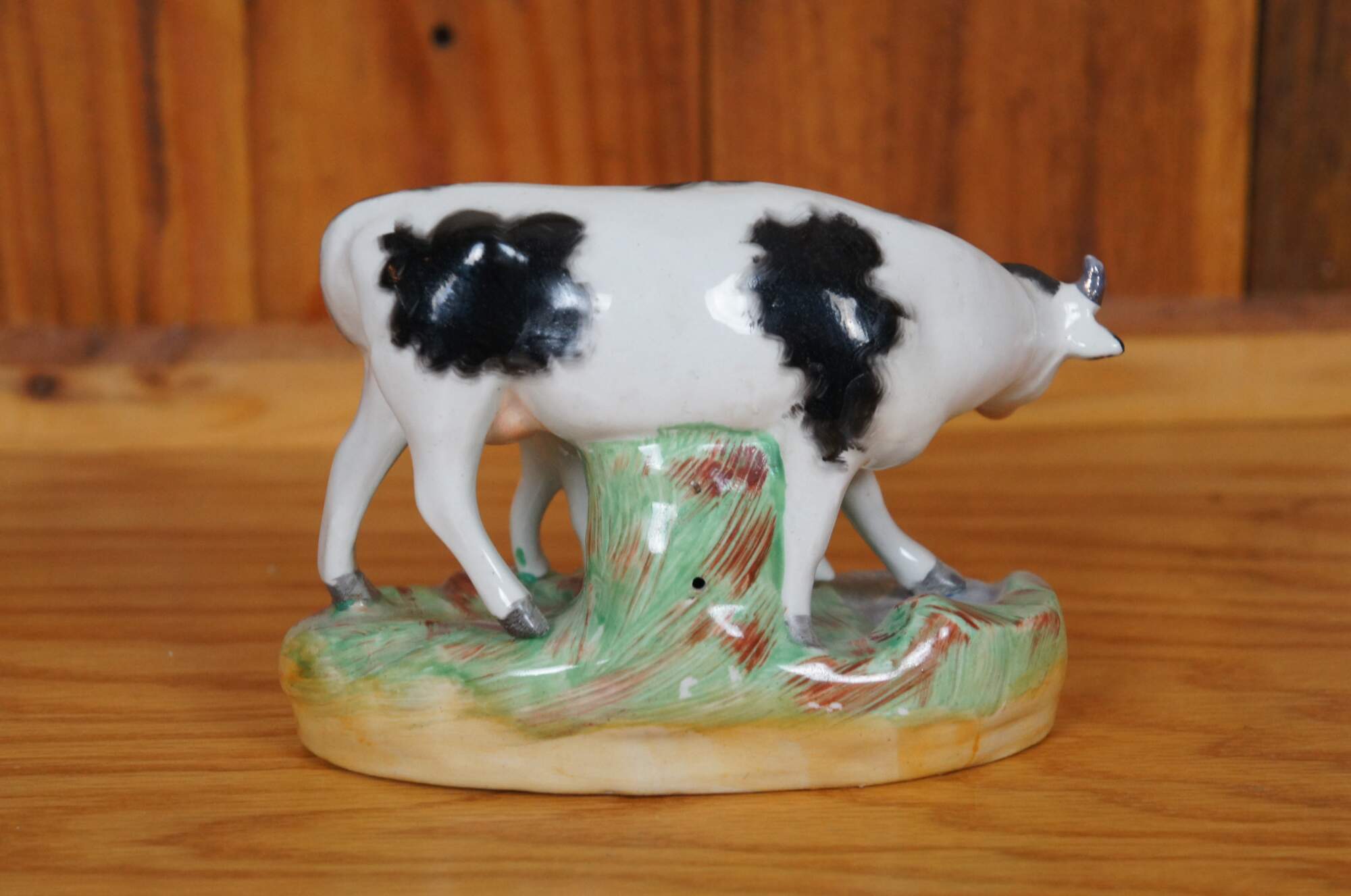 Old Staffordshire porcelain figurine depicting a black and white cow and calf, standing by a stream in a grassy field. Stamped "Old Staffordshire Ware England" on base.