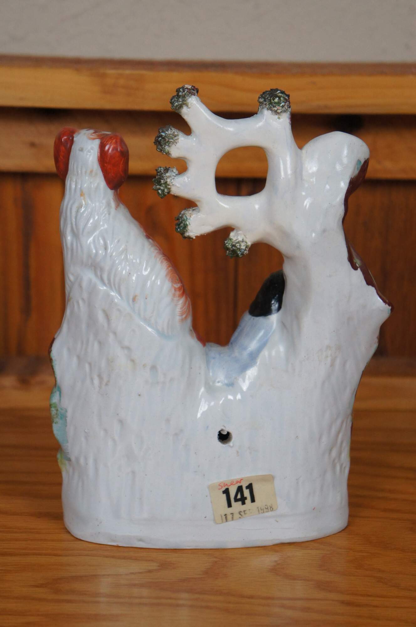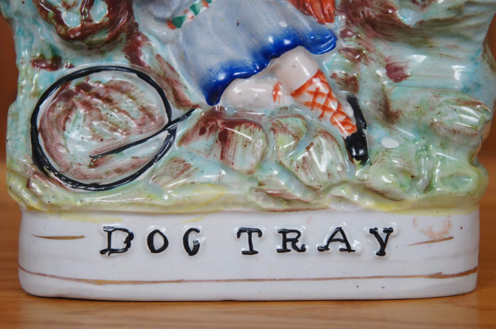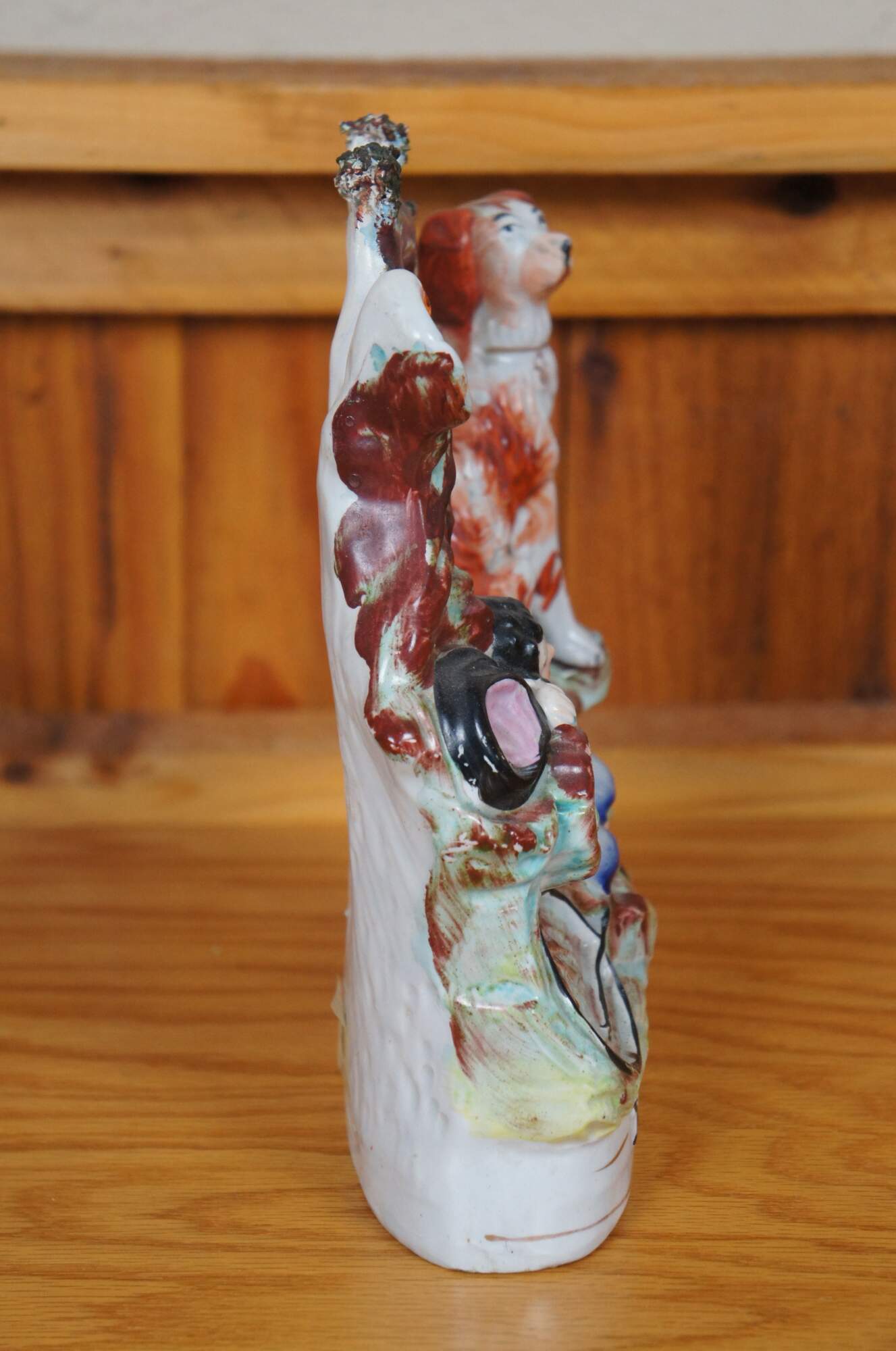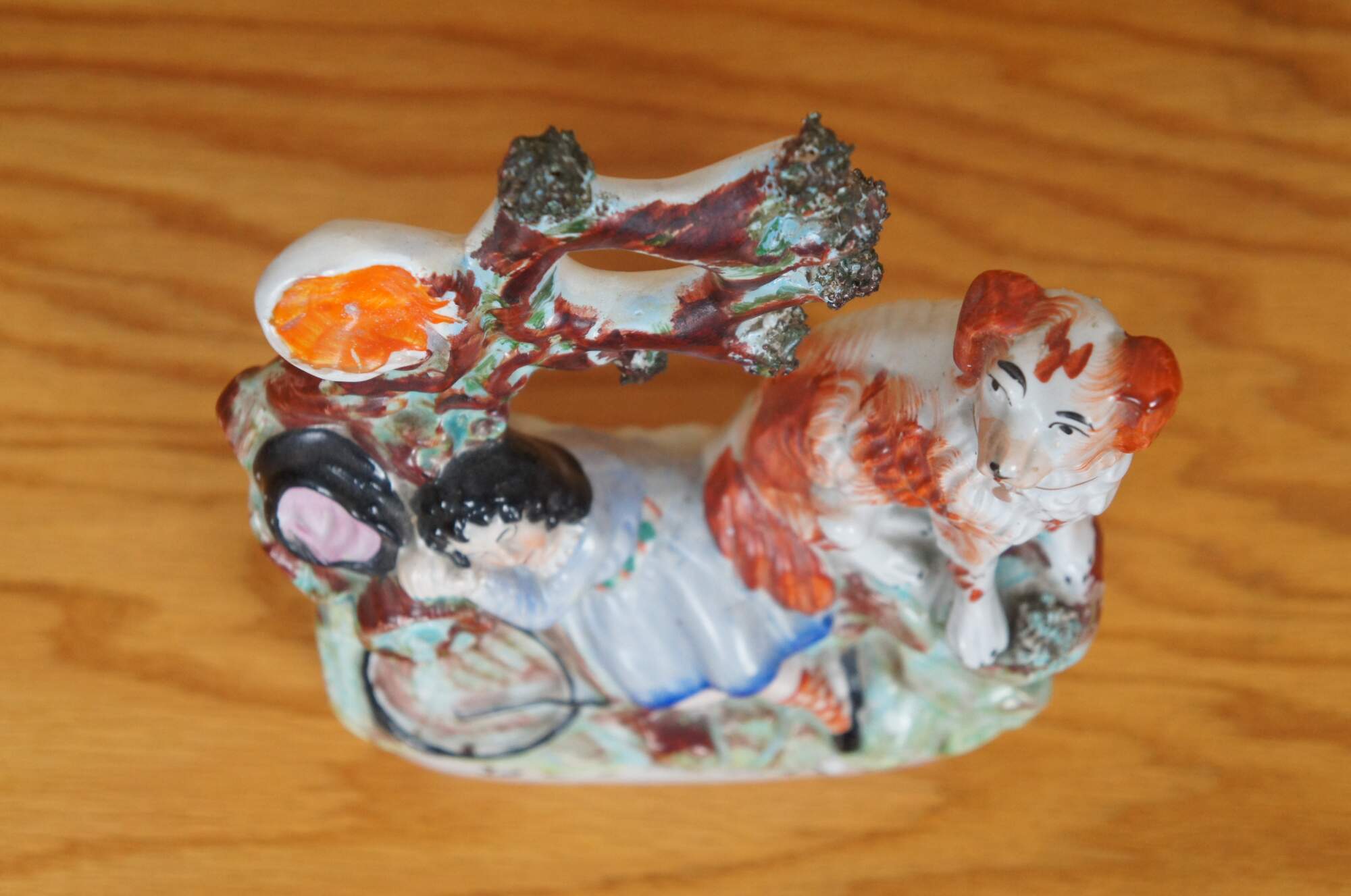 Antique 19th century Staffordshire porcelain flatback figurine titled "Dog Tray," depicting a young girl sleeping at the foot of a tree with her hoop and stick, guarded by an attentive red and white King Charles spaniel. Tray refers to the name of a faithful dog featured in the poem "The Harper," written in 1836 by Thomas Campbell.