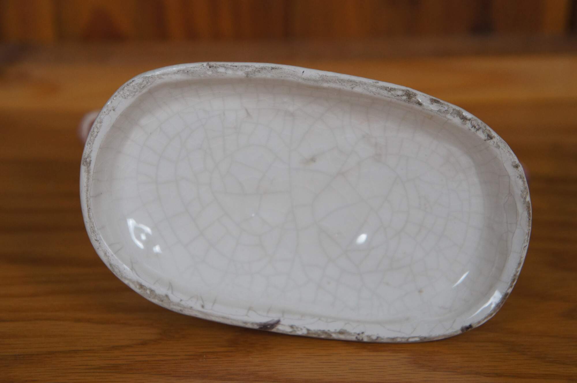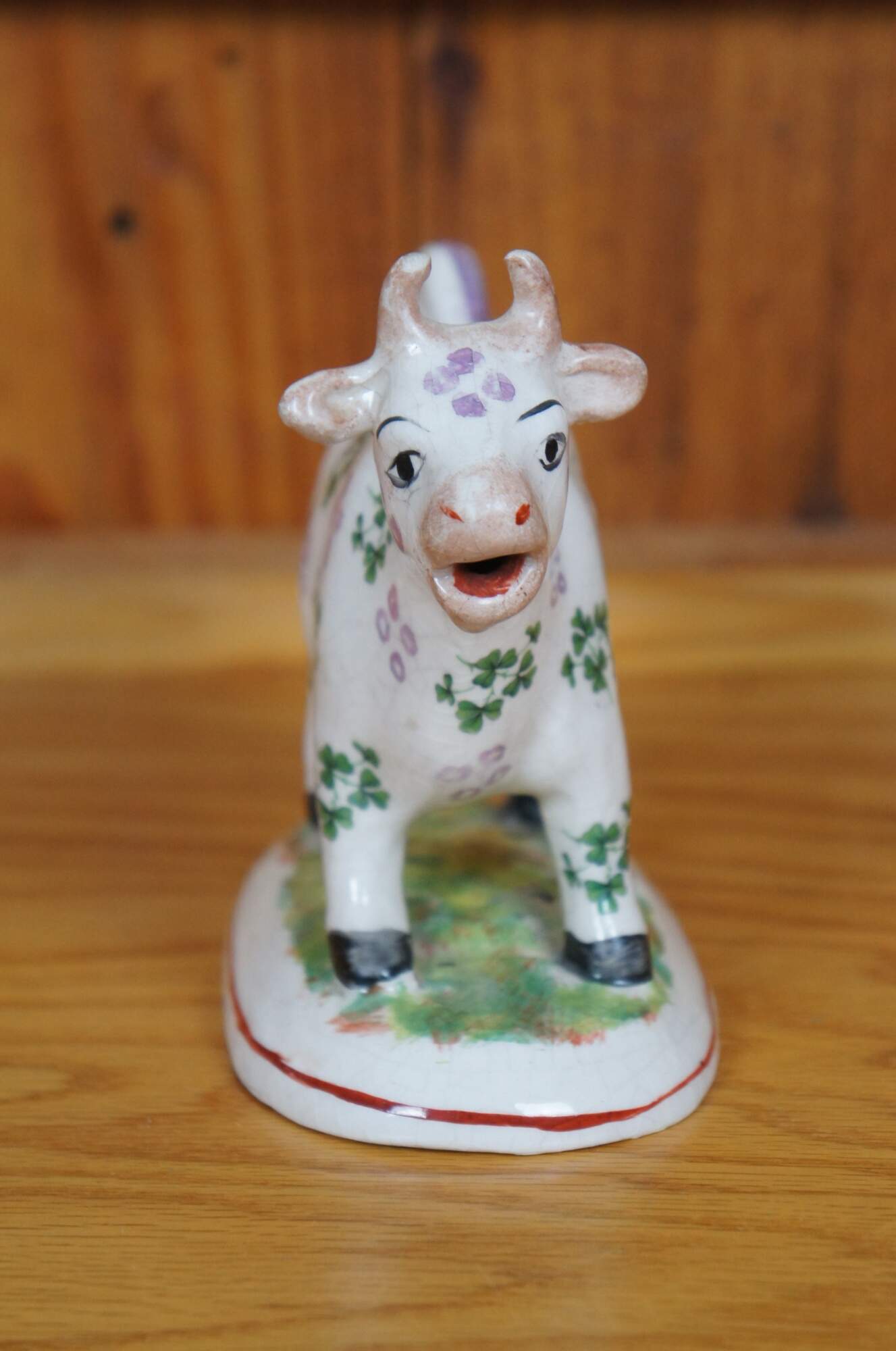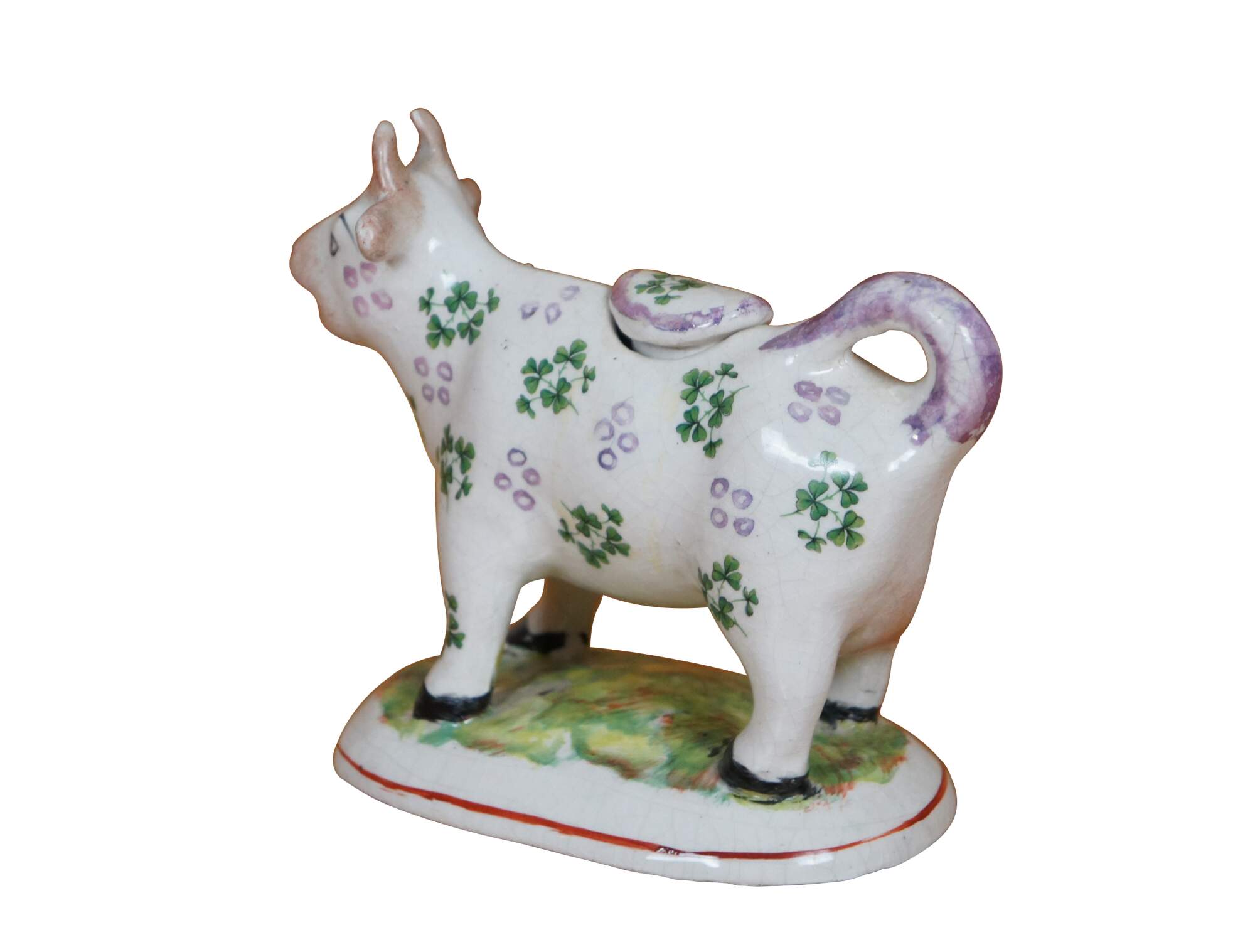 Rare antique 19th century Staffordshire porcelain cream pitcher in the shape of a white cow with iridescent lavender / light purple spots, painted with clusters of shamrocks / three leaf clovers, standing on a grassy oval base. Tail curls to form handle. Includes stopper.