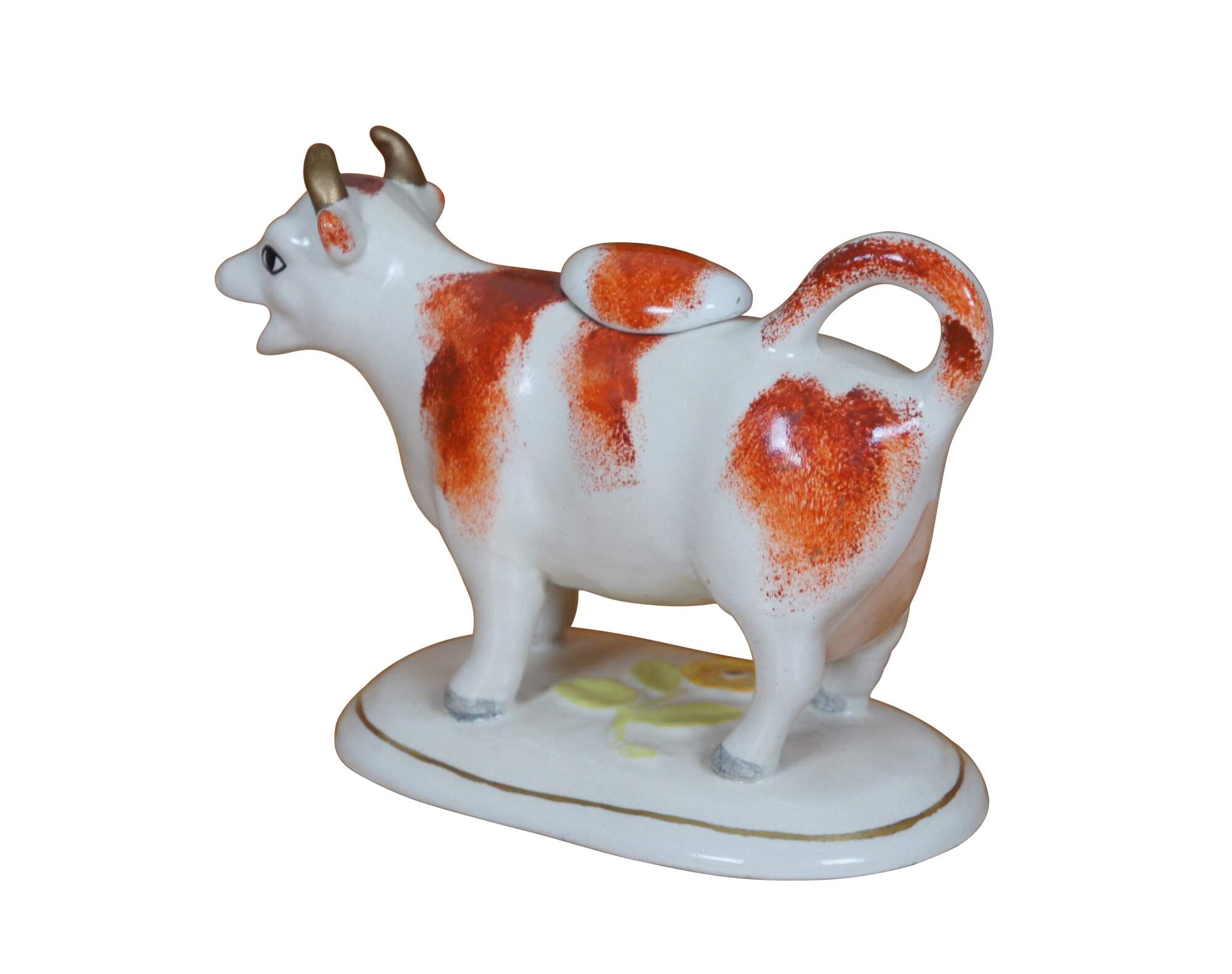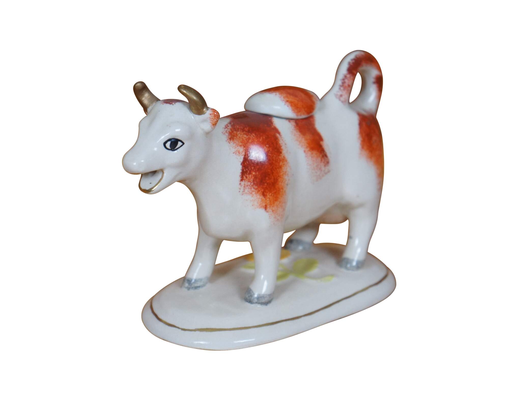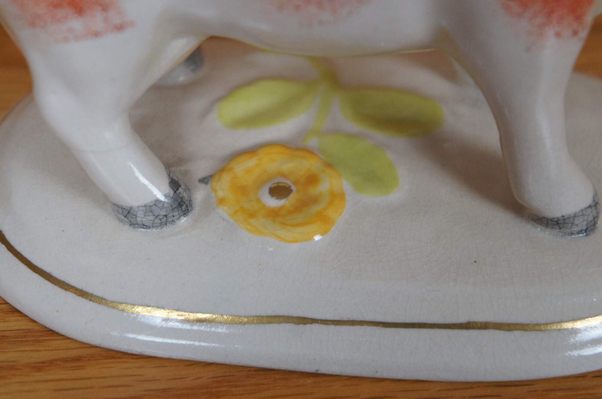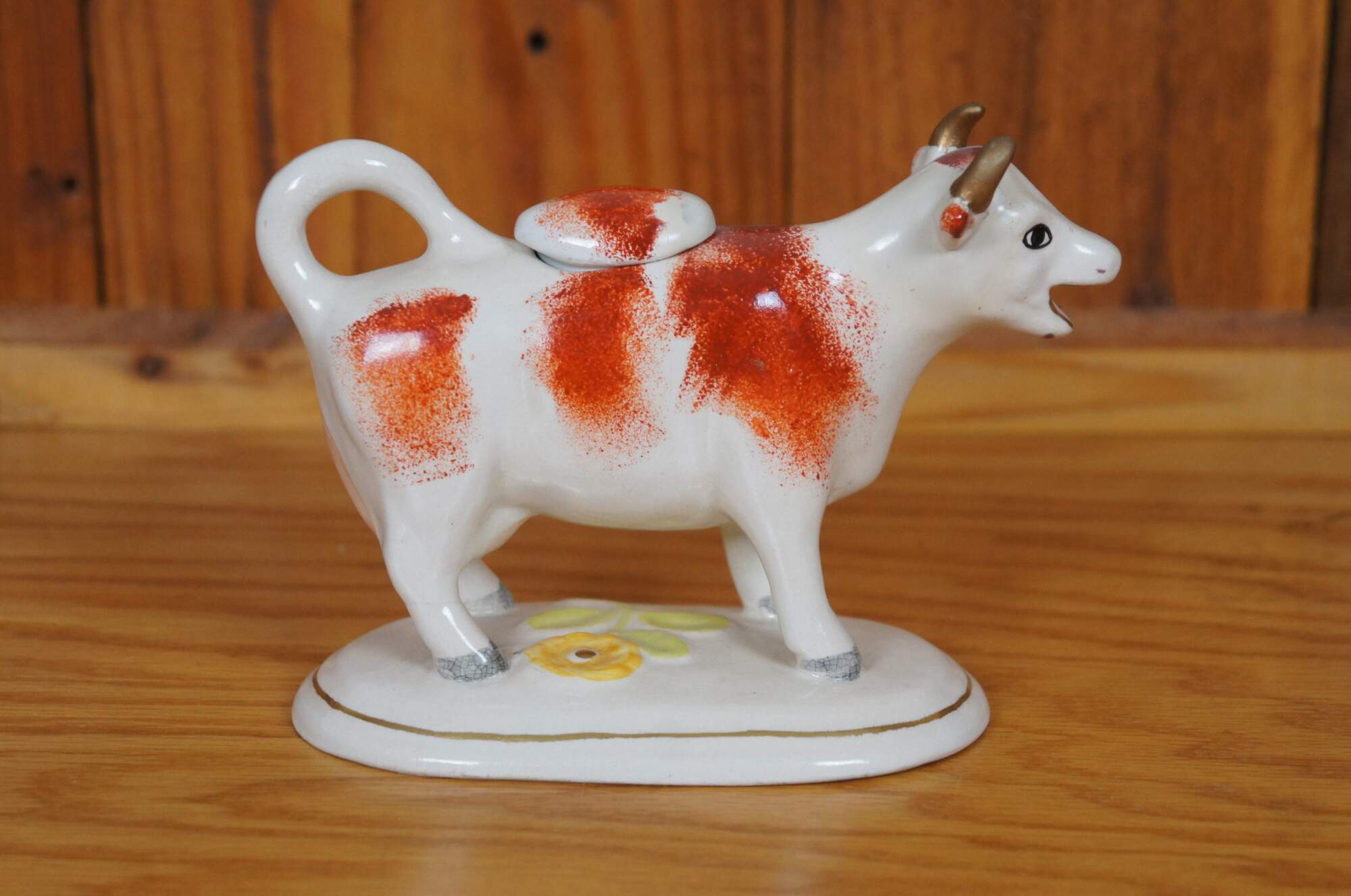 Antique 19th century Staffordshire porcelain cream pitcher in the shape of a red and white cow on an oval base, molded and painted with a yellow daisy. Tail curls to form handle. Gilt horns. Includes stopper.