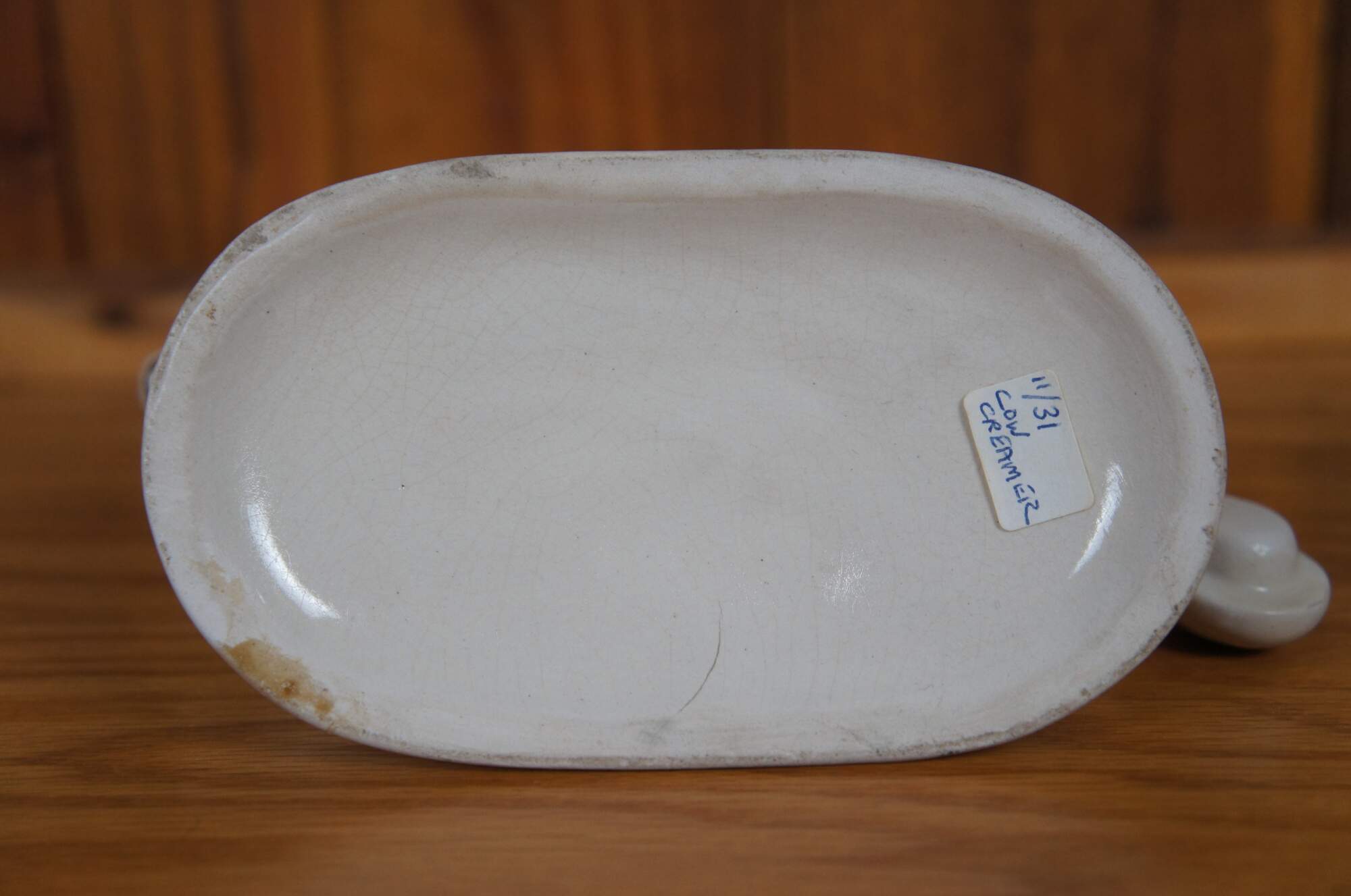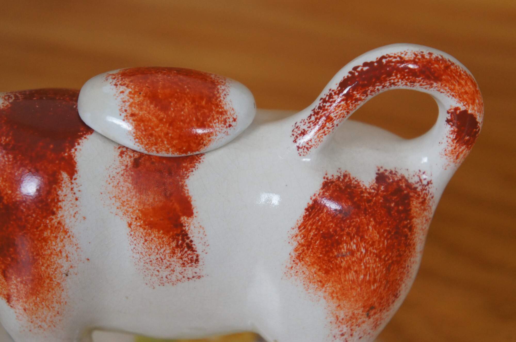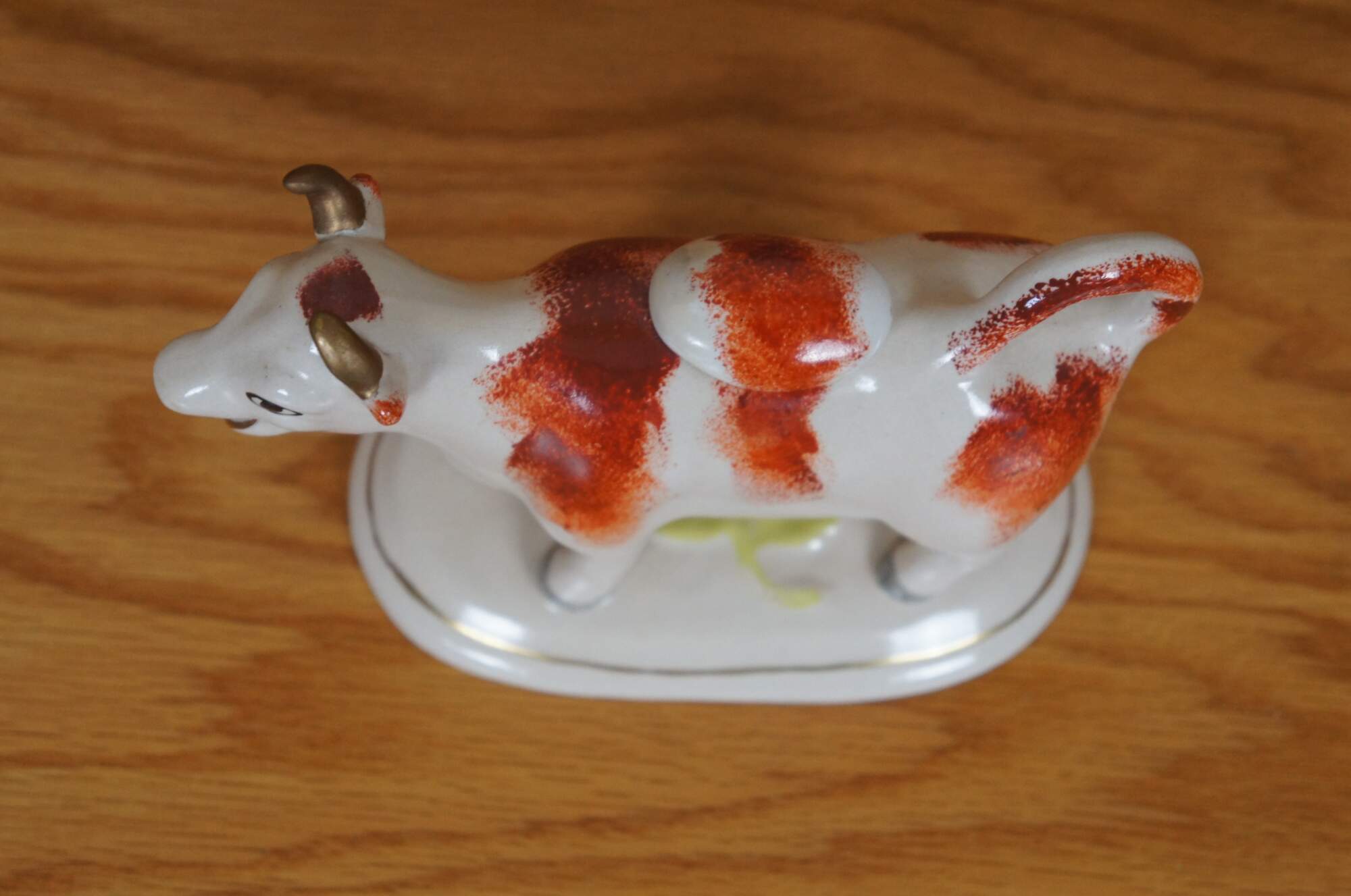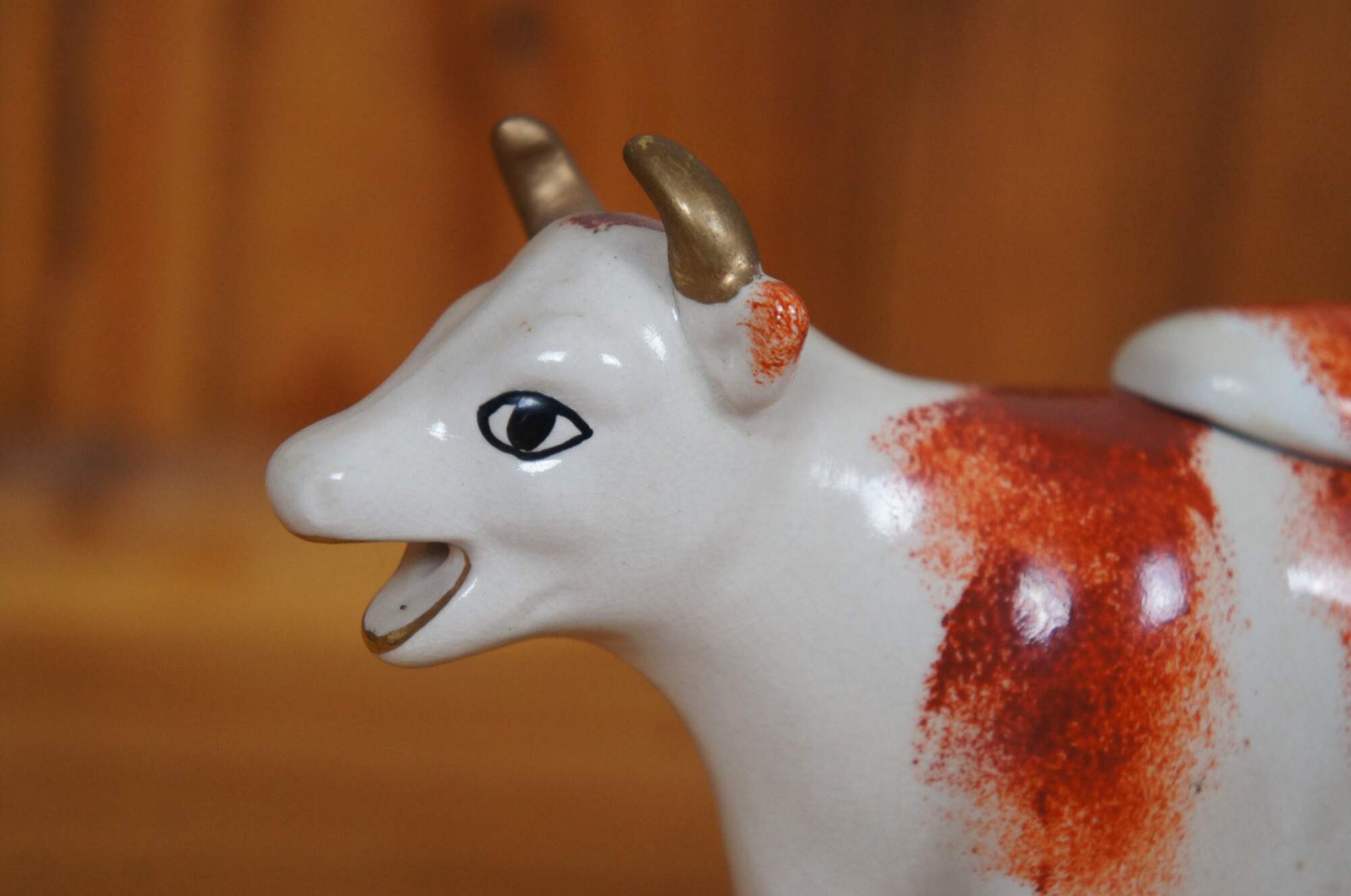 Antique 19th century Staffordshire porcelain cream pitcher in the shape of a red and white cow on an oval base, molded and painted with a yellow daisy. Tail curls to form handle. Gilt horns. Includes stopper.
