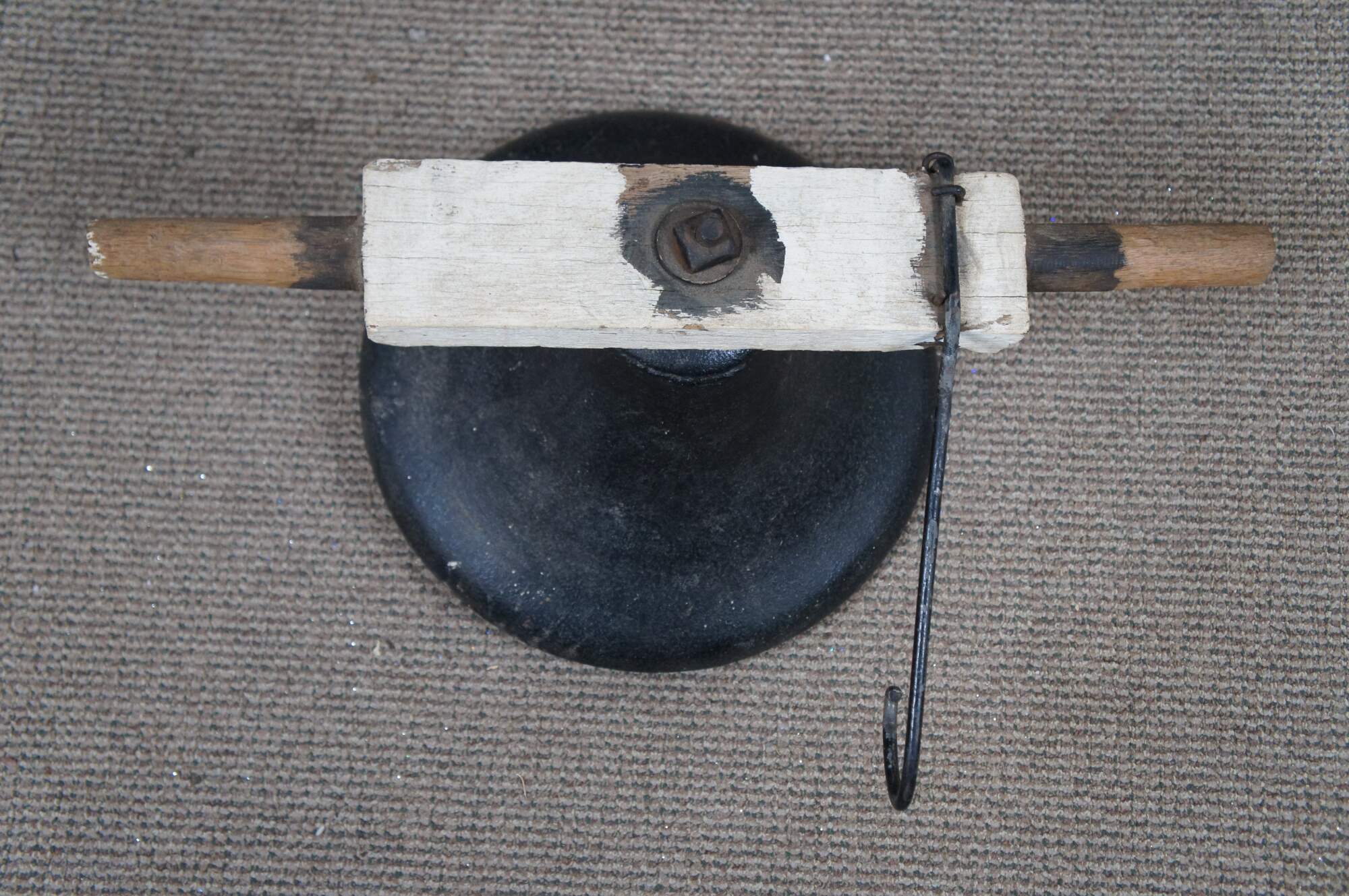 Good antique condition, wear and distressing commensurate with age and use, heavy rust, discoloration, missing yoke and crank.